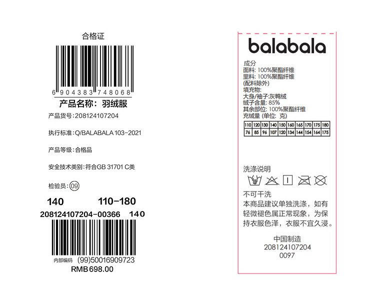 【品牌优选】巴拉巴拉童装儿童羽绒服2024新款春装冬季男女童保暖立领外套上衣