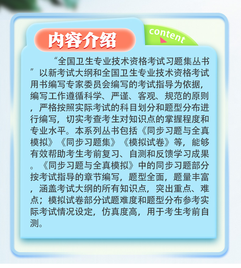 “全国卫生专业技术资格考试习题集丛书”以新考试大纲和全国卫生专业技术资格考试用书编写专家委员会编写的考试指导为依据,编写工作遵循科学、严谨、客观、规范的原则,严格按照实际考试的科目划分和题型分布进行编写,切实考查考生对知识点的掌握程度和专业水平。本系列丛书包括《同步习题与全真模拟》《同步习题集》《模拟试卷》等,能够有效帮助考生考前复习、自测和反馈学习成果。《同步习题与全真模拟》中的同步习题部分按考试指导的章节编写,题型全面,题量丰富,涵盖考试大纲的所有知识点,突出重点、难点;模拟试卷部分试题难度和题型分布参考实际考试情况设定,仿真度高,用于考生考前自测。