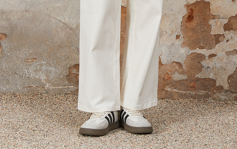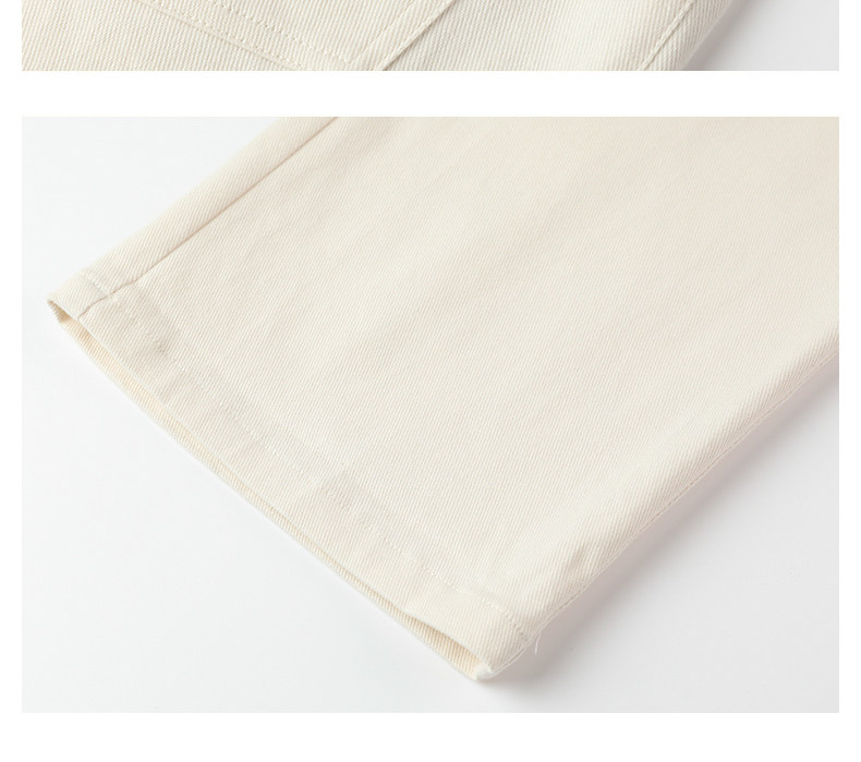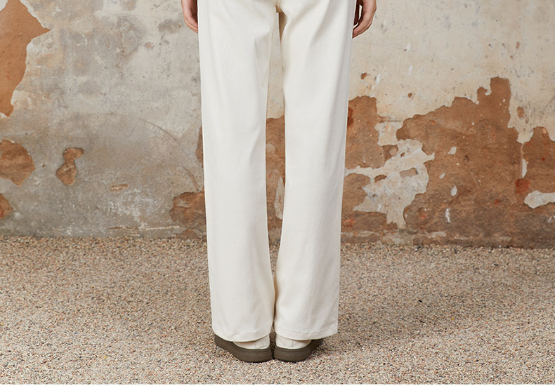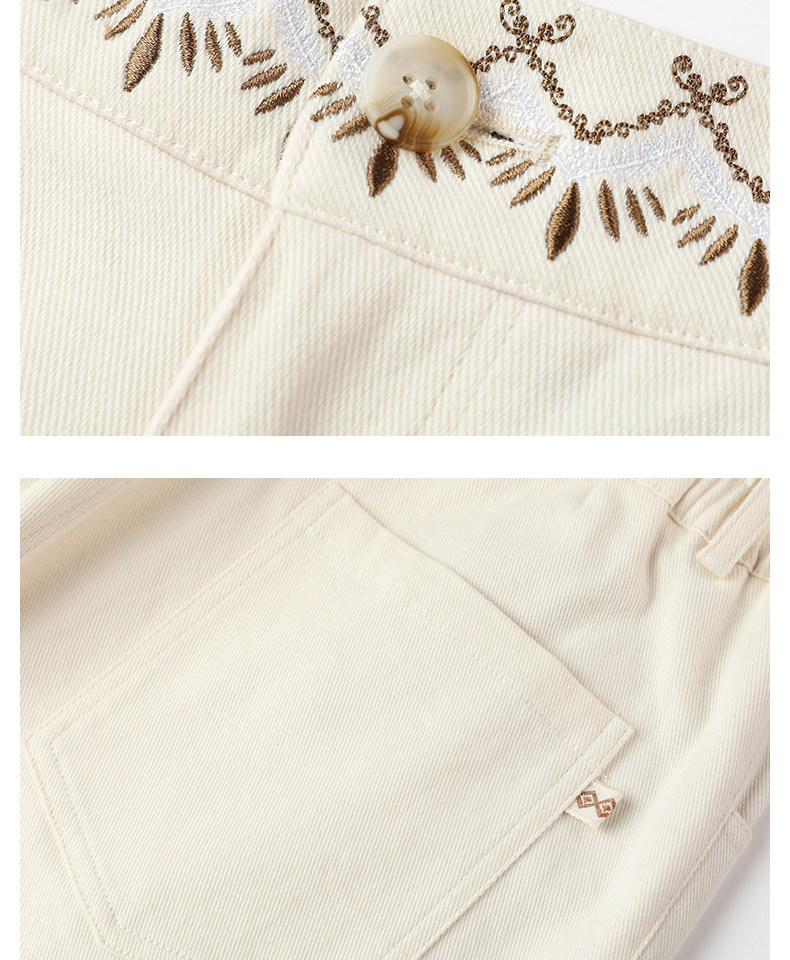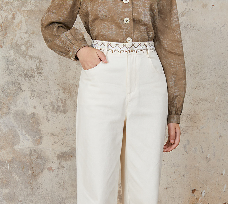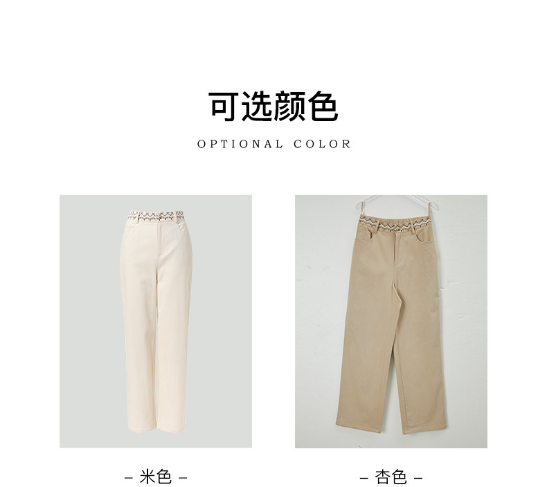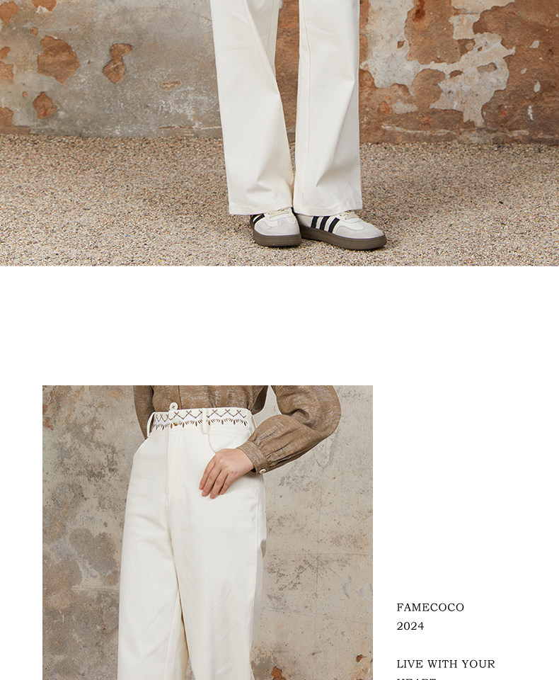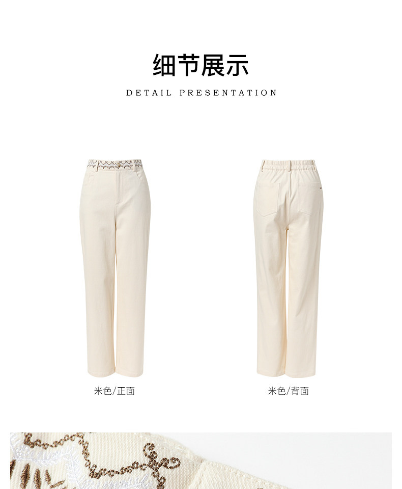 Famecoco范可儿长裤棉质设腰边设计感刺绣印花直筒裤女FAB6GA015