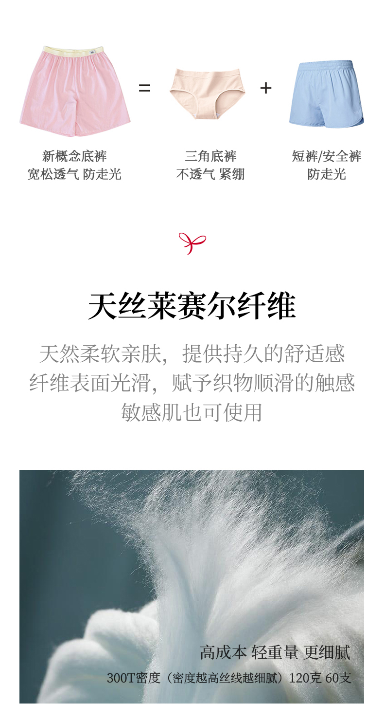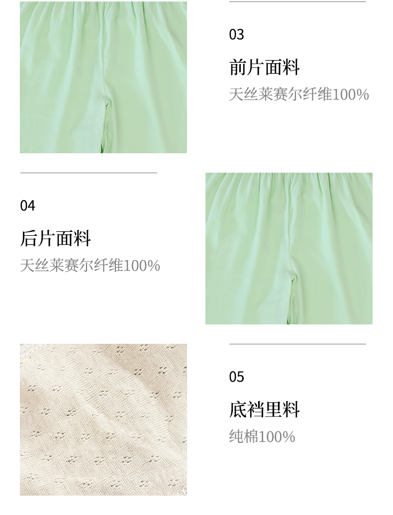 【材质】前片、后片:莱赛尔100% 底裆里料:棉100%(松紧带 氨纶13.4%、聚酯纤维86.6%)