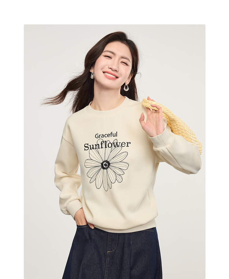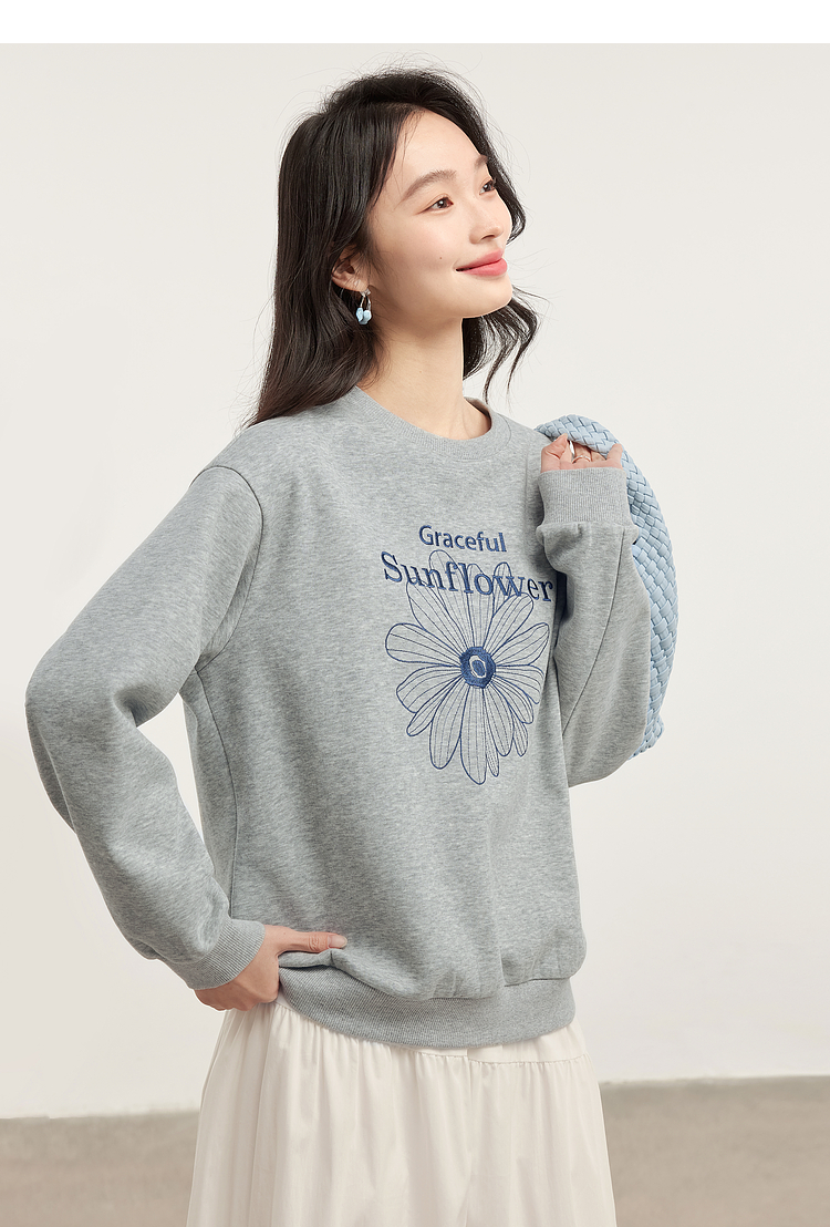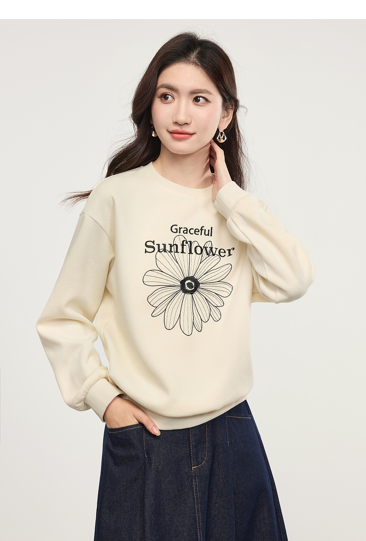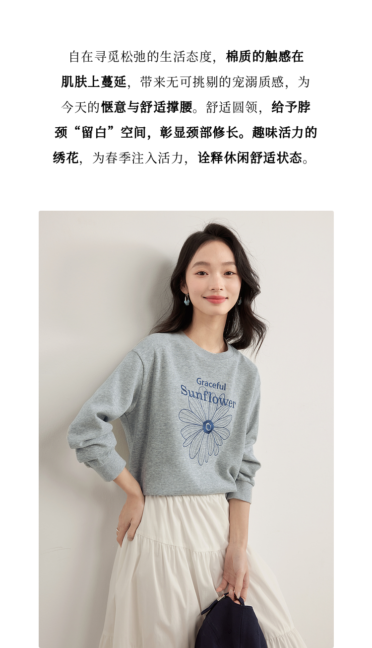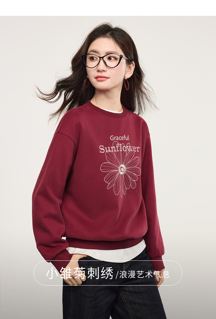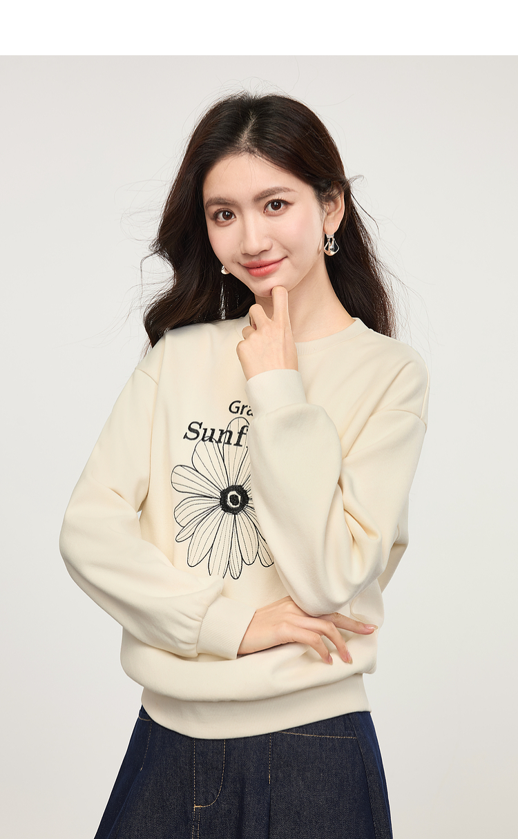 【周四狂欢价】熙世界小雏菊刺绣卫衣女慵懒风2025春秋新款休闲宽松圆领套头上衣