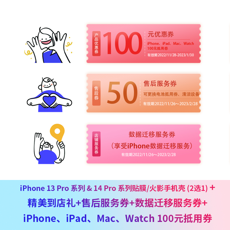 3、iPhone、iPad、Mac、Watch 100元产品抵用券、售后服务券、数据迁移服务券有效期 2022 11/26~2023 2/28;以上优惠价格对比官网价格。