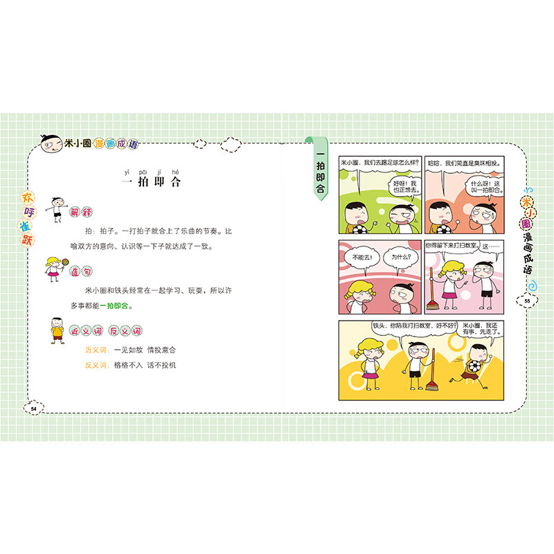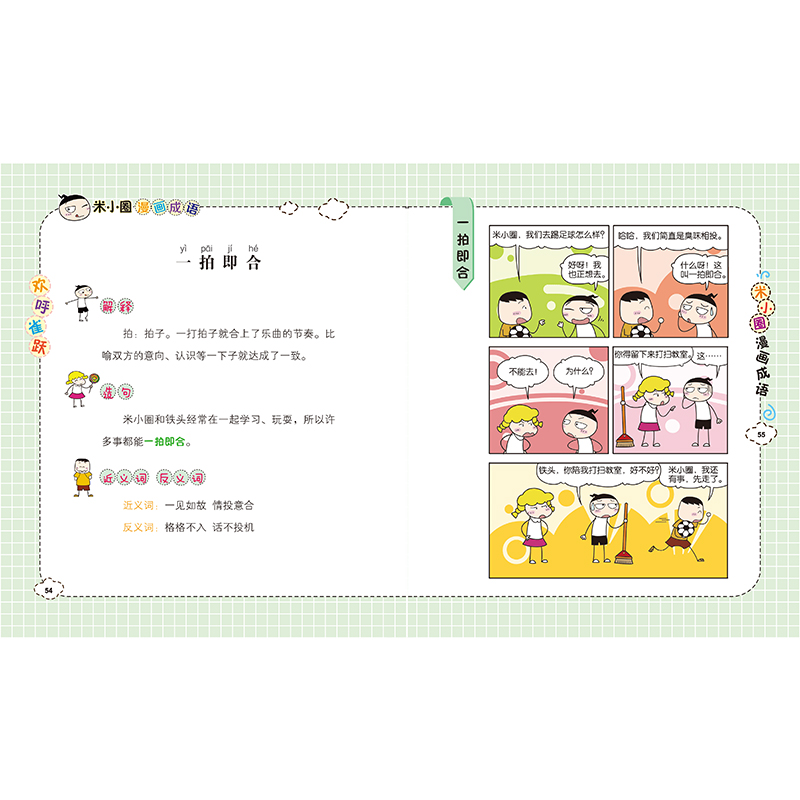 收录264个小学阶段常用成语,从成语释义、成语造句到近义词、反义词,再到成语多格漫画,多角度帮助小读者学习成语、记住成语进而运用成语。可爱的人物,幽默的漫画,易懂、准确的成语释义,让小读者和米小圈一起快乐学成语!另外,还有《米小圈漫画成语游戏·小蓝书》,看图猜成语、成语表情对对碰、成语寻宝记等多种成语游戏,边玩游戏边学成语,一起成为成语小达人吧!
