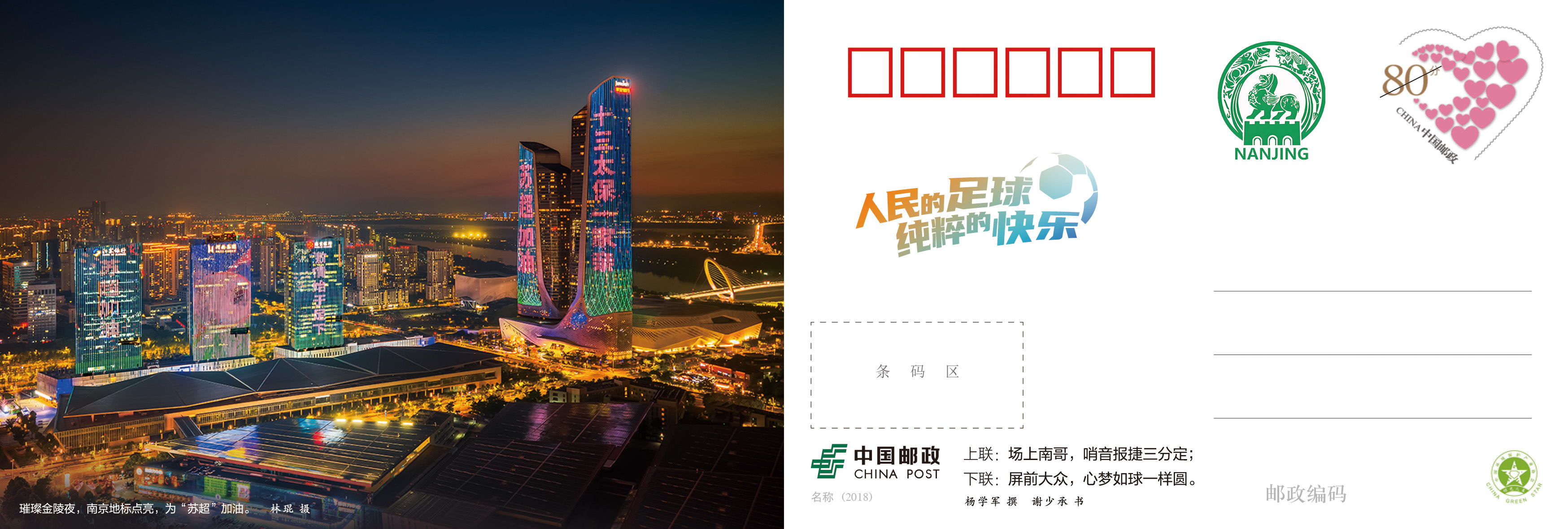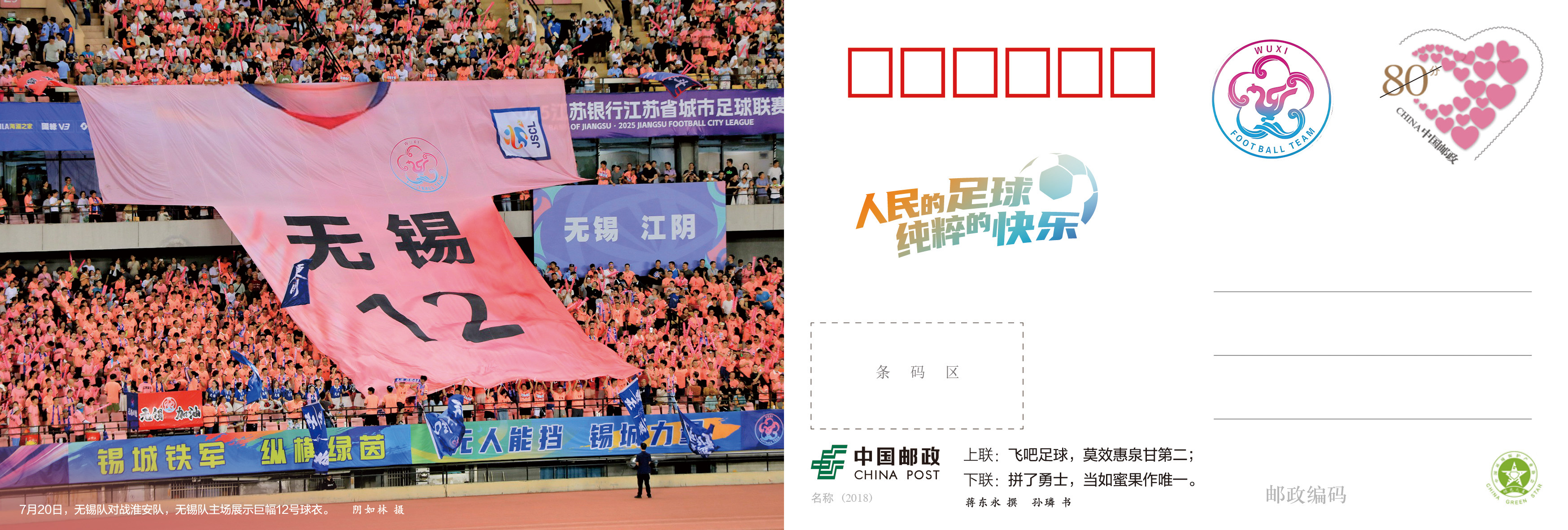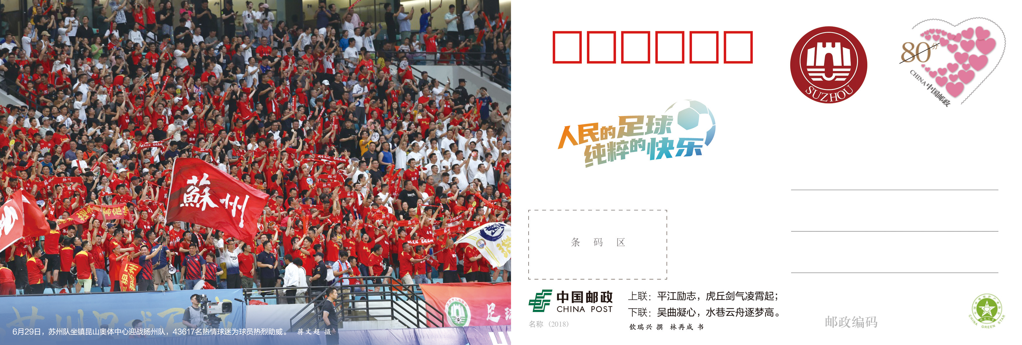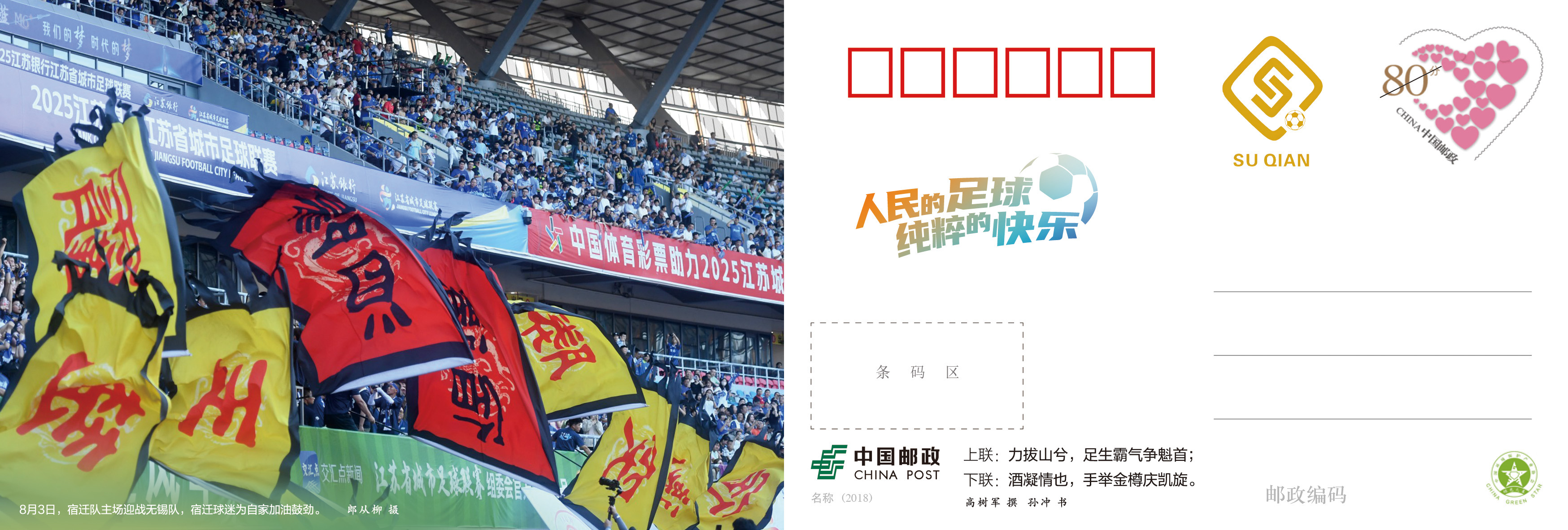 “苏超”楹联明信片每套共14枚,其中13枚分别对应江苏十三市的球队,另1枚则是对整个“苏超”赛事的礼赞。设计精美、元素丰富,每张明信片都“诚意满满”——既有全国著名书法家、楹联家为各市球队精心创作题写的助威楹联,也有活跃于“苏超”一线的摄影师定格捕捉的精彩瞬间。