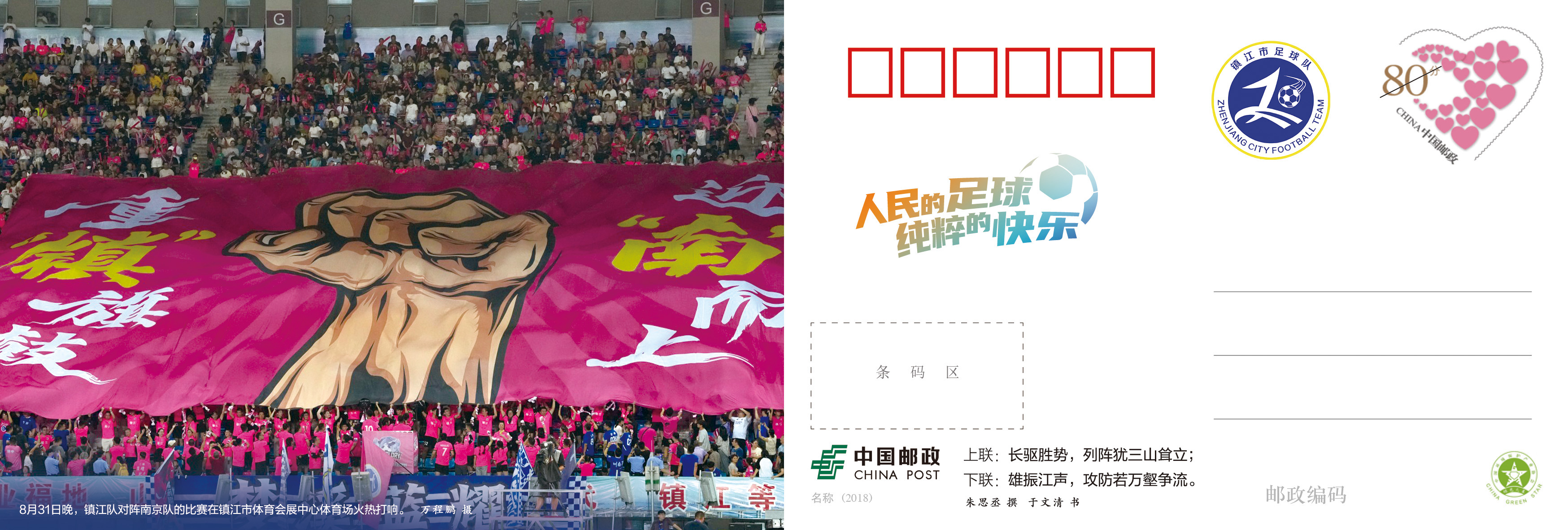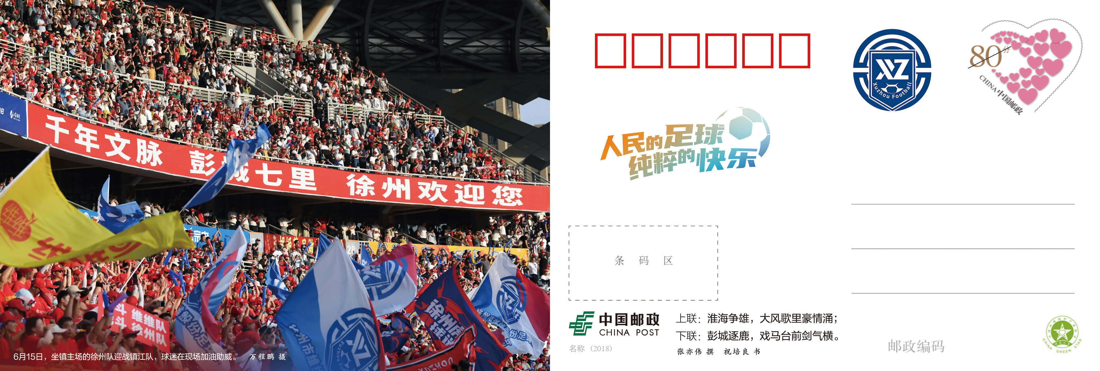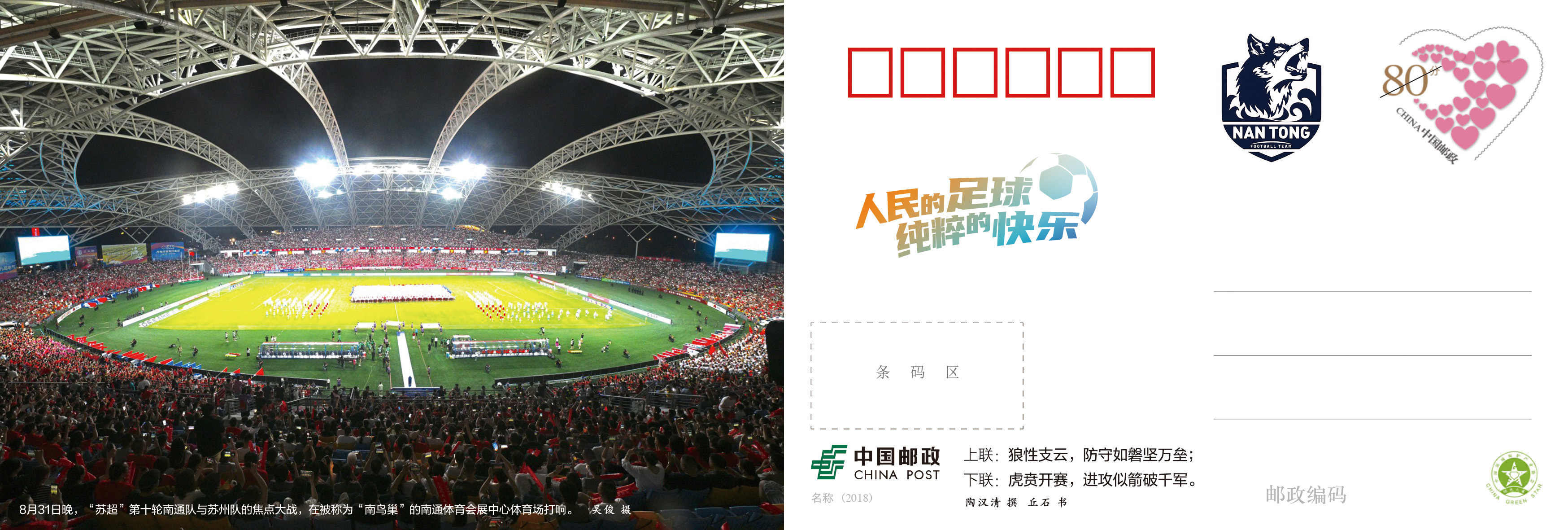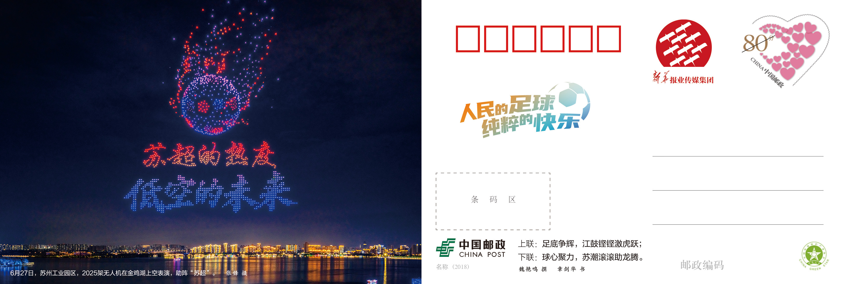 “苏超”楹联明信片每套共14枚,其中13枚分别对应江苏十三市的球队,另1枚则是对整个“苏超”赛事的礼赞。设计精美、元素丰富,每张明信片都“诚意满满”——既有全国著名书法家、楹联家为各市球队精心创作题写的助威楹联,也有活跃于“苏超”一线的摄影师定格捕捉的精彩瞬间。