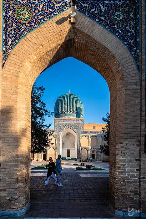 前往达沙古兹参观古特鲁克-帖木尔宣礼塔,随后前往拍摄图拉别克哈努姆陵墓。该建筑均可视为中亚地区的最完美的建筑之一。穹顶内365个细瓷部分代表一年365天,穹顶垂直下方的24个弧形代表一天24小时,下面12个较大的弧形代表一年12个月,4扇大窗户代表一个月4个星期。