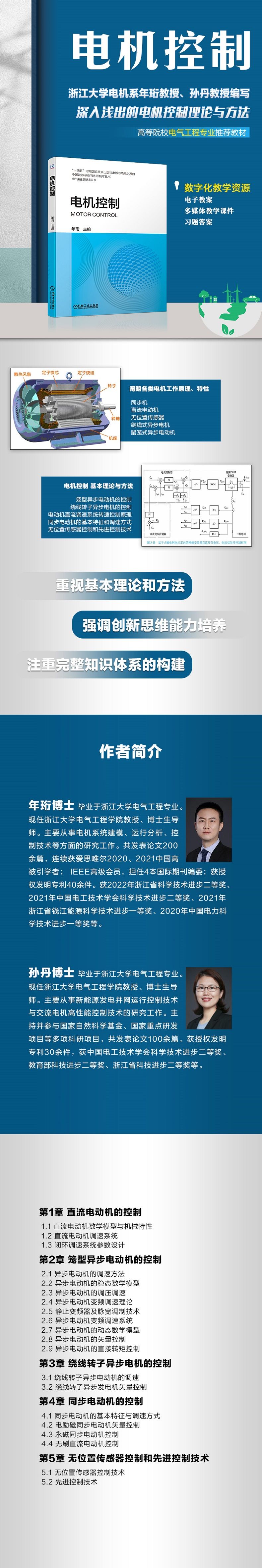一本阐明各类电机工作原理、特性及电机控制的基本理论与方法的电气精品教材根据电气工程及其自动化类专业特点和新时期教学改革要求,由浙江大学年珩教授携一流本科课程建设团队编写内容上:重视基本理论和方法,强调创新思维能力培养,注重对学生完整知识体系的构建一方面用新的知识和技术来提升学科和教材的内涵;另一方面,采用成熟的新技术使得教材的配套资源数字化和多样化。特色:1.由浙江大学年珩教授领衔一流本科课程建设团队编写,内容依托国家自然科学基金项目和多项国家自然科学基金项目,以及国家重点研发计划等高水平研究项目。2.重视配套,提供了丰富的数字化教学资源(与纸质教材配套的电子教案、多媒体教学课件、微课等数字化出版物),与核心课程教材相配套的习题集及答案、模拟试题,具有通用性、有特色的实验指导等。