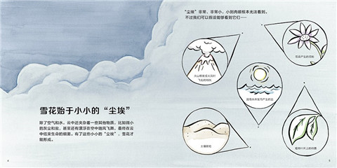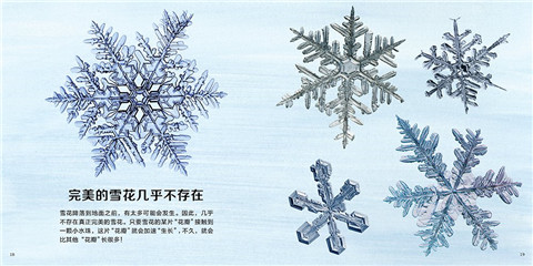 这是一本用照片展示雪花秘密的自然科学绘本。雪花,是北方的冬天很常见的东西。《雪花的故事》通过照片展示出雪花各种各样的形态,还揭示出雪花形成的原因、雪花变化的过程等,而且,还给小朋友提供了观察雪花的简便的方法,将知识与实践相结合。《雪花的故事》在设计上尽量展示出冬天的特点——专色印刷呈现出如冬日天空般的色调,封面局部UV呈现出雪花优雅的美丽。全书设计简洁干净,与雪花之美高度契合。是一本兼具自然知识与艺术气息的精美绘本。