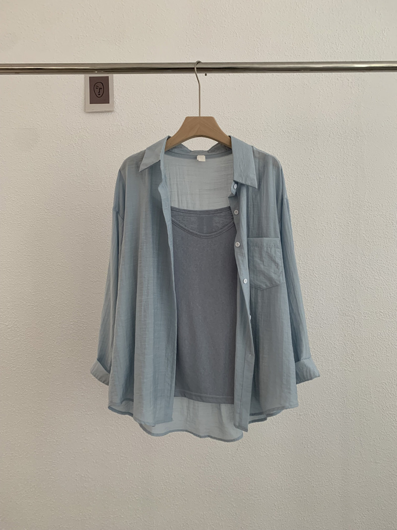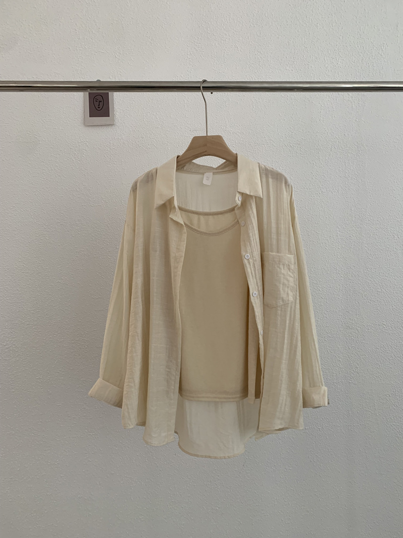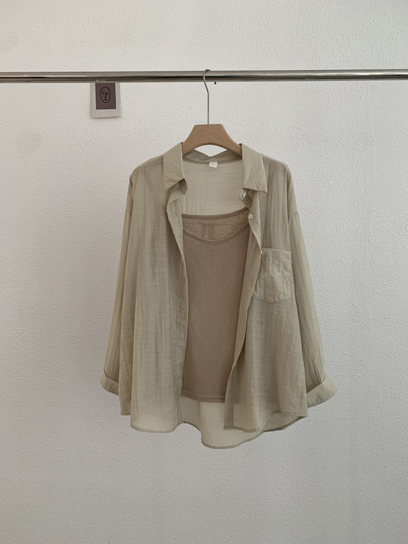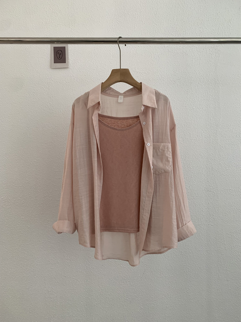 【宽松版型舒适、纯色设计百搭】夏季薄款翻领长袖纯色宽松衬衫吊带上衣TA