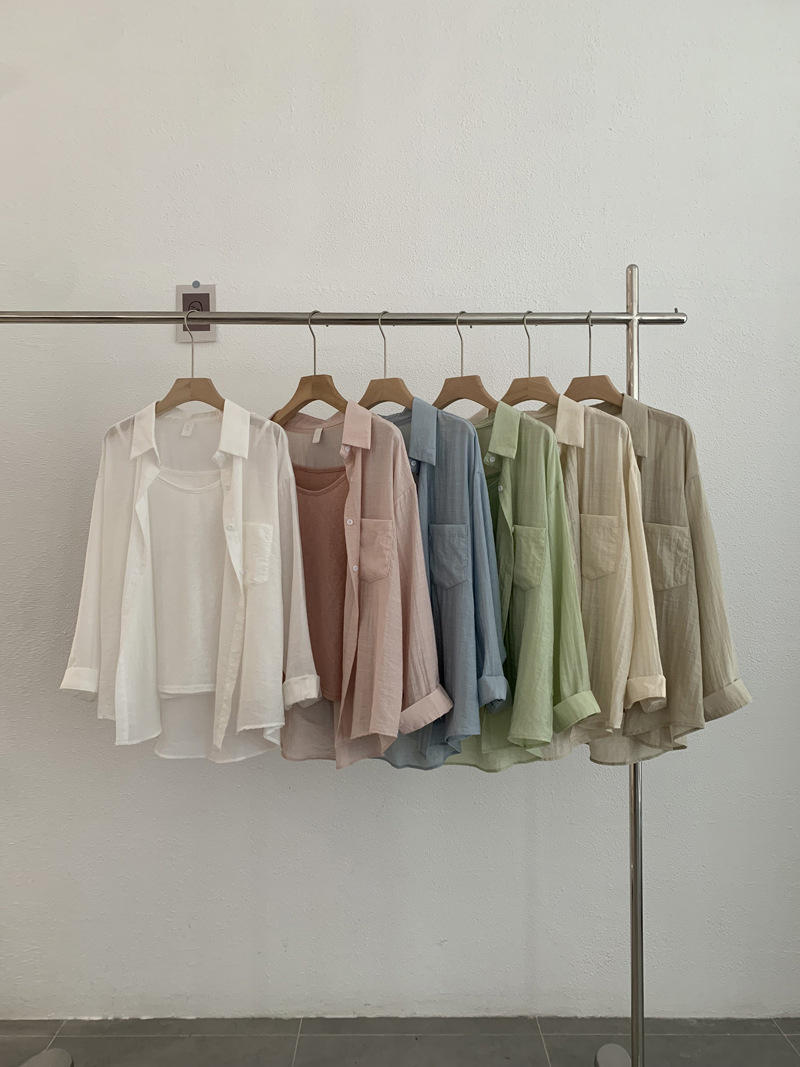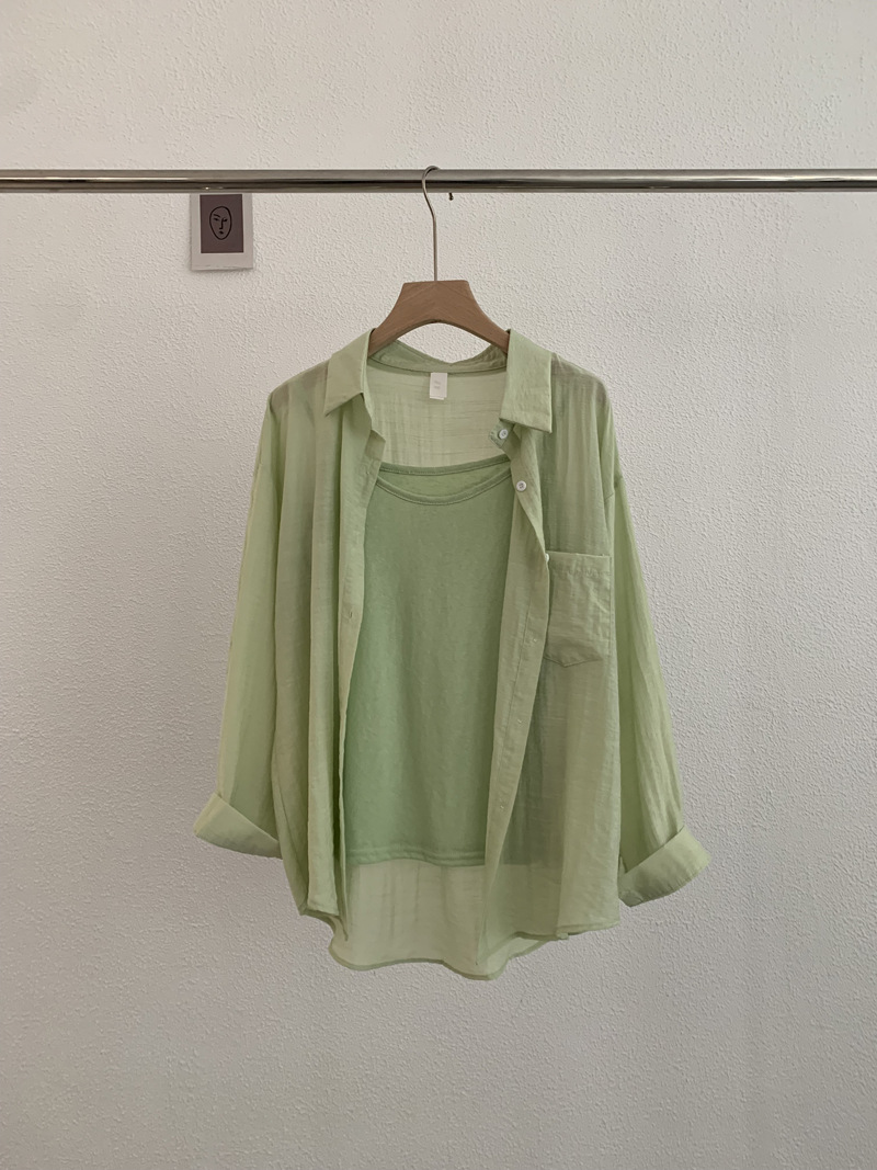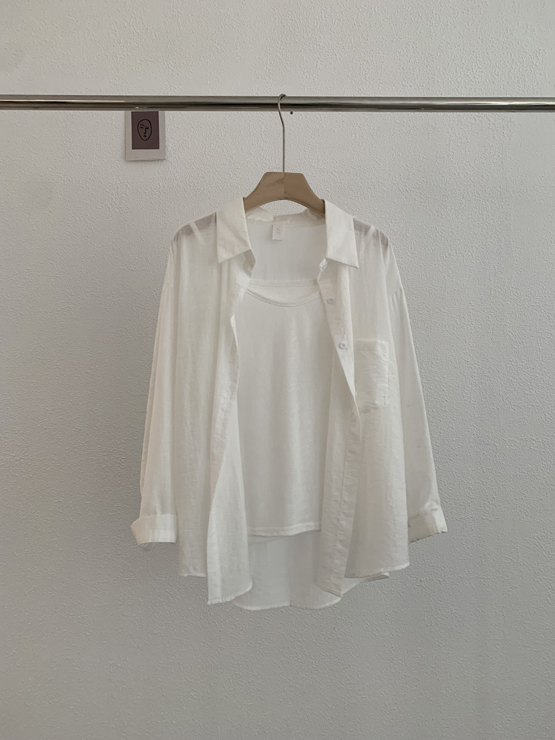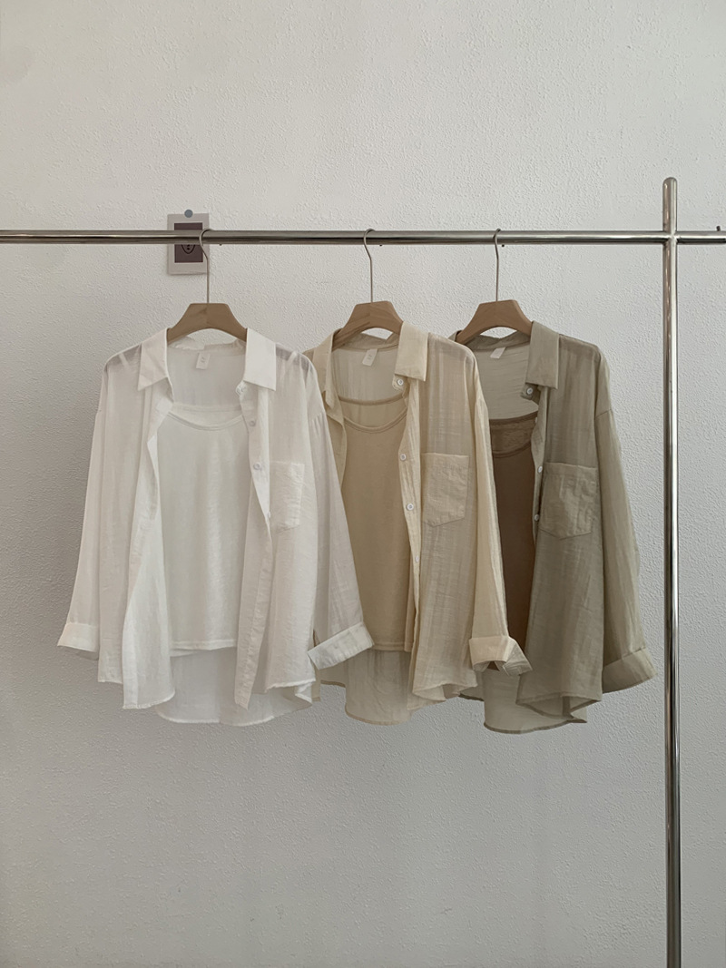 【宽松版型舒适、纯色设计百搭】夏季薄款翻领长袖纯色宽松衬衫吊带上衣TA