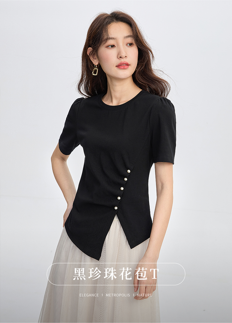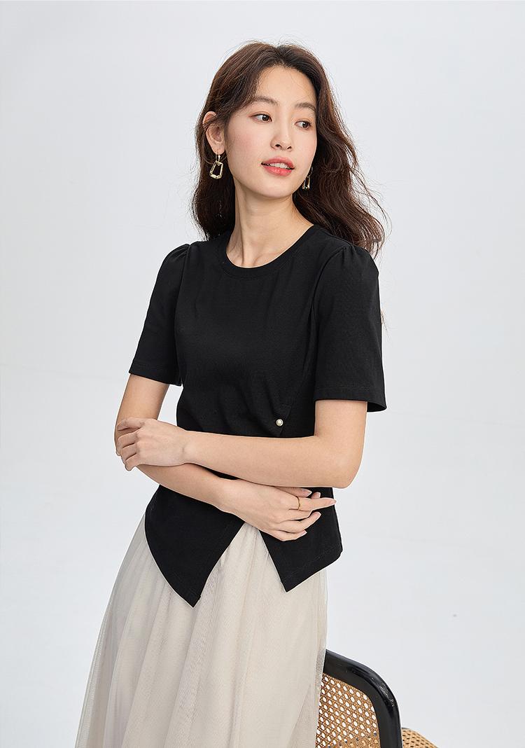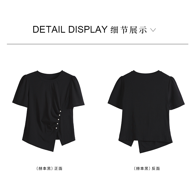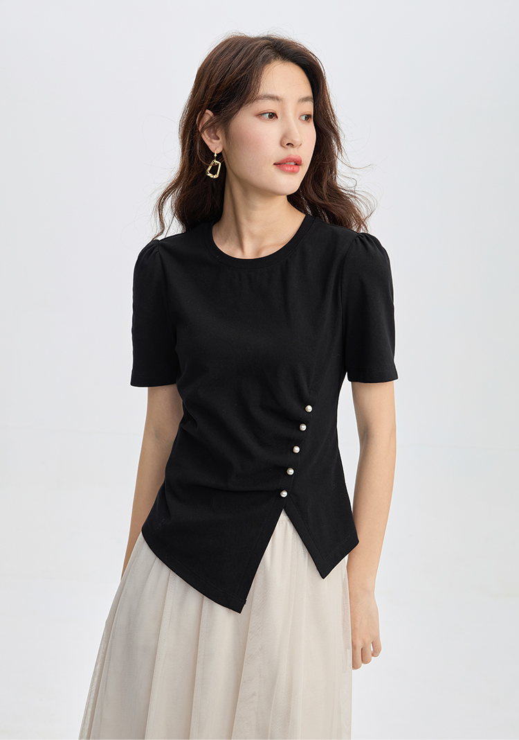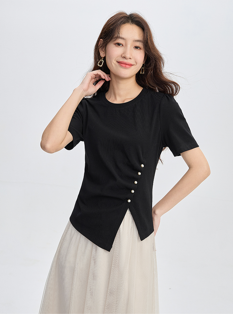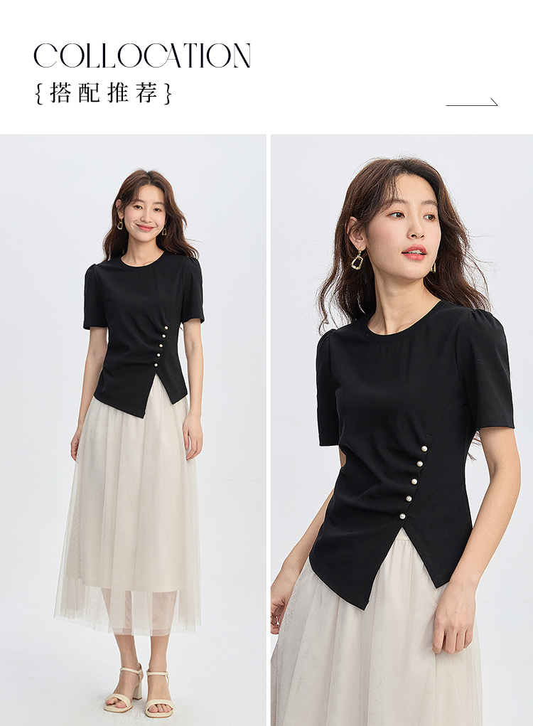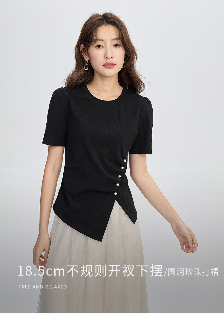 【专属特价】熙世界黑色不规则开叉短袖T恤女2025夏新款时尚洋气正肩显瘦上衣