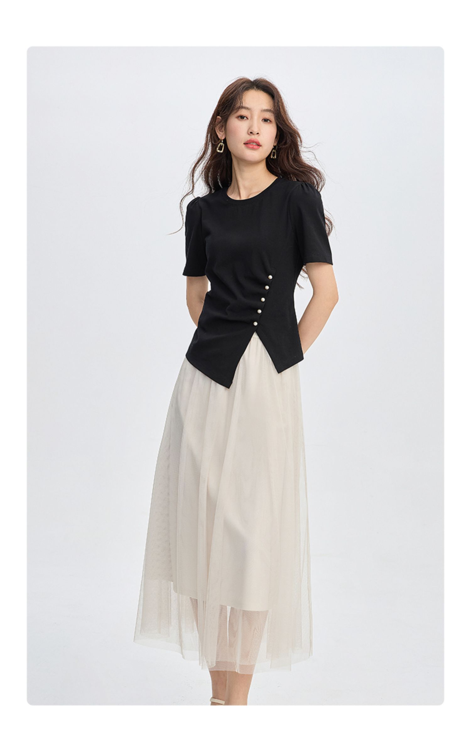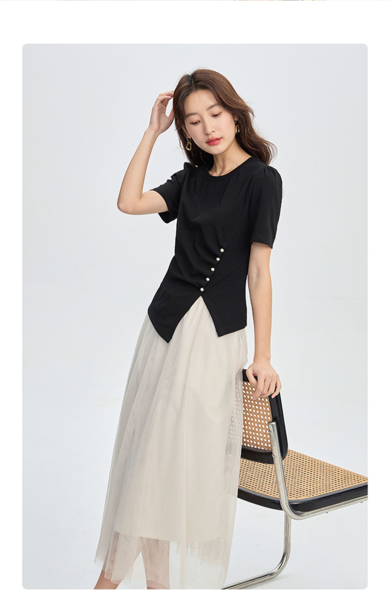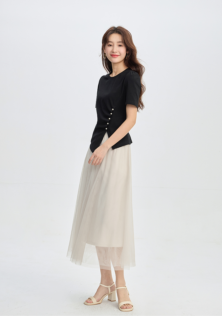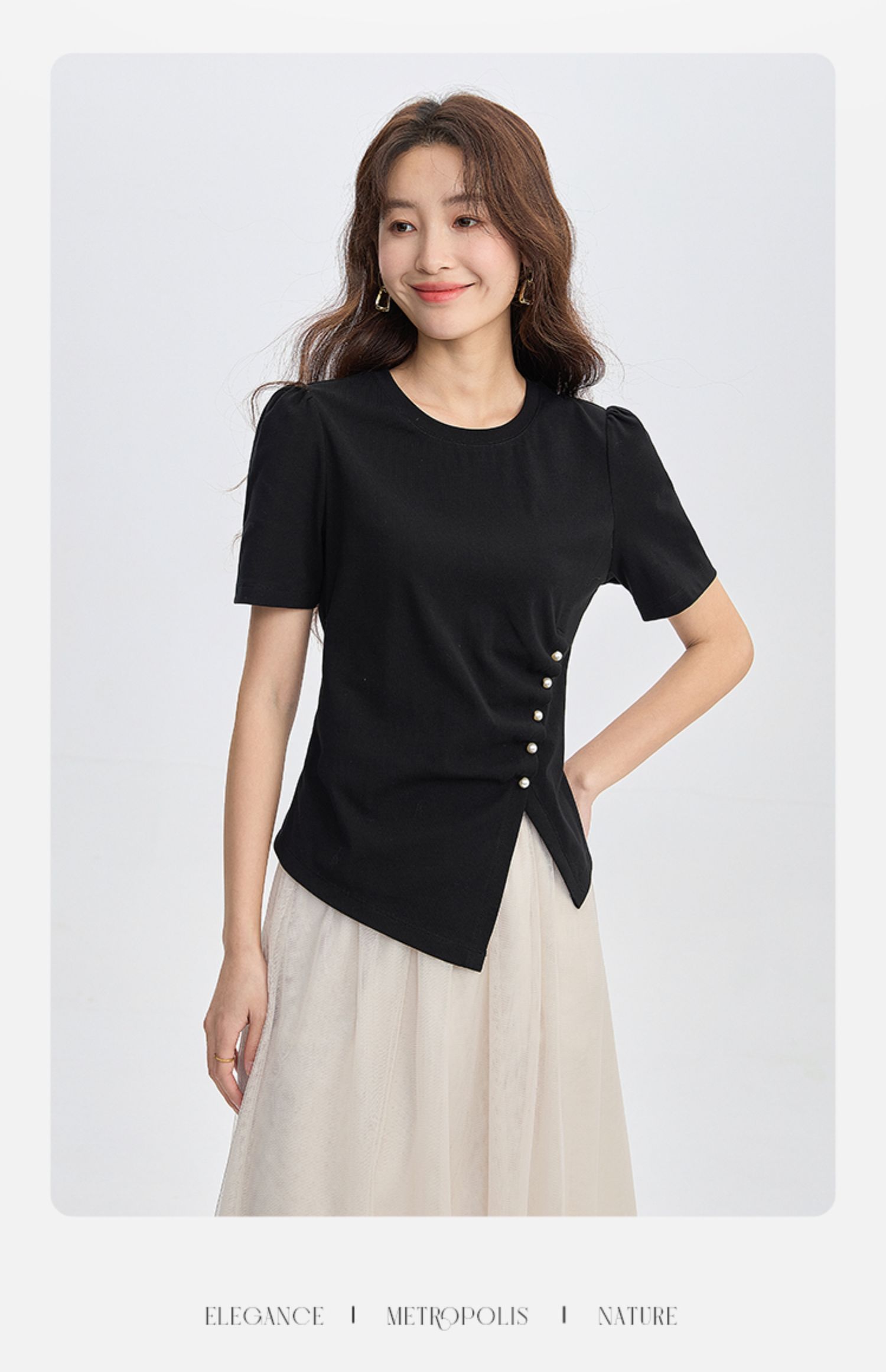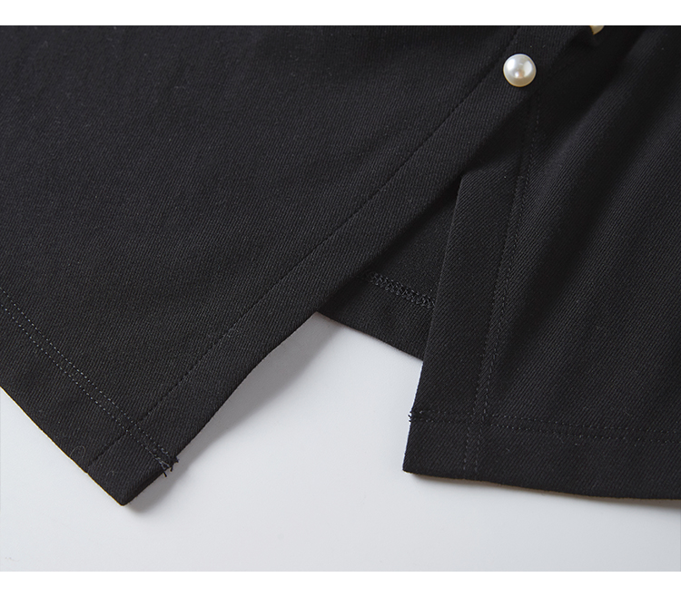【专属特价】熙世界黑色不规则开叉短袖T恤女2025夏新款时尚洋气正肩显瘦上衣