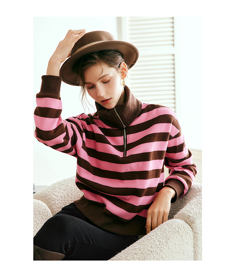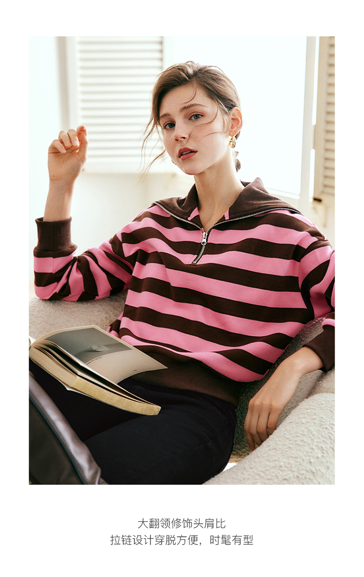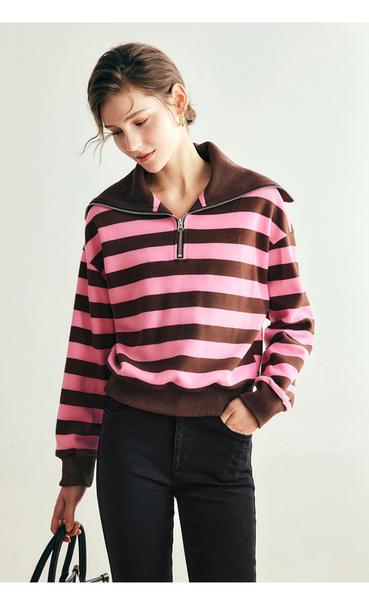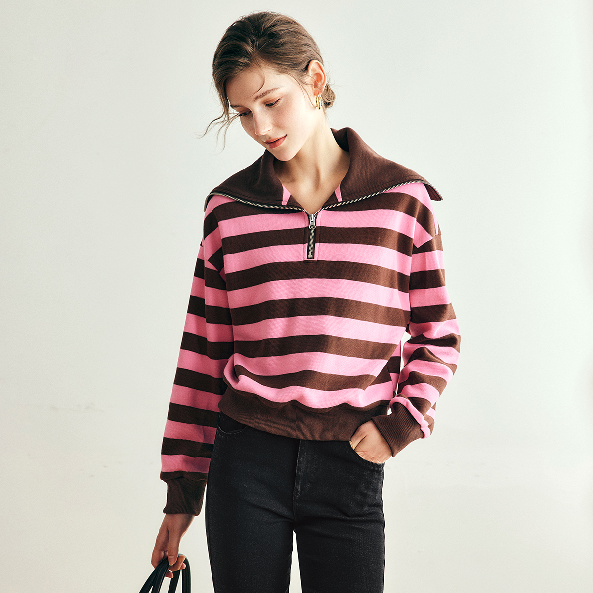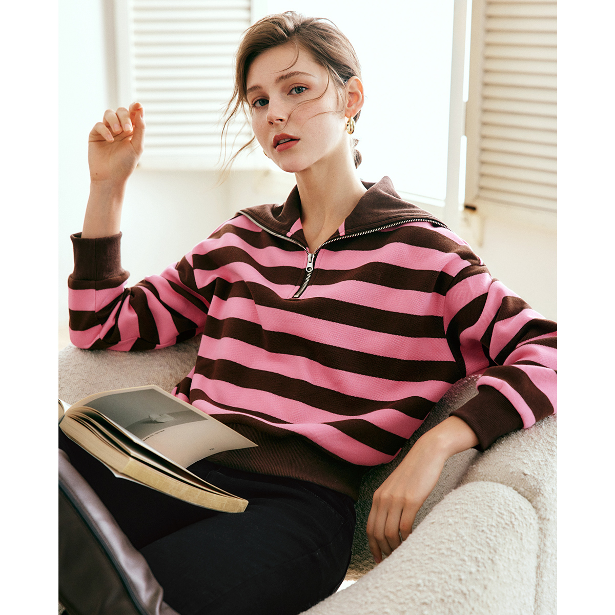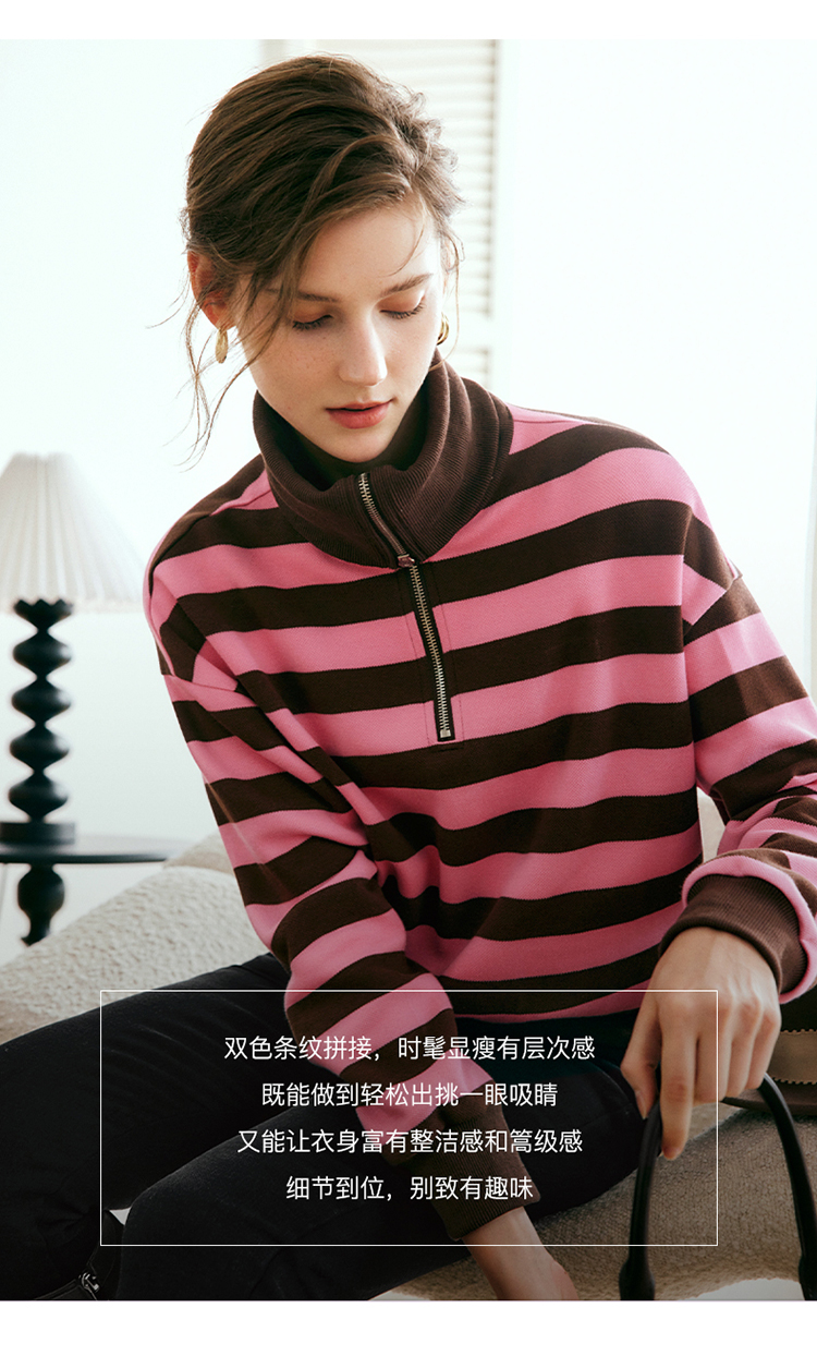 OLrain欧芮儿法式半拉链条纹卫衣女秋冬大翻领套头上衣