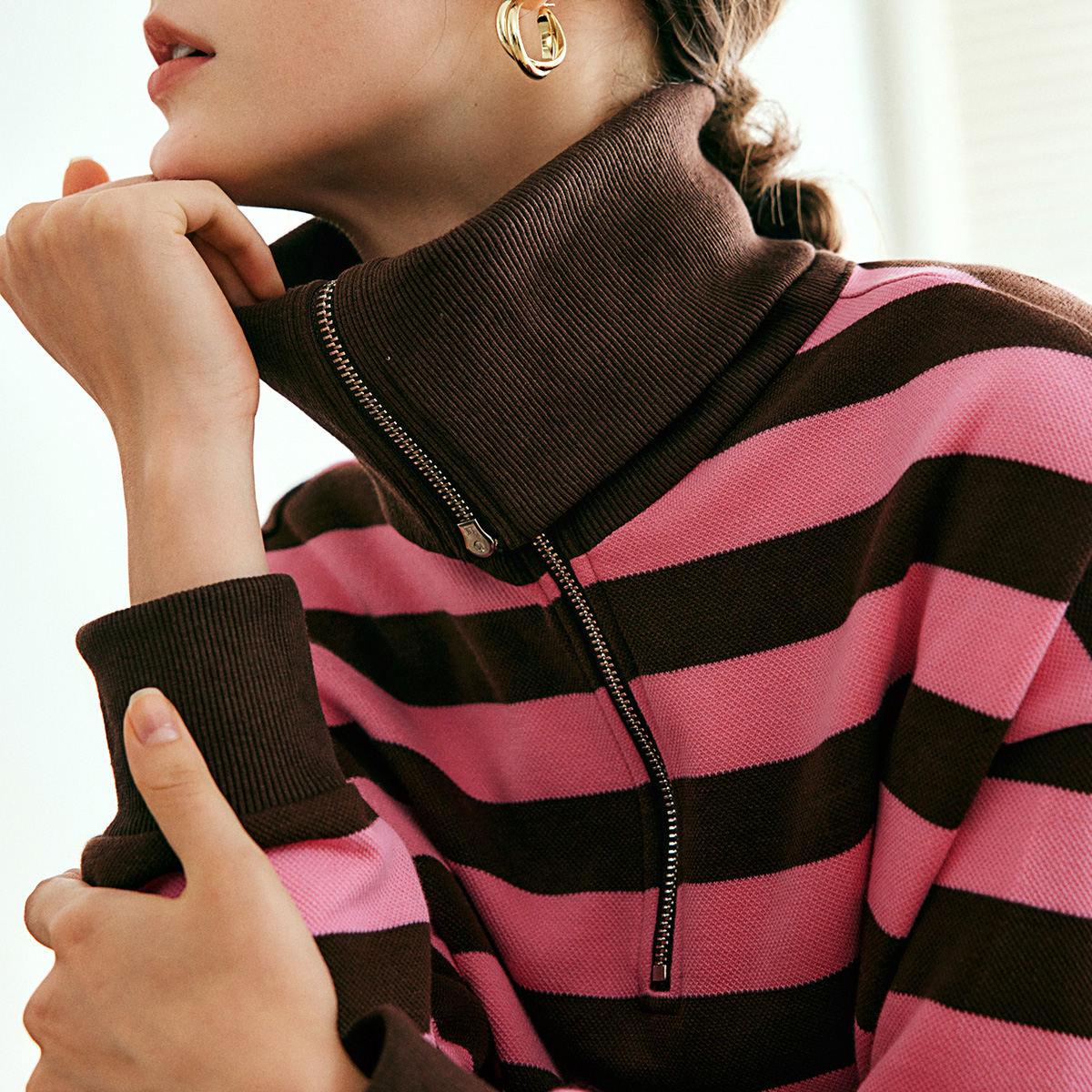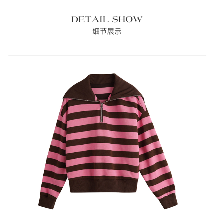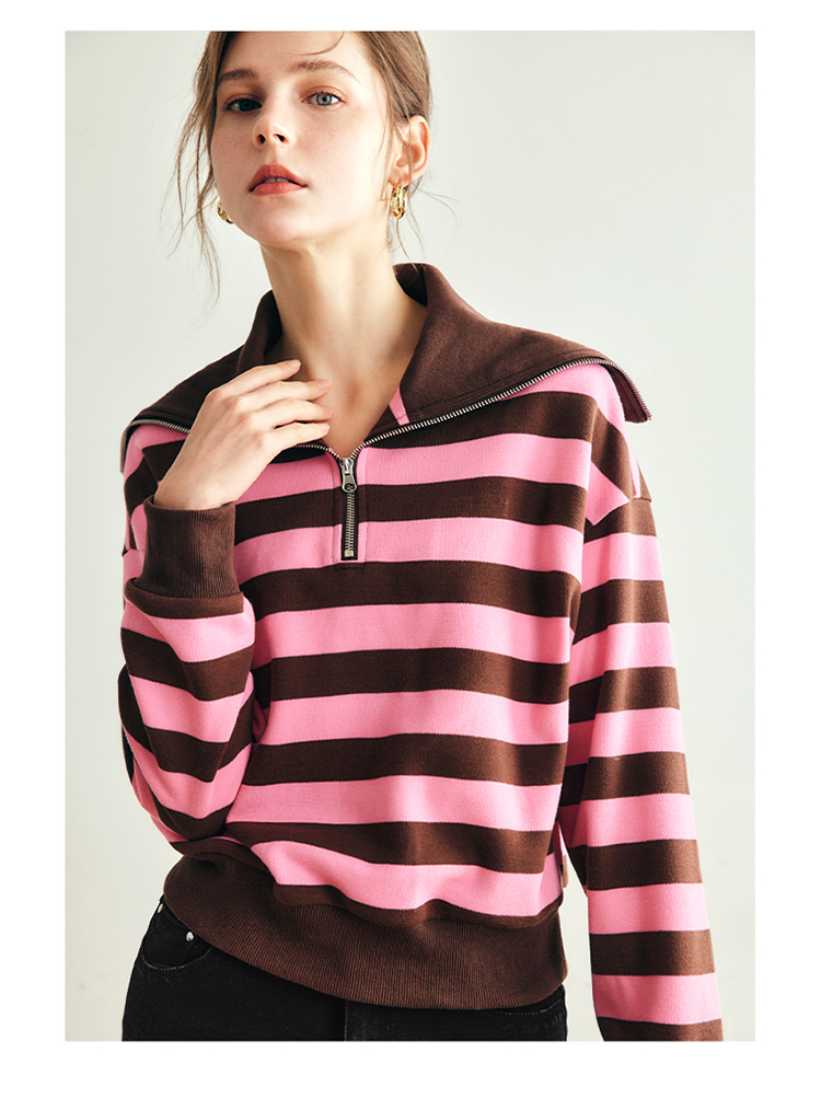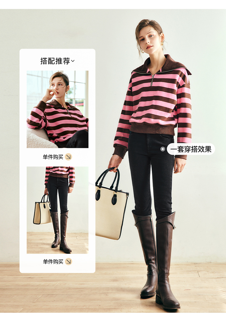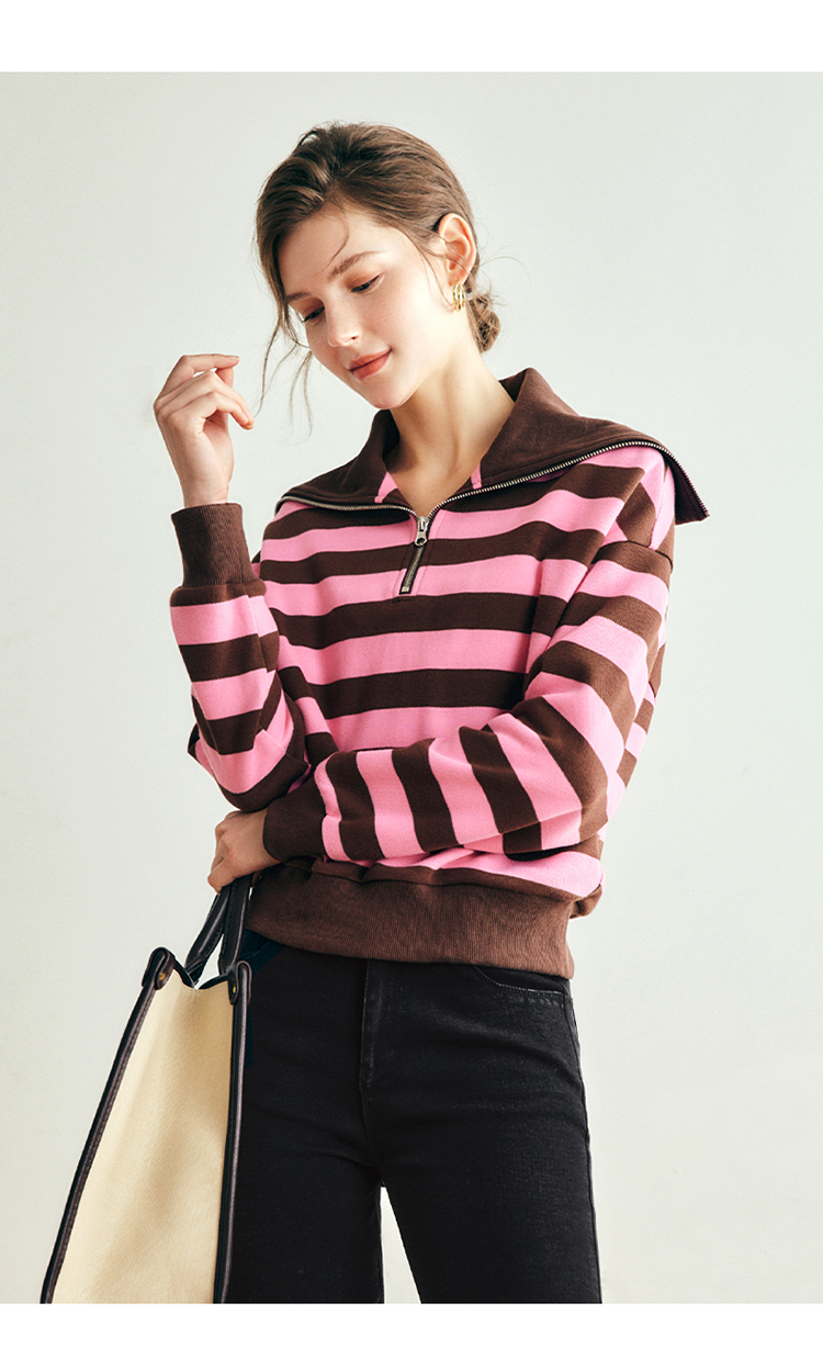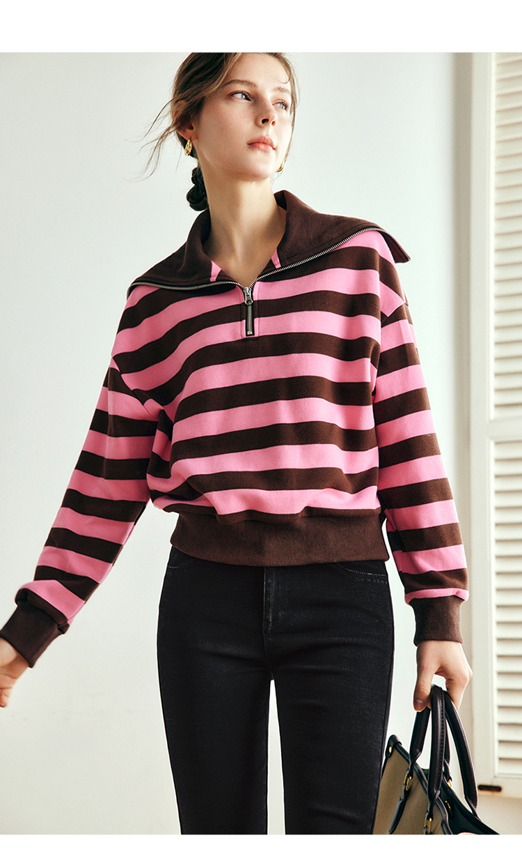 OLrain欧芮儿法式半拉链条纹卫衣女秋冬大翻领套头上衣