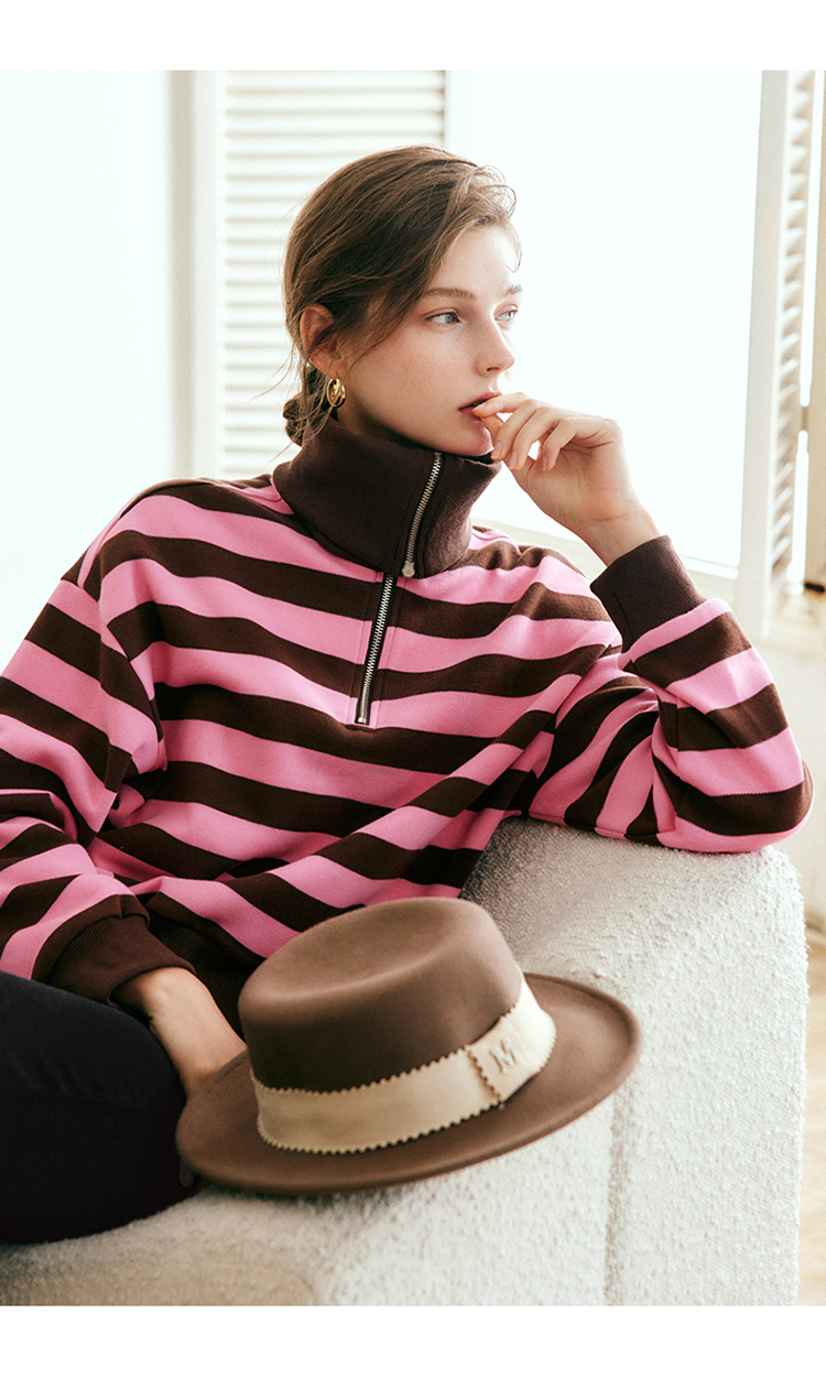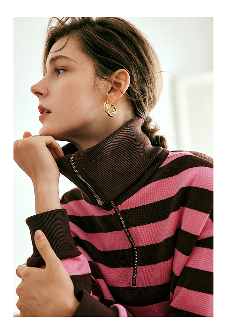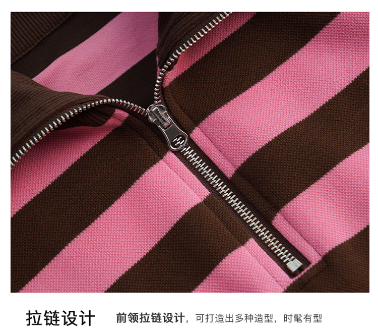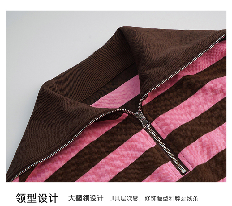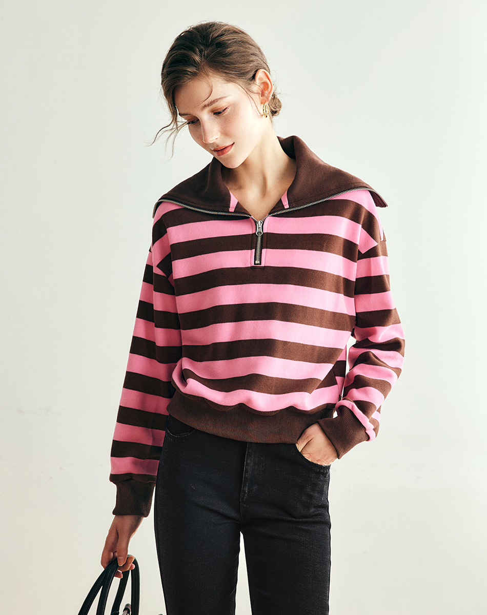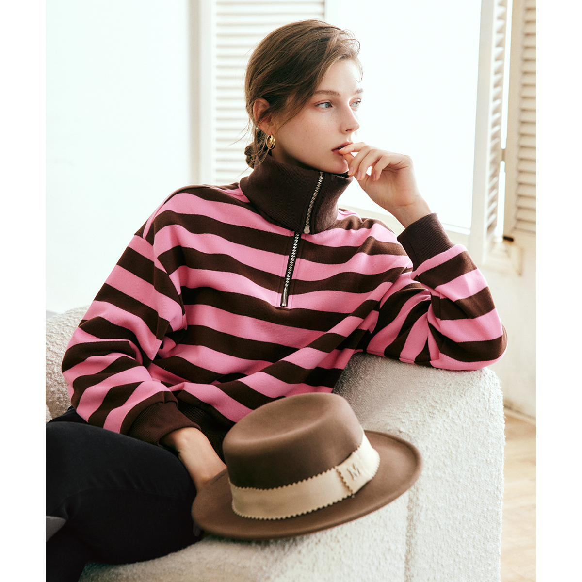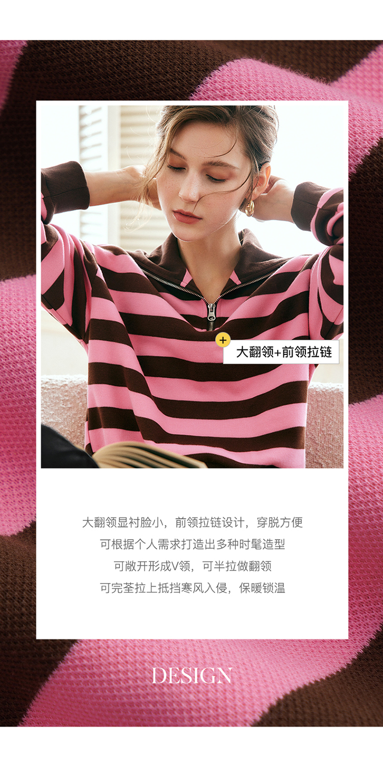 OLrain欧芮儿法式半拉链条纹卫衣女秋冬大翻领套头上衣