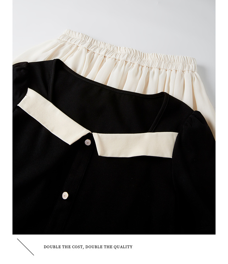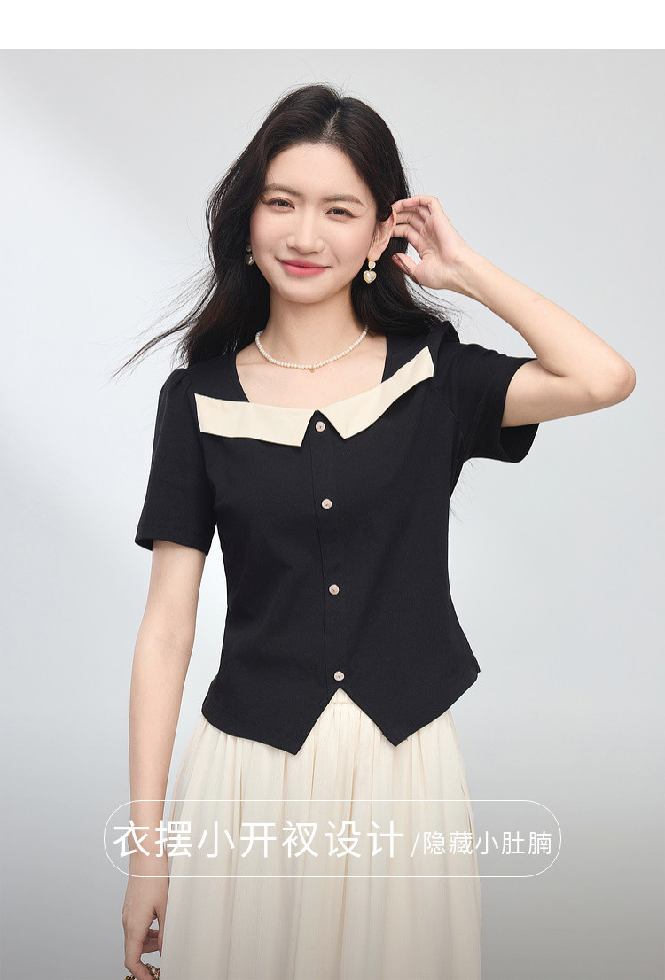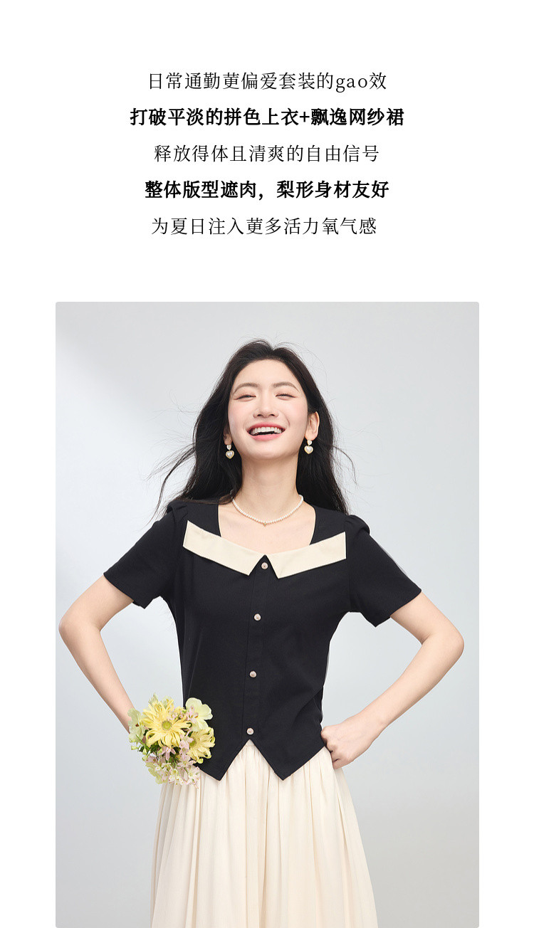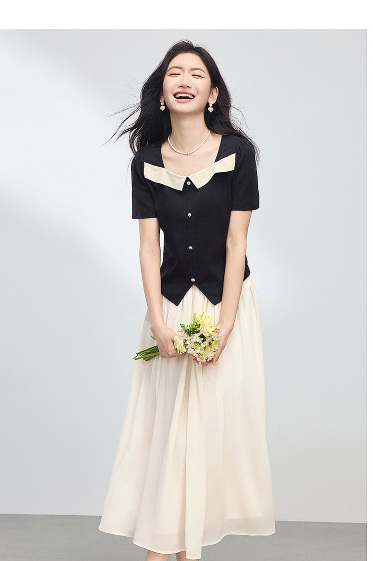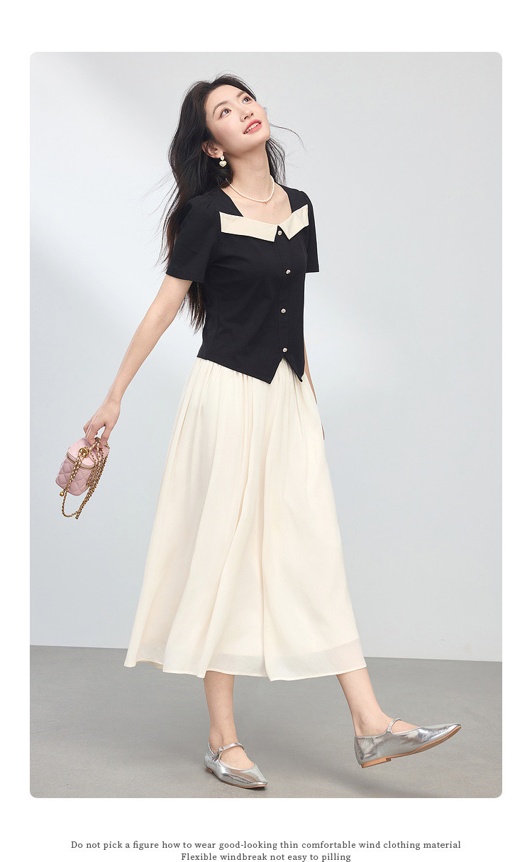 【专属特价】熙世界小香风套装开衩下摆拼色方领T恤上衣+简约半身裙两件套女2025新款
