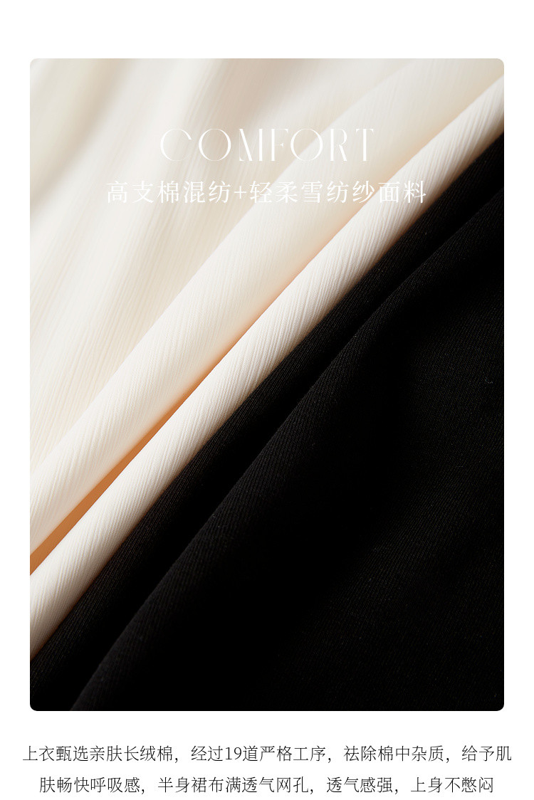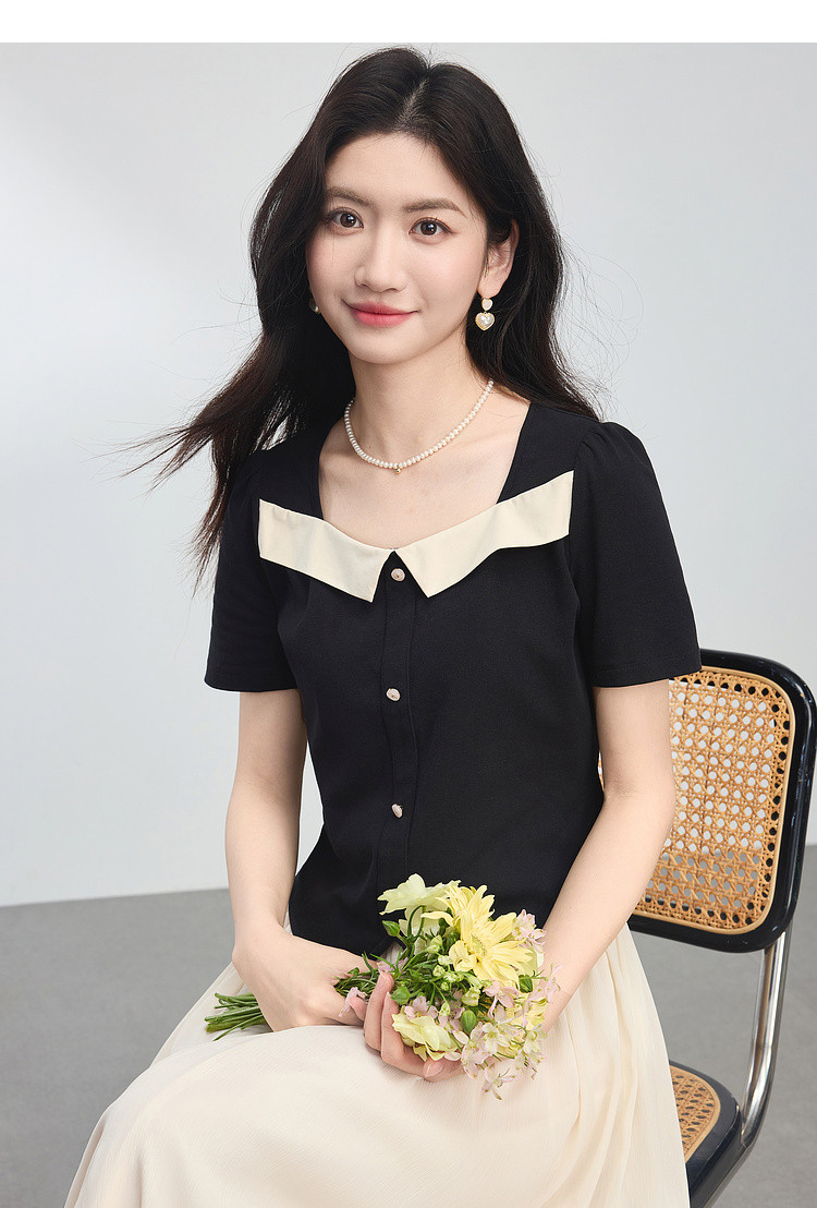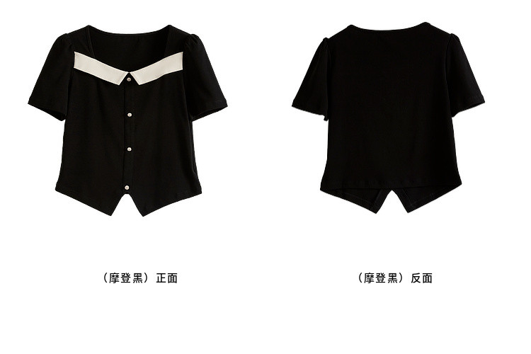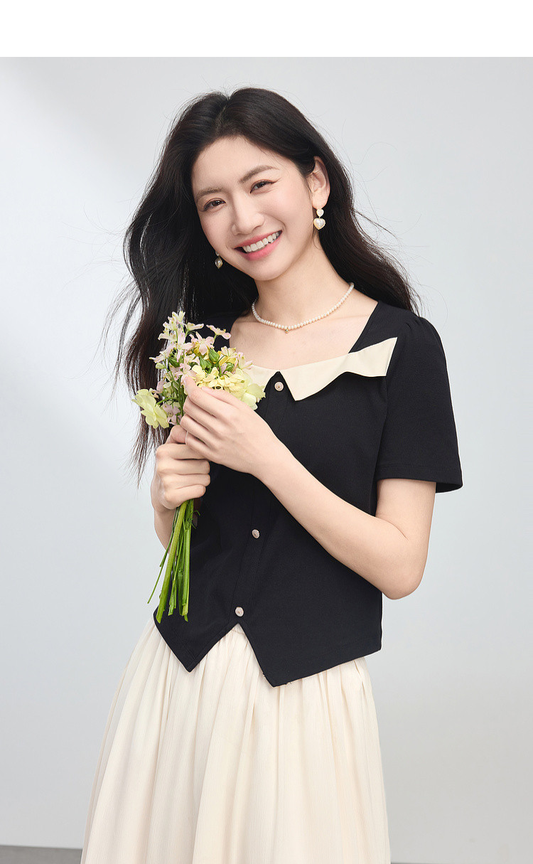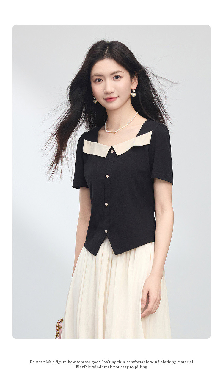 【专属特价】熙世界小香风套装开衩下摆拼色方领T恤上衣+简约半身裙两件套女2025新款