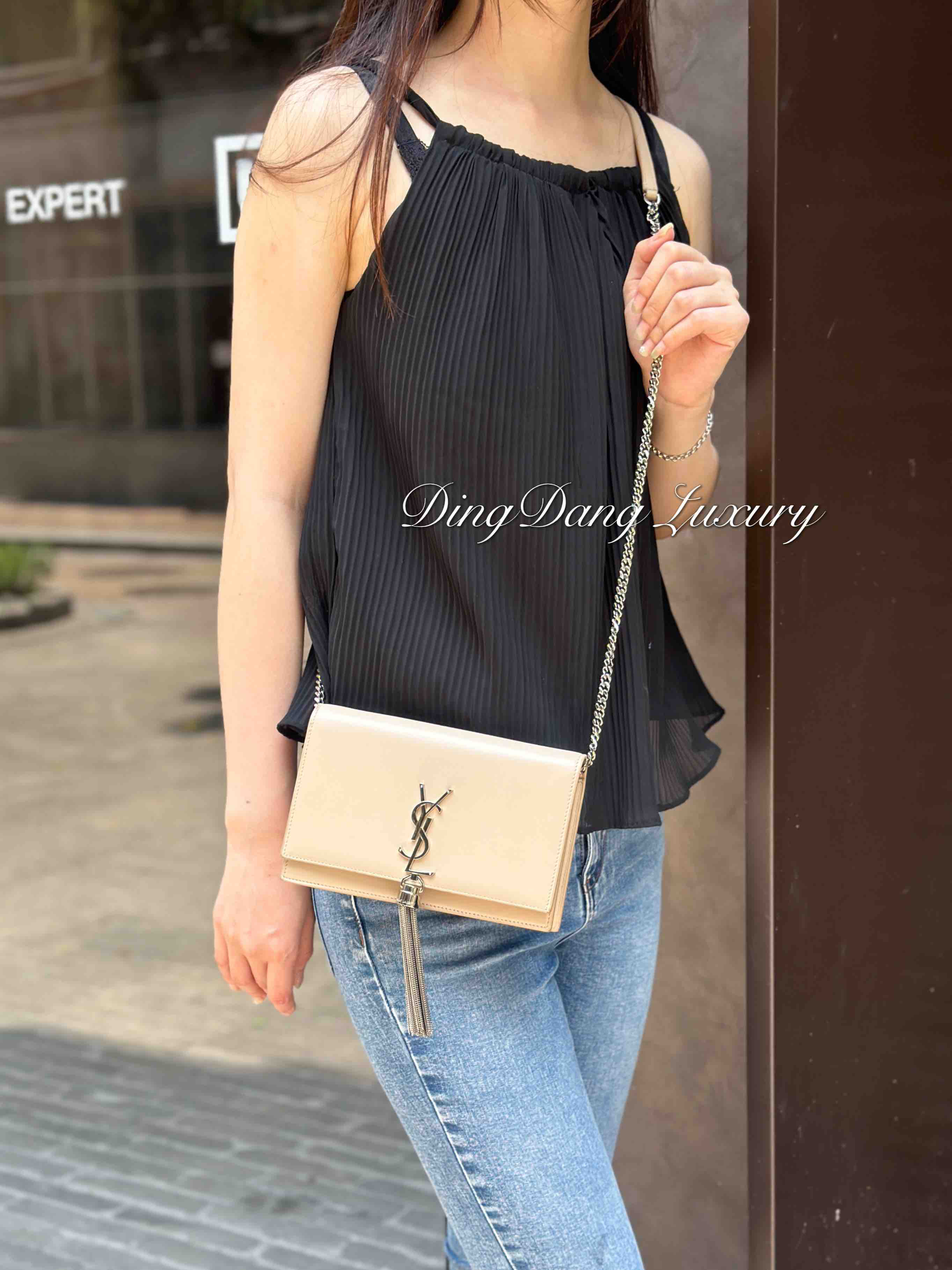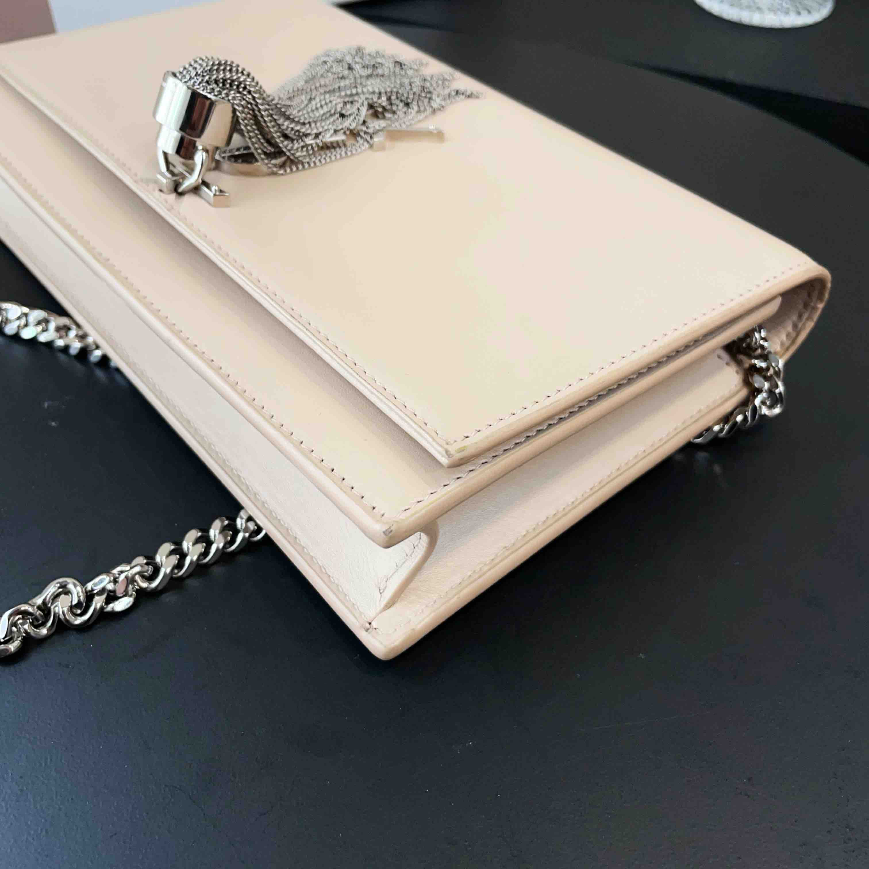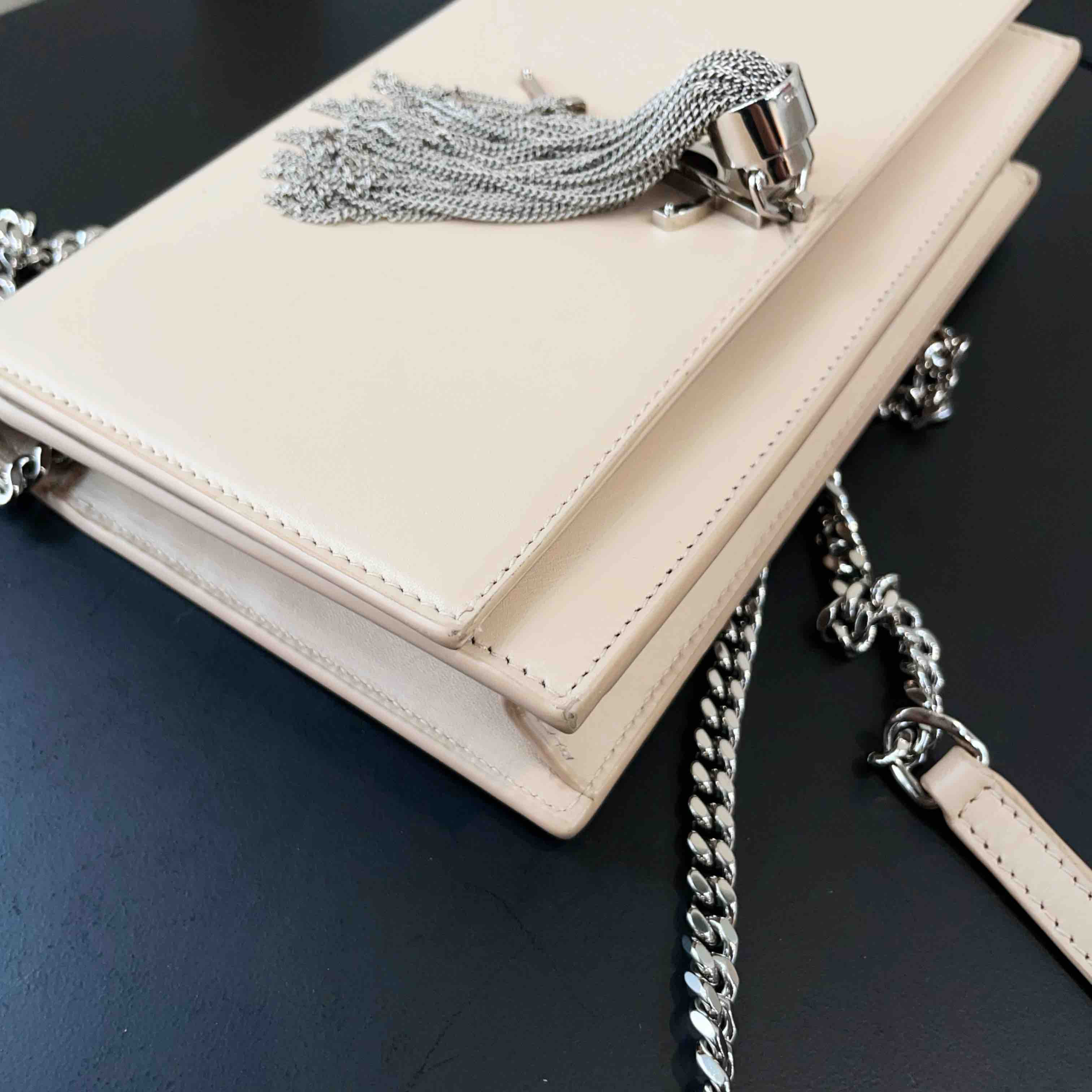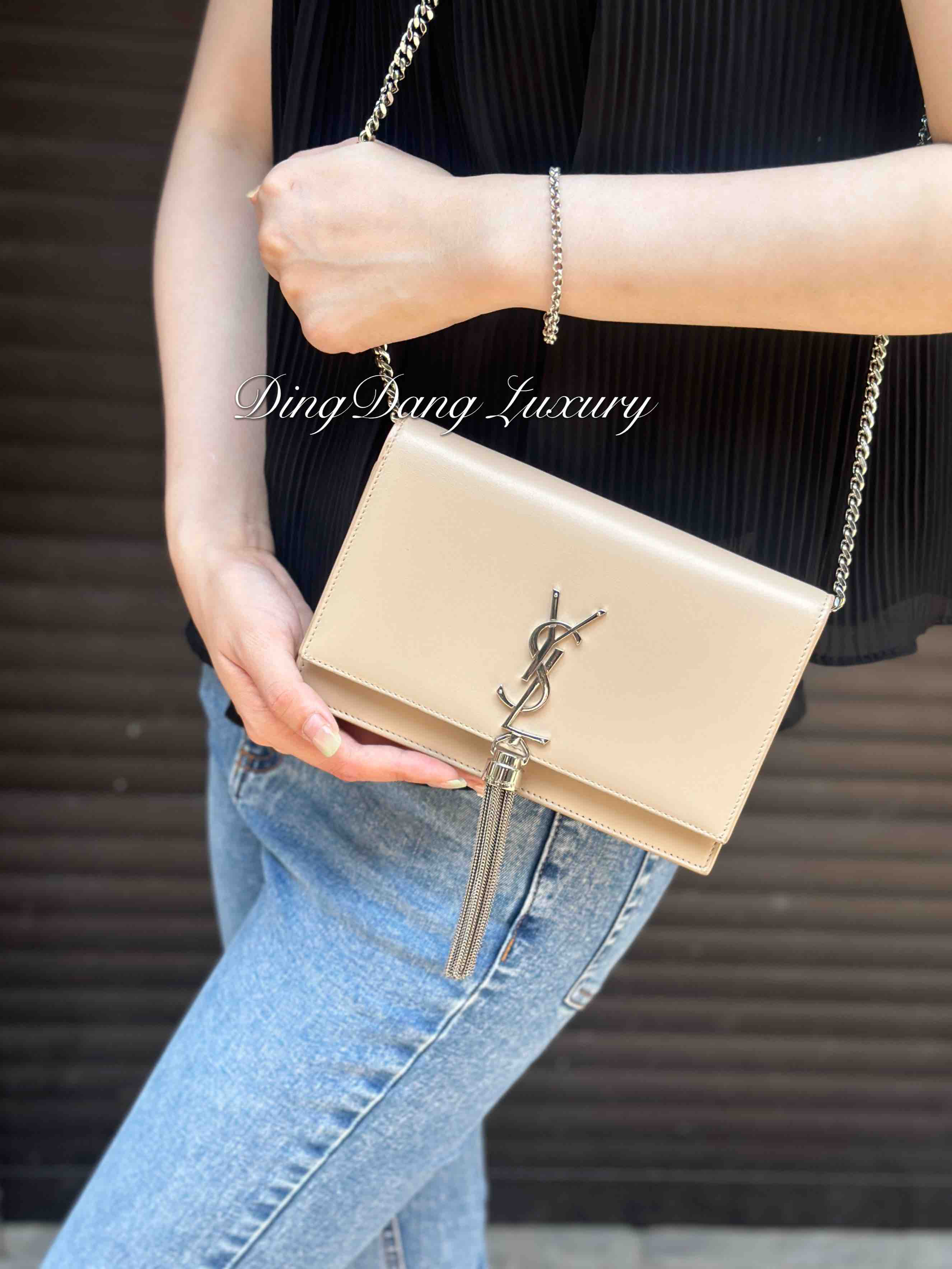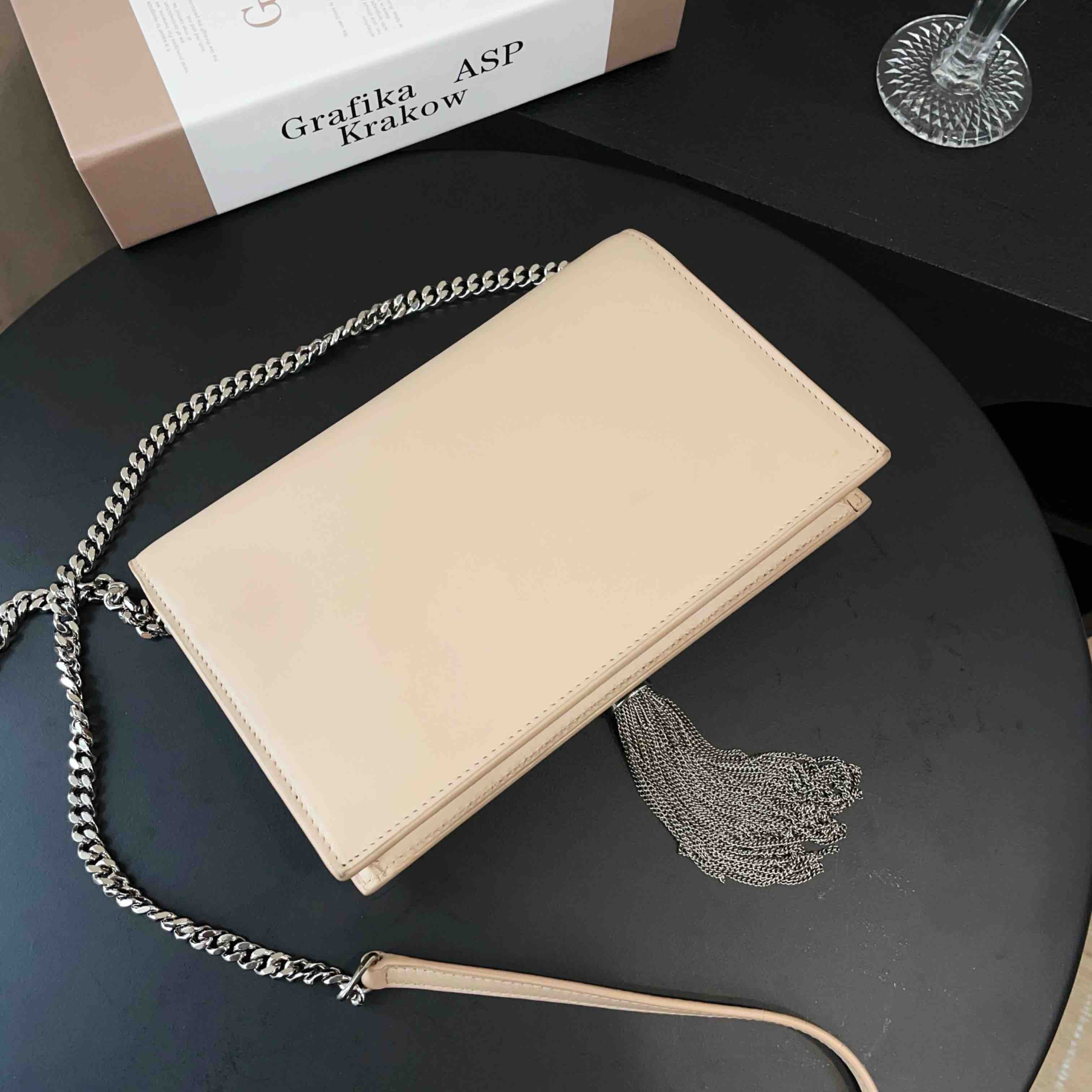 【商品描述】正品二手 YSL 米色 kate 流苏 牛皮 信封 链条包 👜 95新 19x12 五金轻微划痕 油边轻微磨损