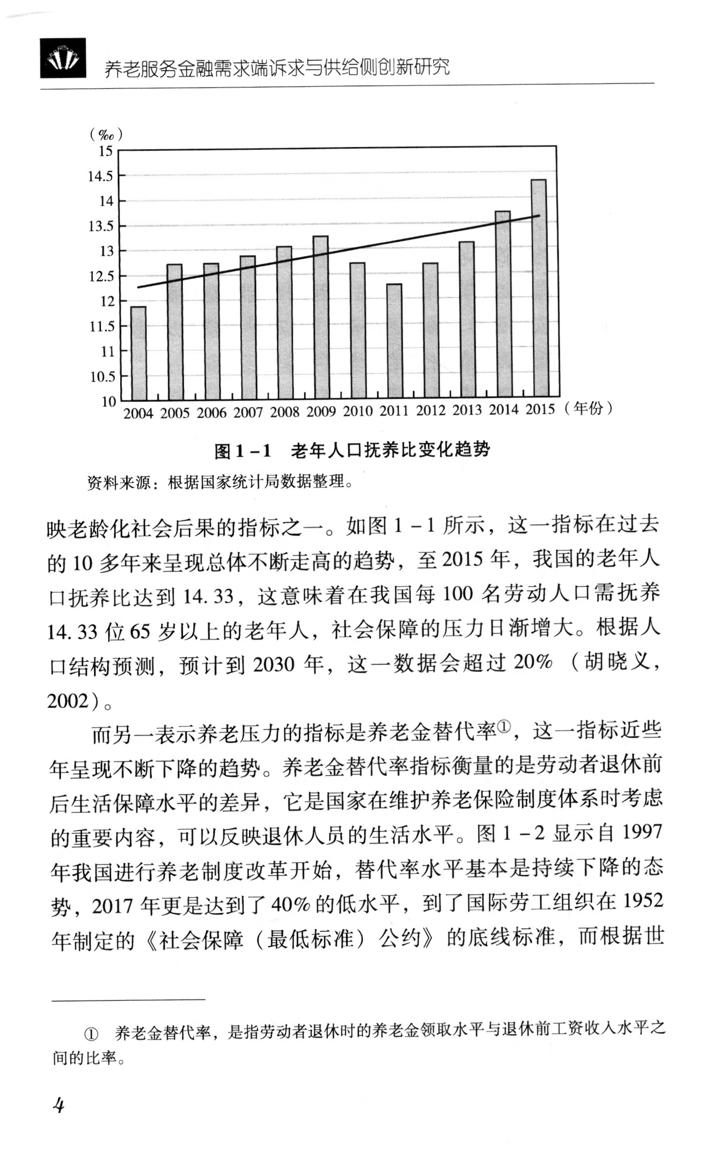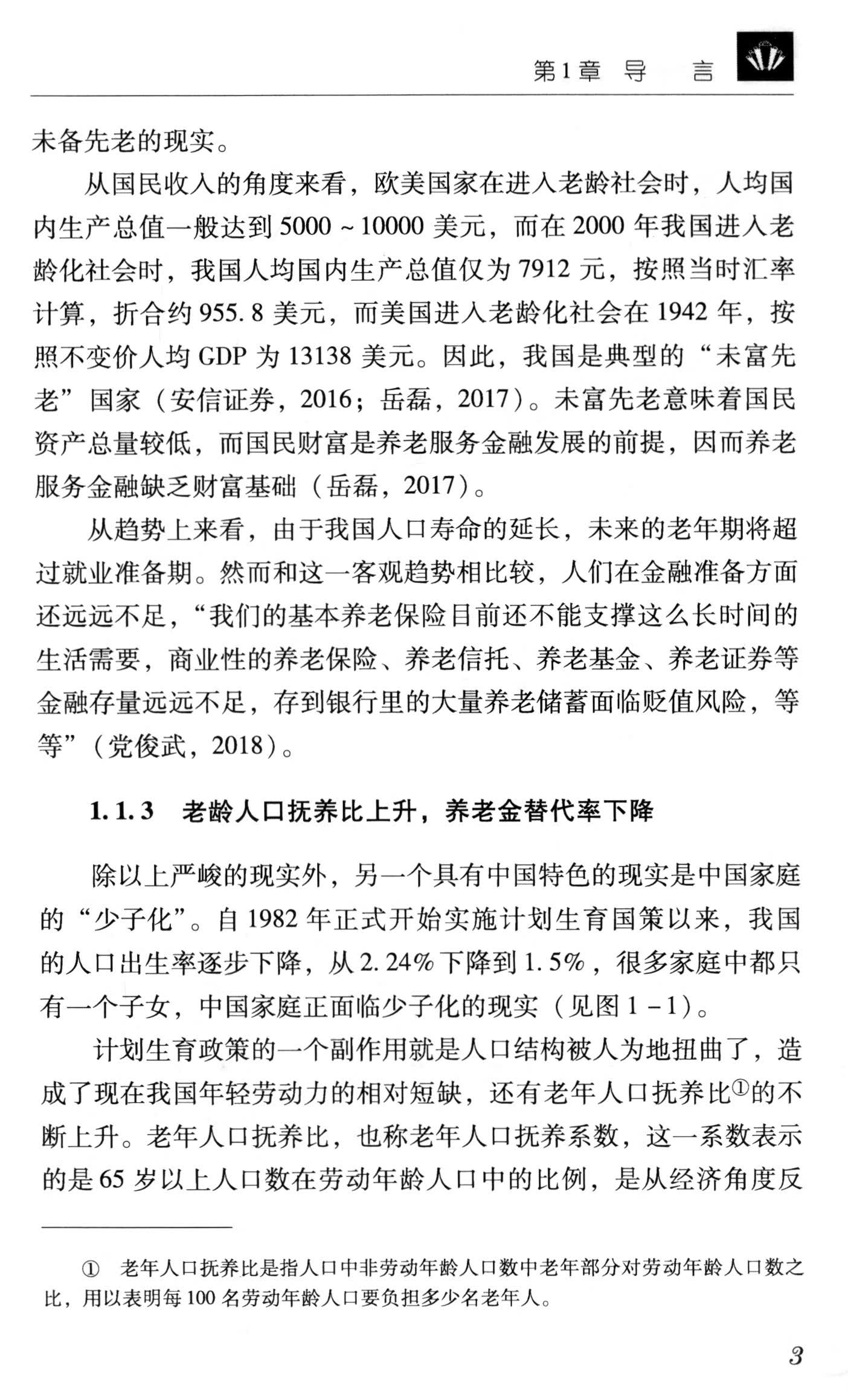 第1章主要阐述了我国老龄化社会的主要特点和严峻现实。本章从分析我国老龄化社会的特点出发,从现行养老保险体系、老龄人口抚养比和养老金替代比等角度对我国未富先老、未备先老和特有的独生子女家庭养老等现实情况进行了阐述和分析;介绍了养老服务金融的含义和特征,辨析了发展养老服务金融的理论依据;对我国养老服务金融发展的现状和面临的挑战进行了归纳梳理和分析。