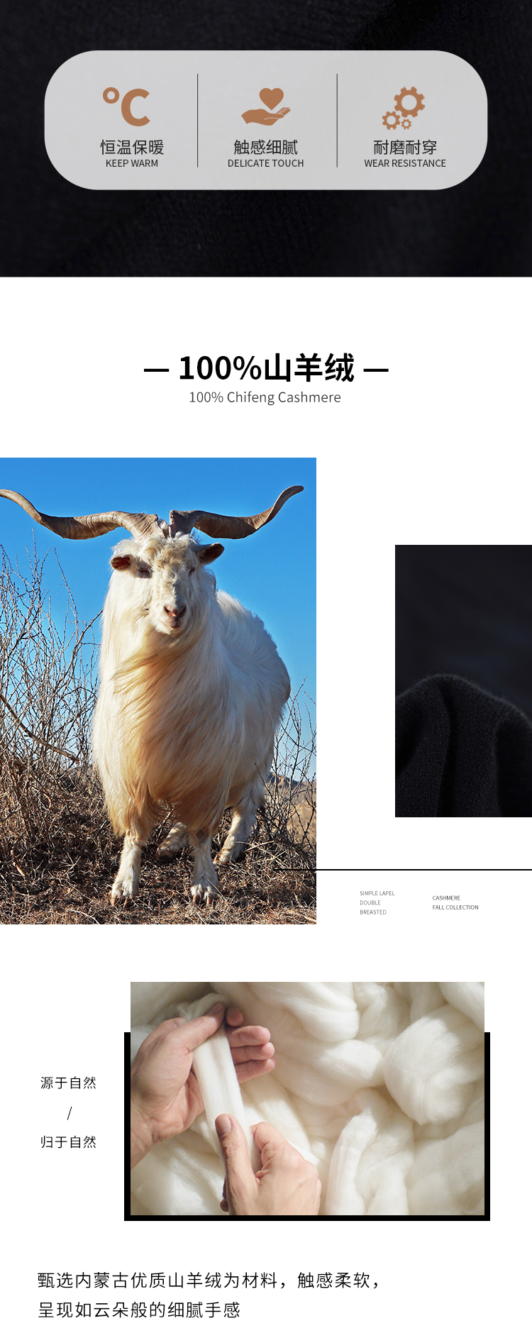 东黎羊绒是赤峰东荣集团自主品牌,自有牧场/羊绒制品全产业链优势,实现了羊绒从“牧场”到“商场”的华丽转变。