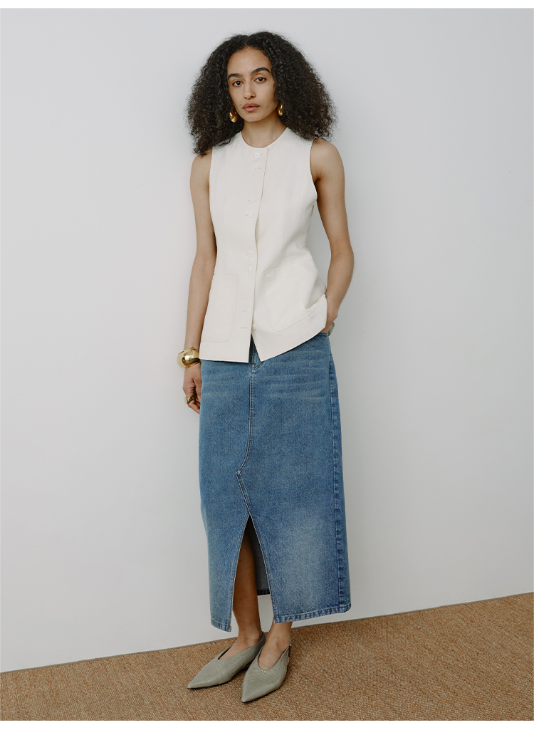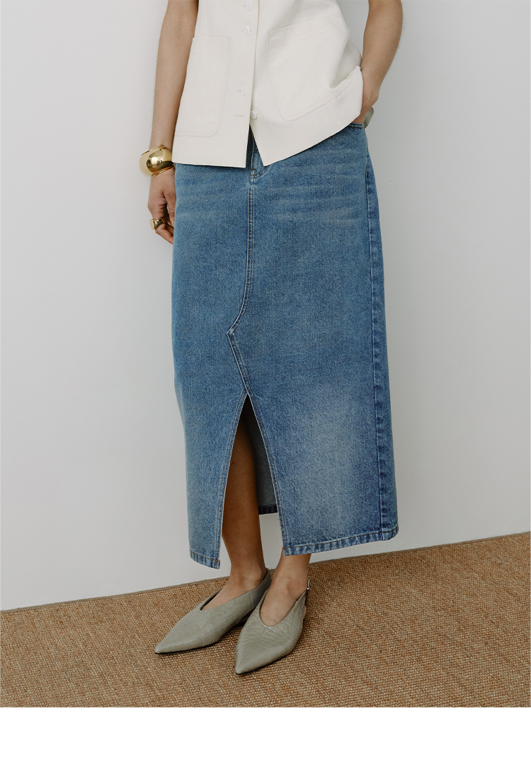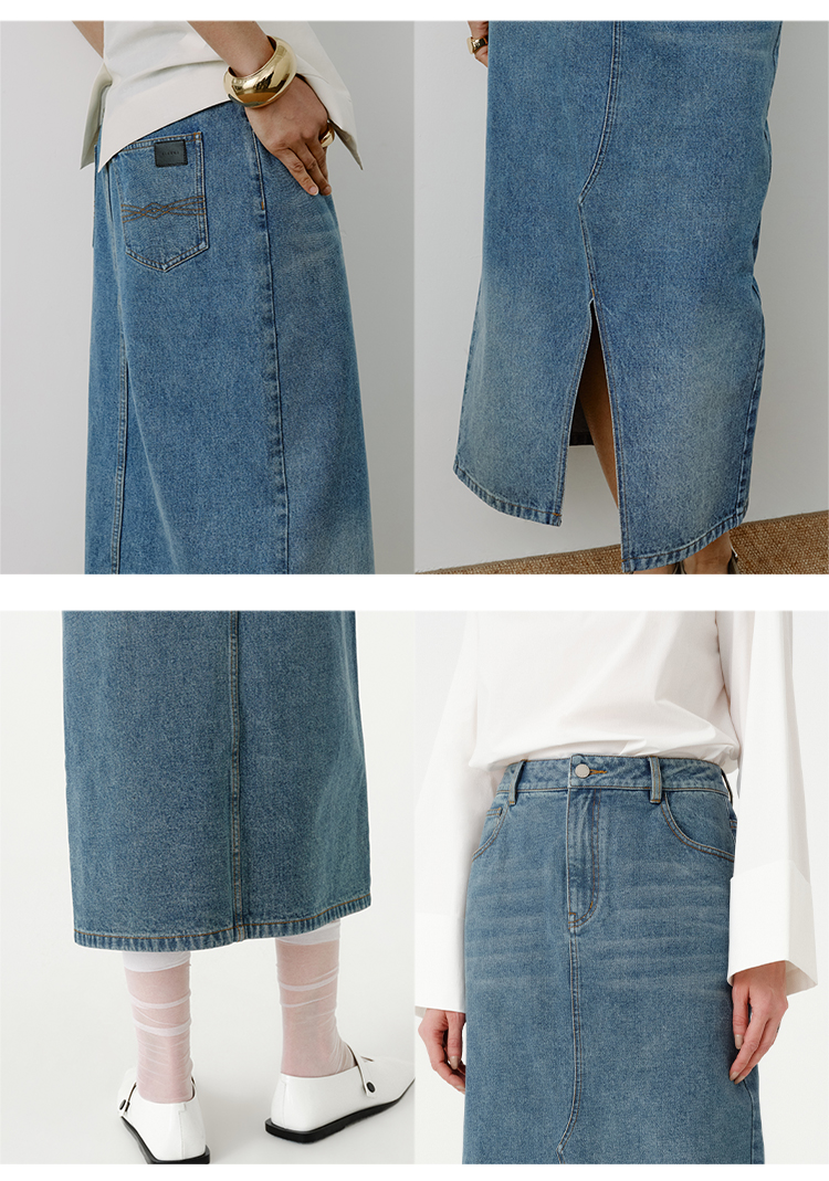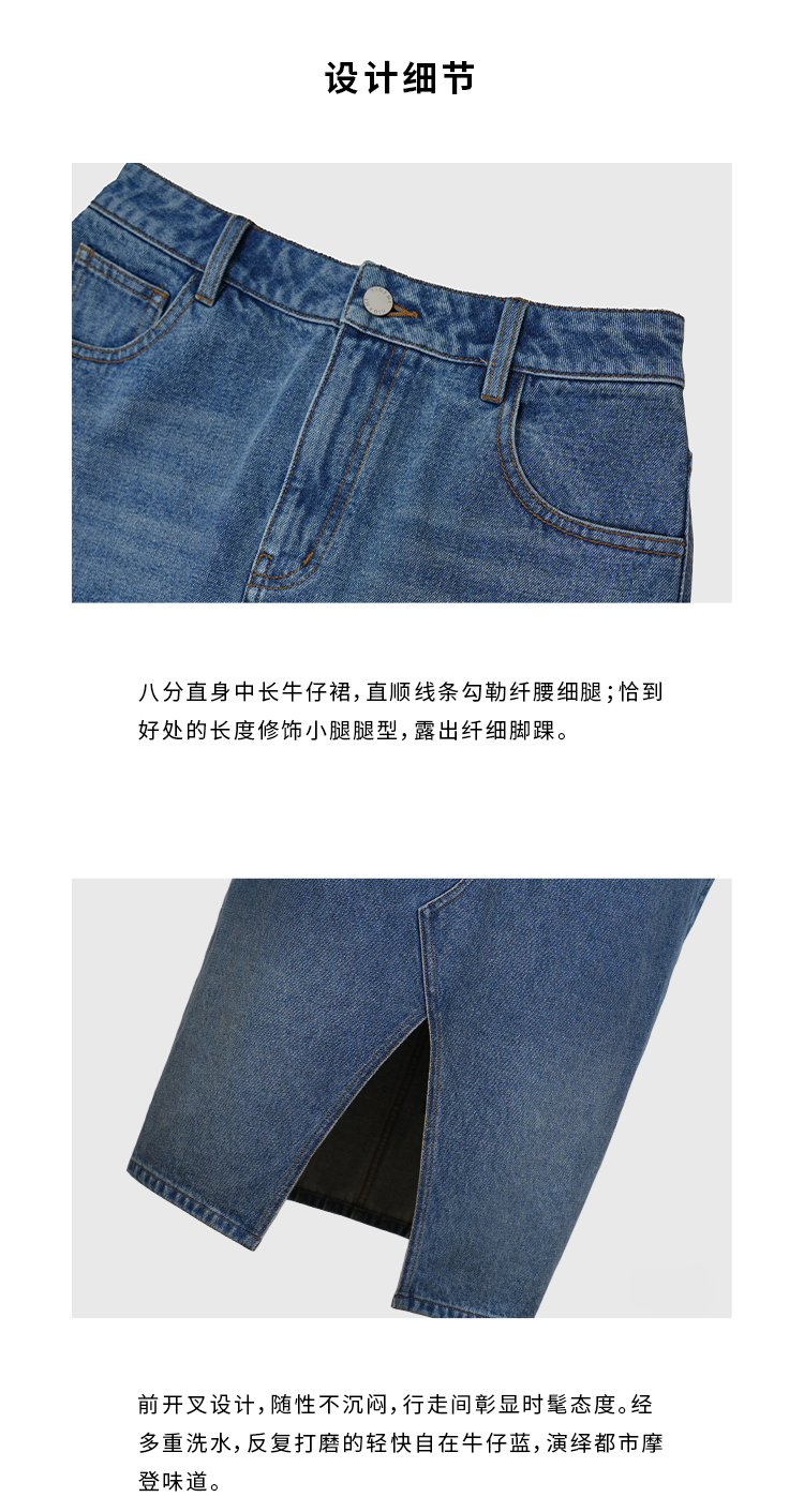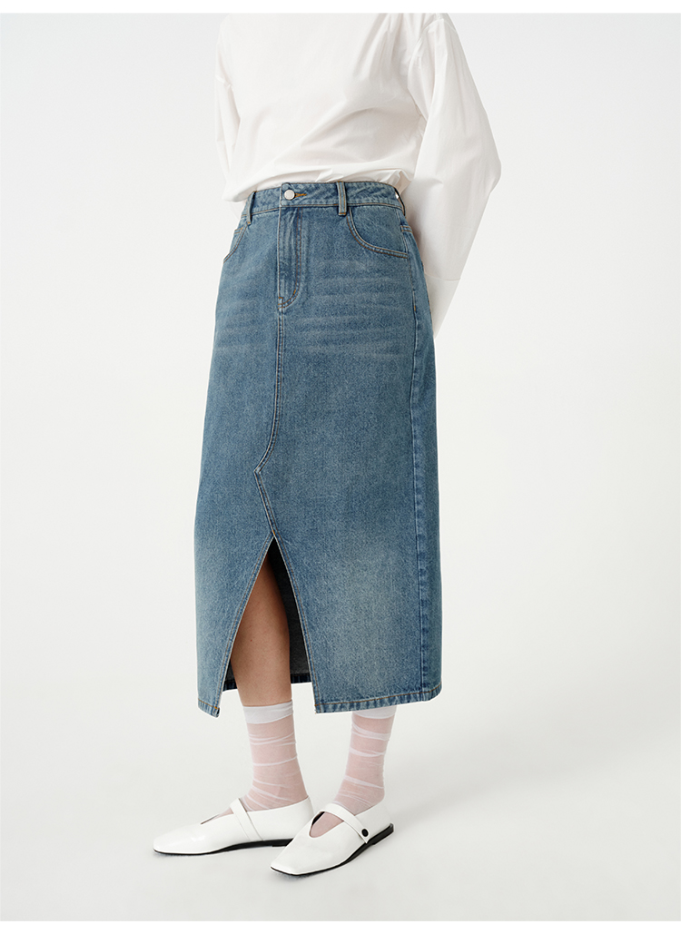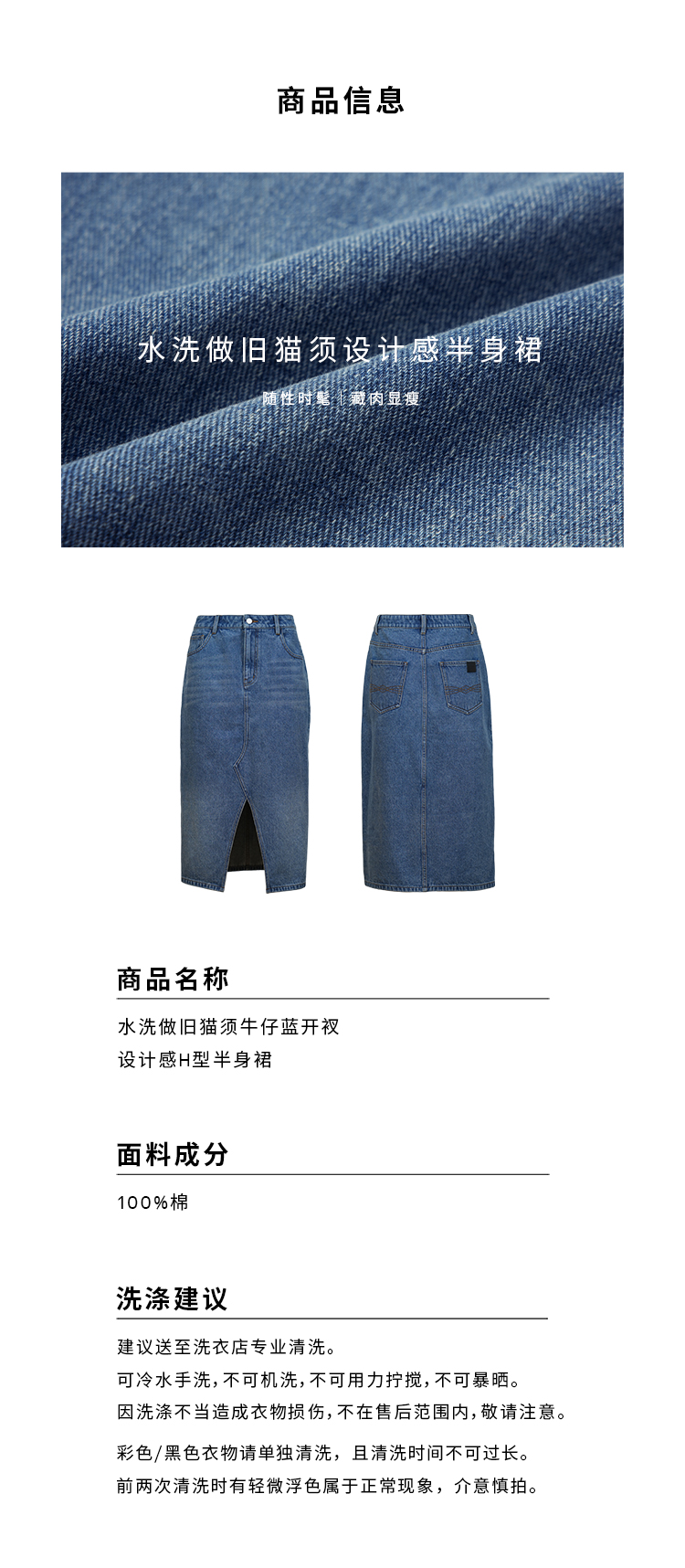 HIDEMI 水洗做旧猫须牛仔蓝开衩设计感H型半身裙