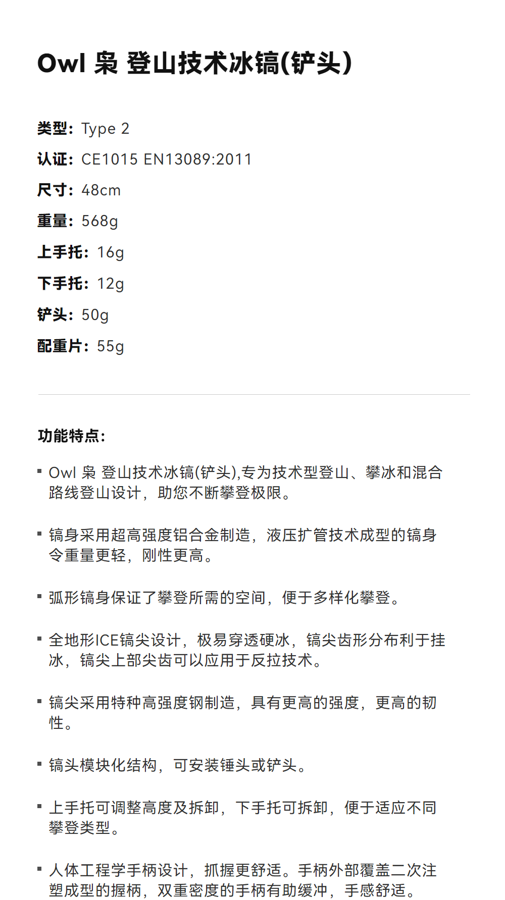 KAILAS凯乐石 Owl 枭 登山技术冰镐(铲头) EI201A