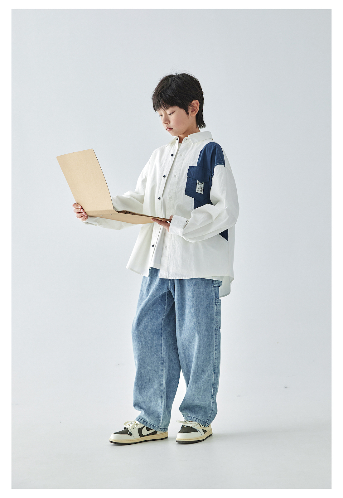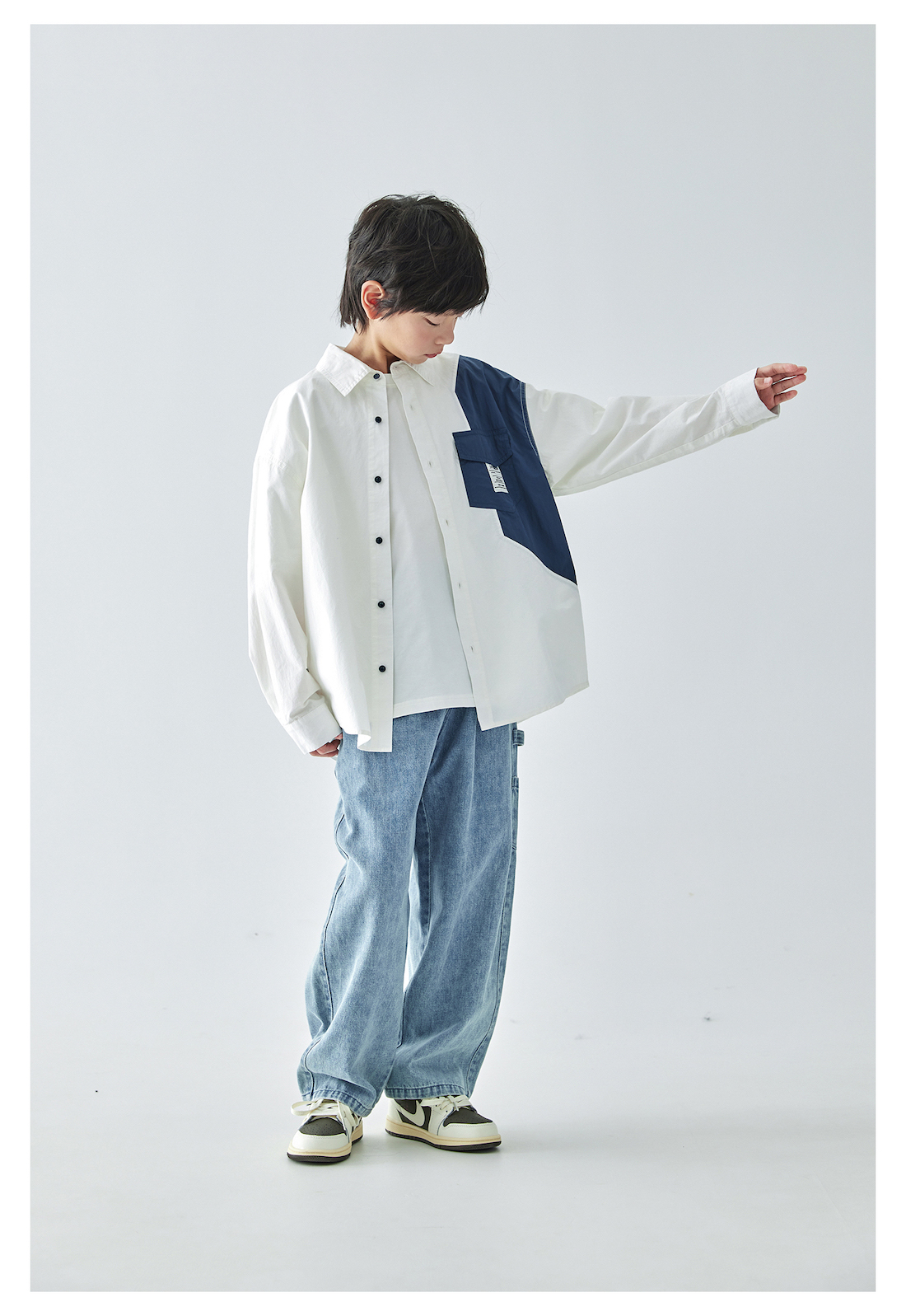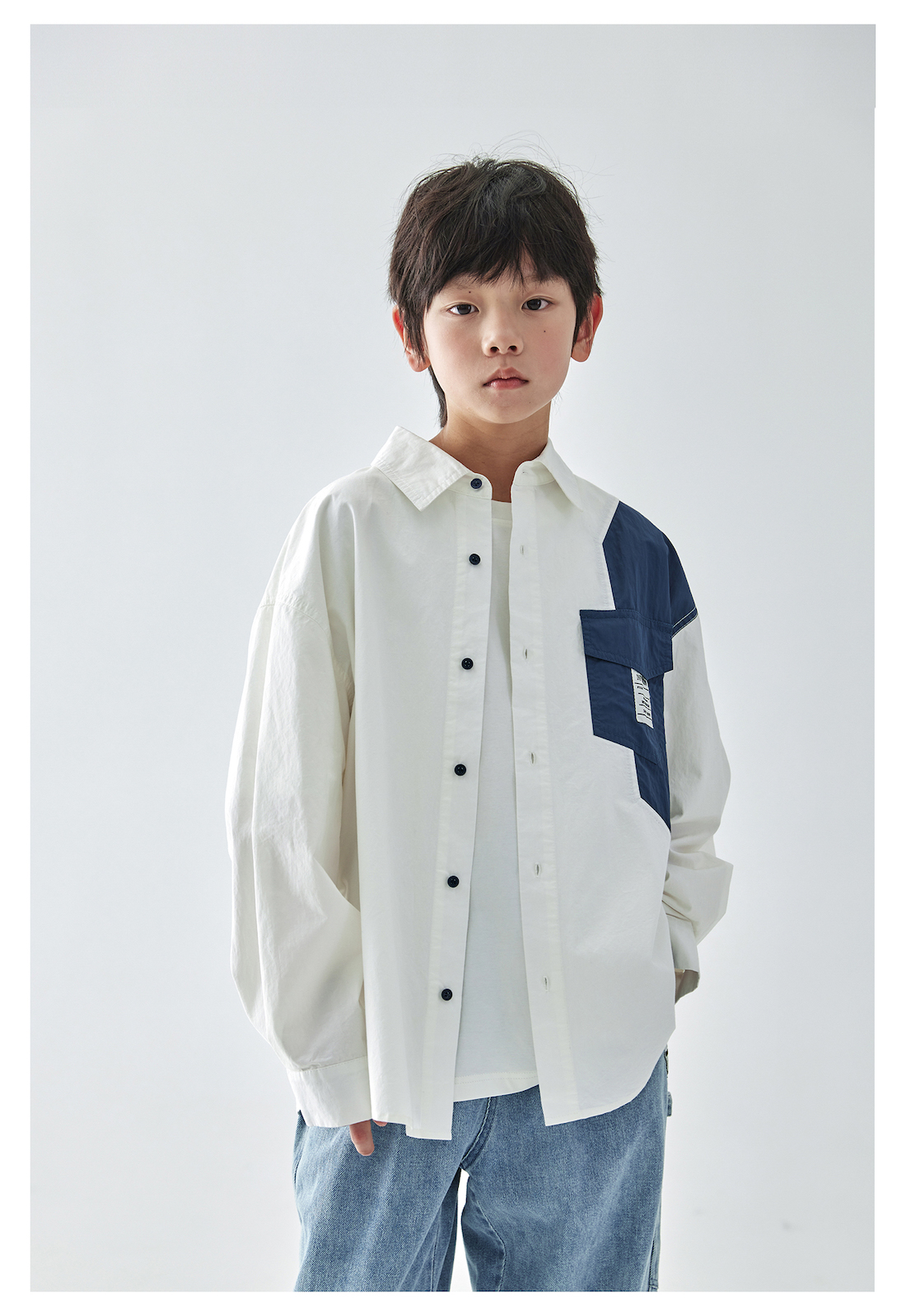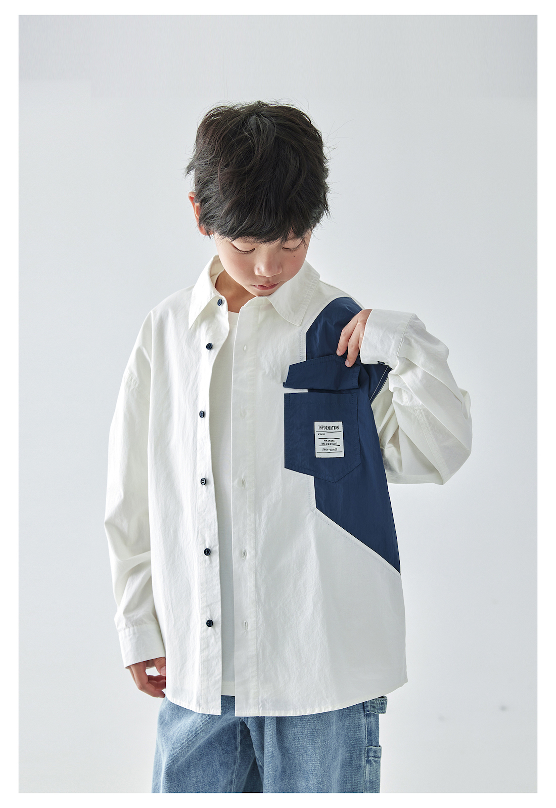 蓝汽水25年春季撞色拼接长袖衬衫男童全棉质感宽松休闲设计感衬衣