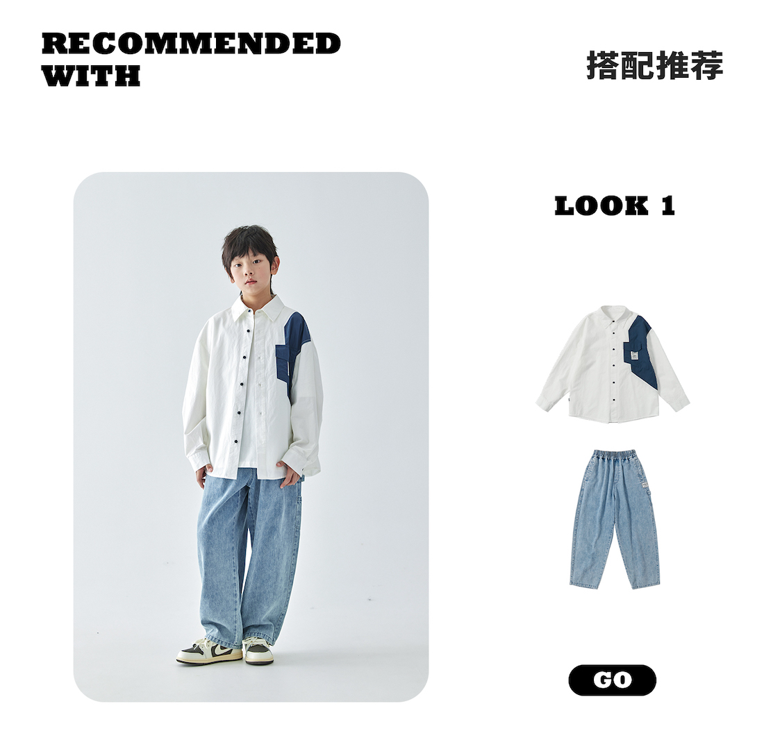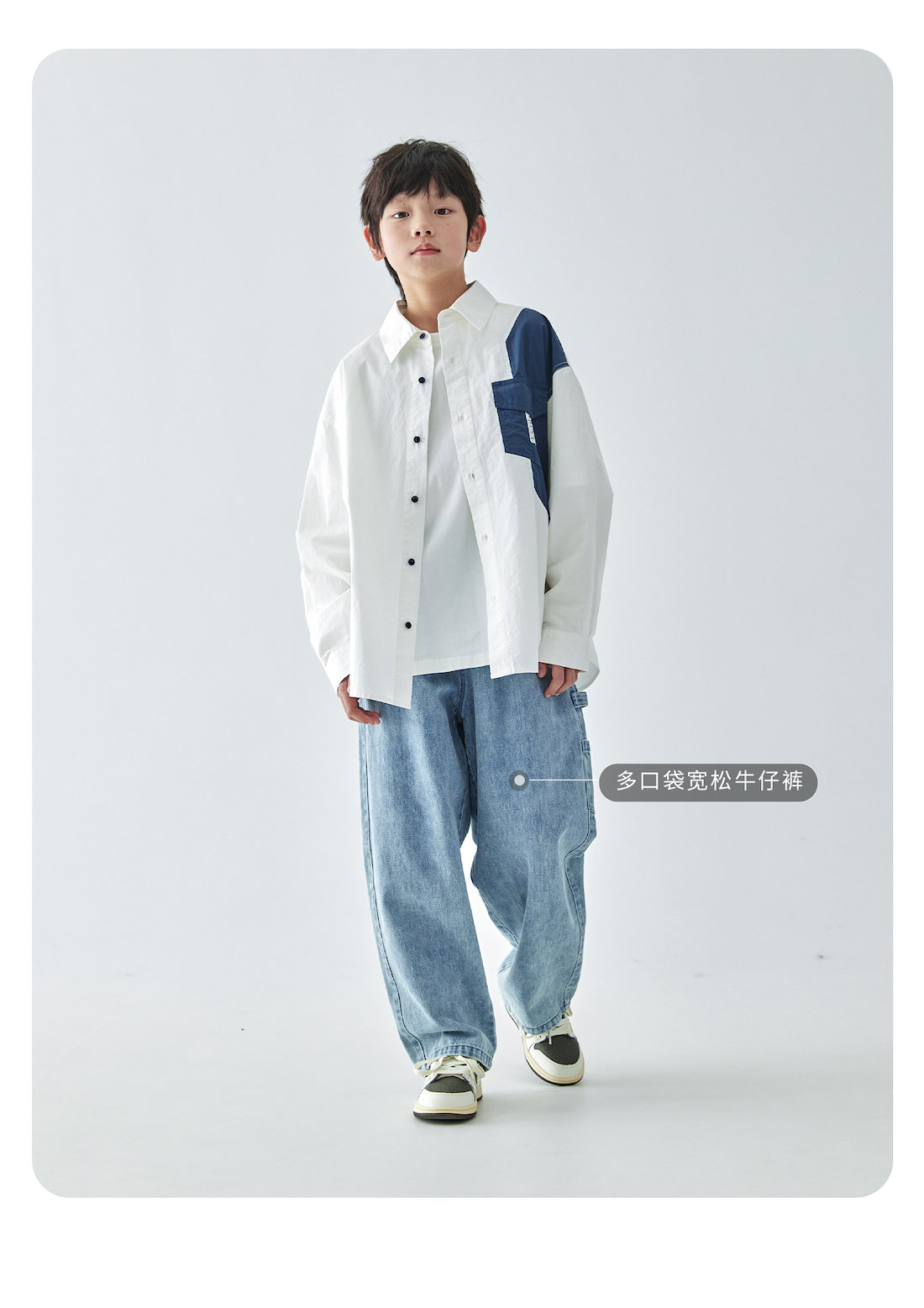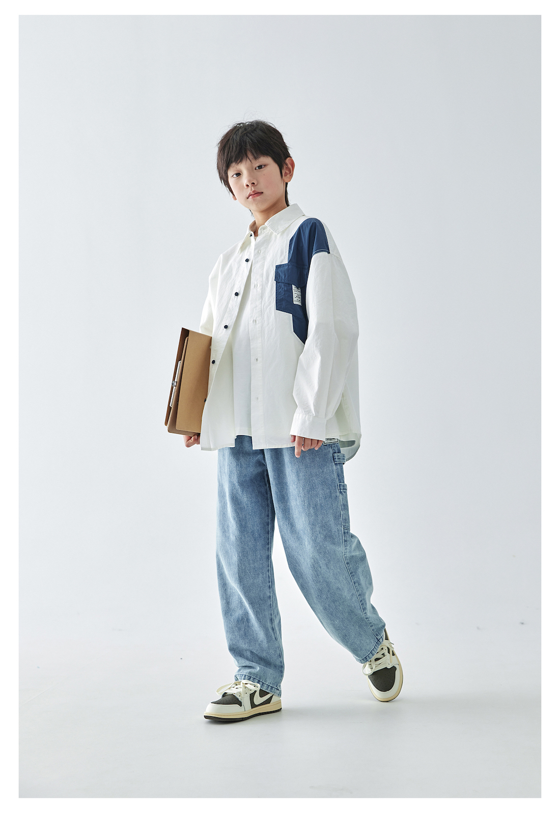 蓝汽水25年春季撞色拼接长袖衬衫男童全棉质感宽松休闲设计感衬衣