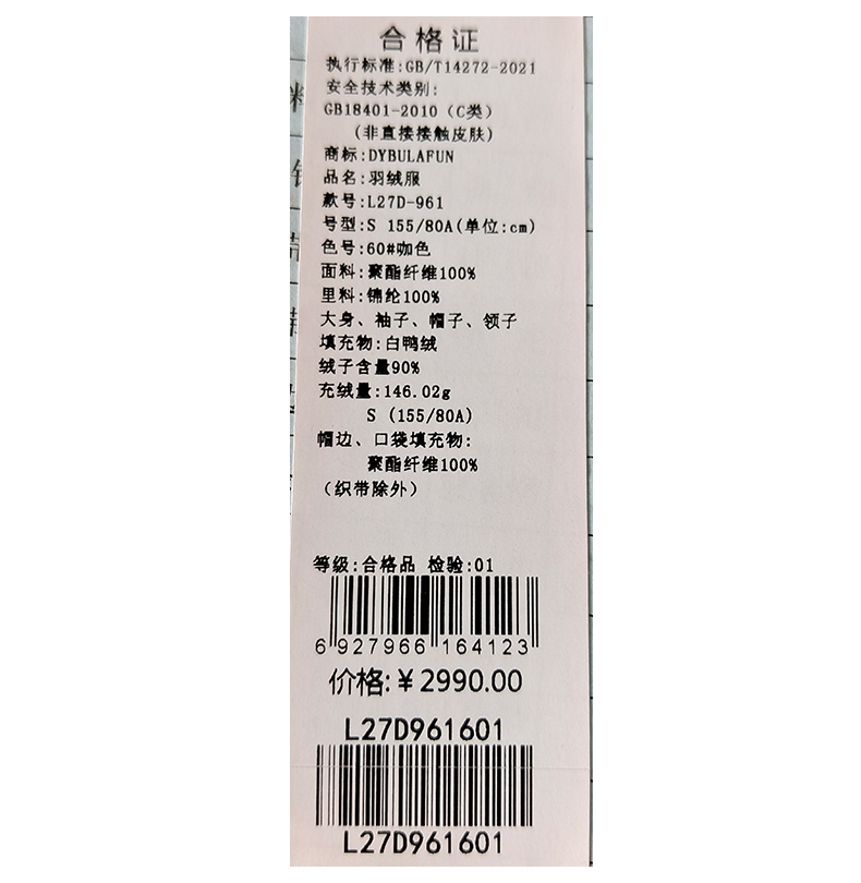 戴布拉芬羽绒服L27D961