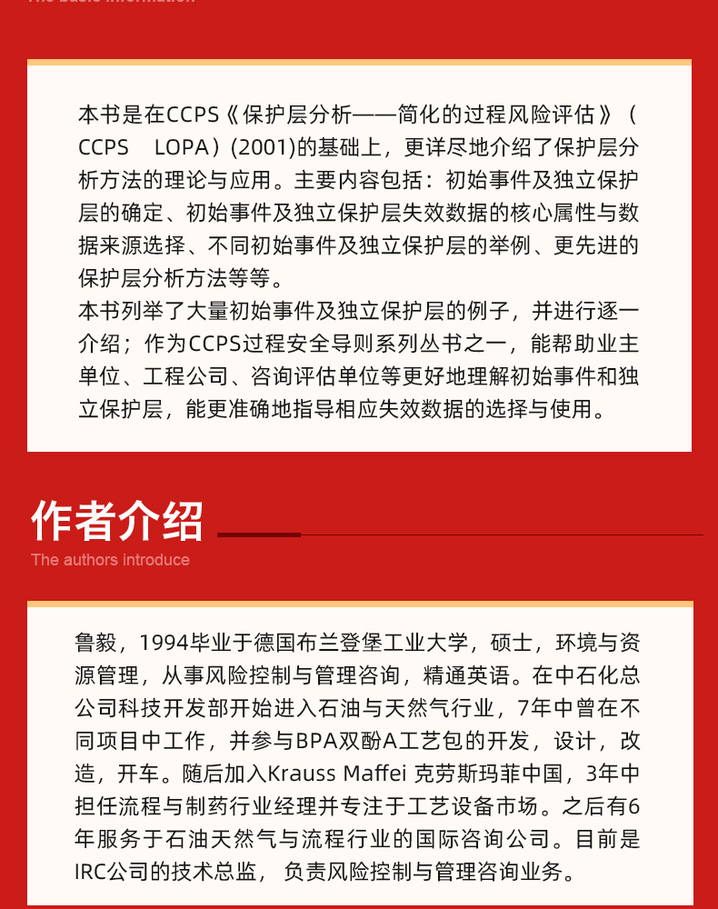 本书列举了大量初始事件及独立保护层的例子,并进行逐一介绍;作为CCPS过程安全导则系列丛书之一,能帮助业主单位、工程公司、咨询评估单位等更好地理解初始事件和独立保护层,能更准确地指导相应失效数据的选择与使用。