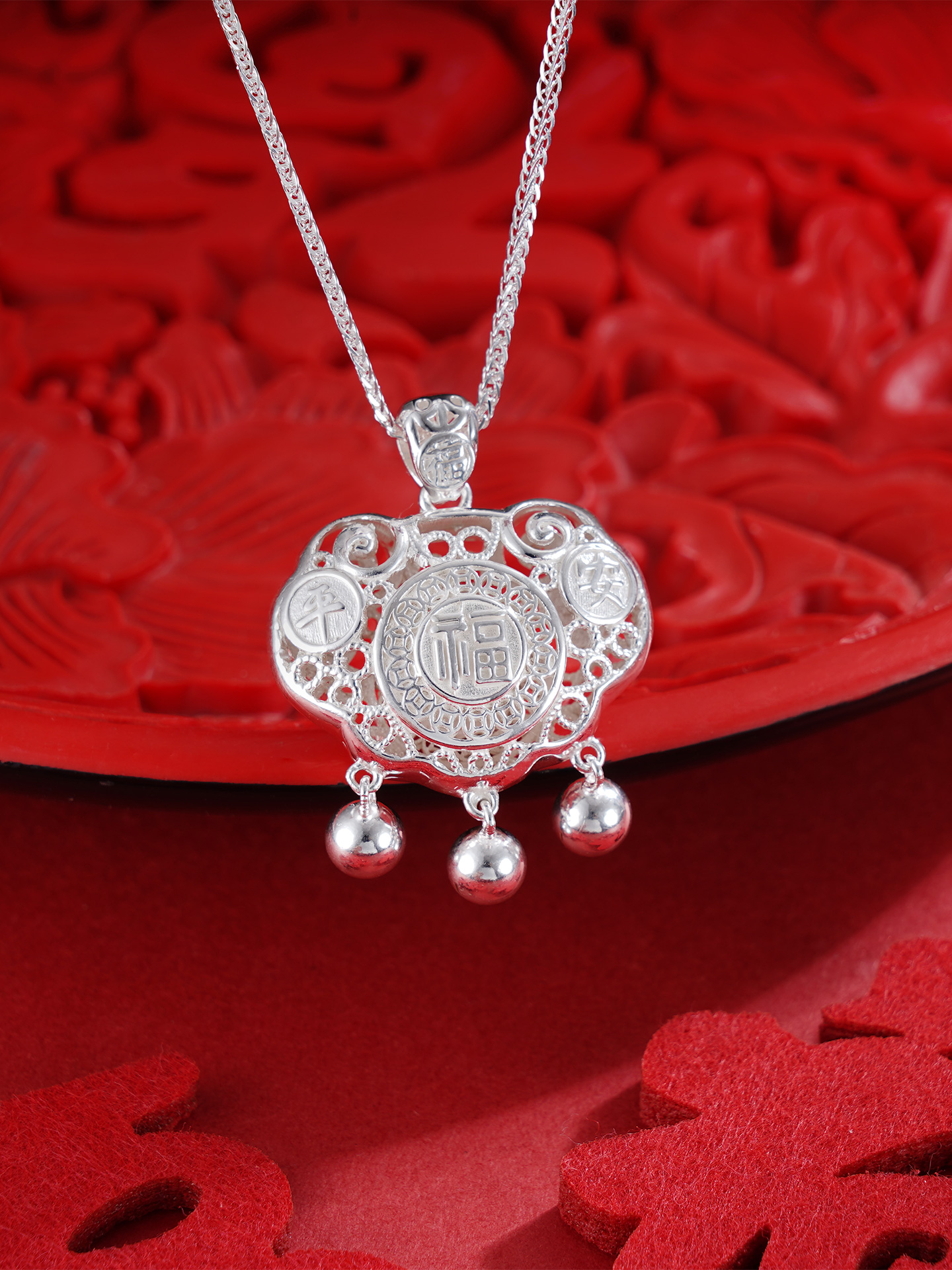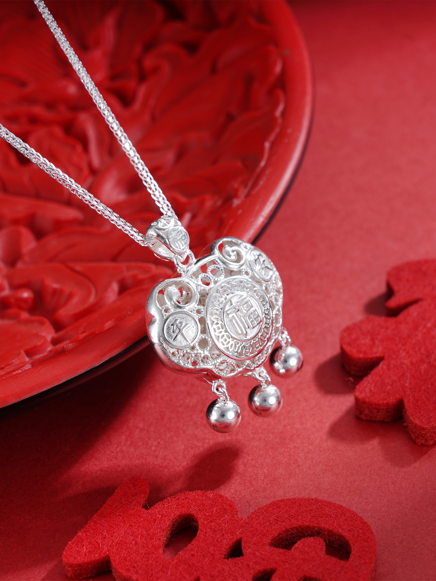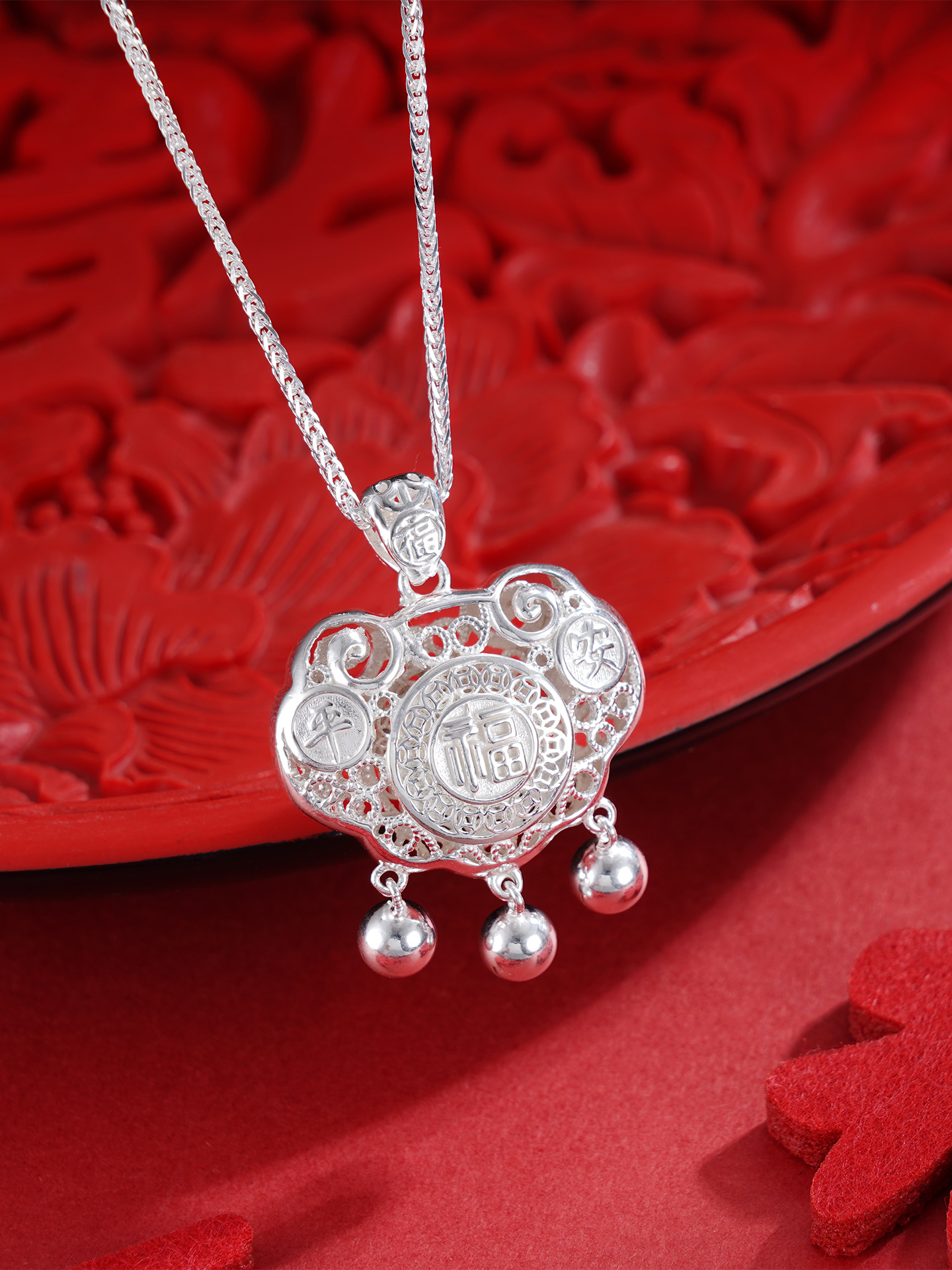 【寓意】:3D立体儿童长命锁,银花丝精妙编织,福字生动点缀,整体清雅灵动,象征着福气满满和吉祥守护。
