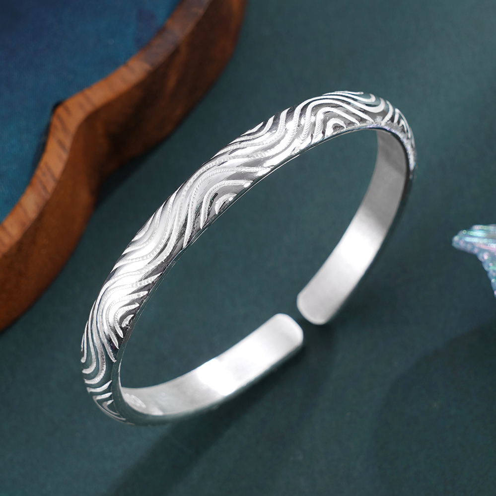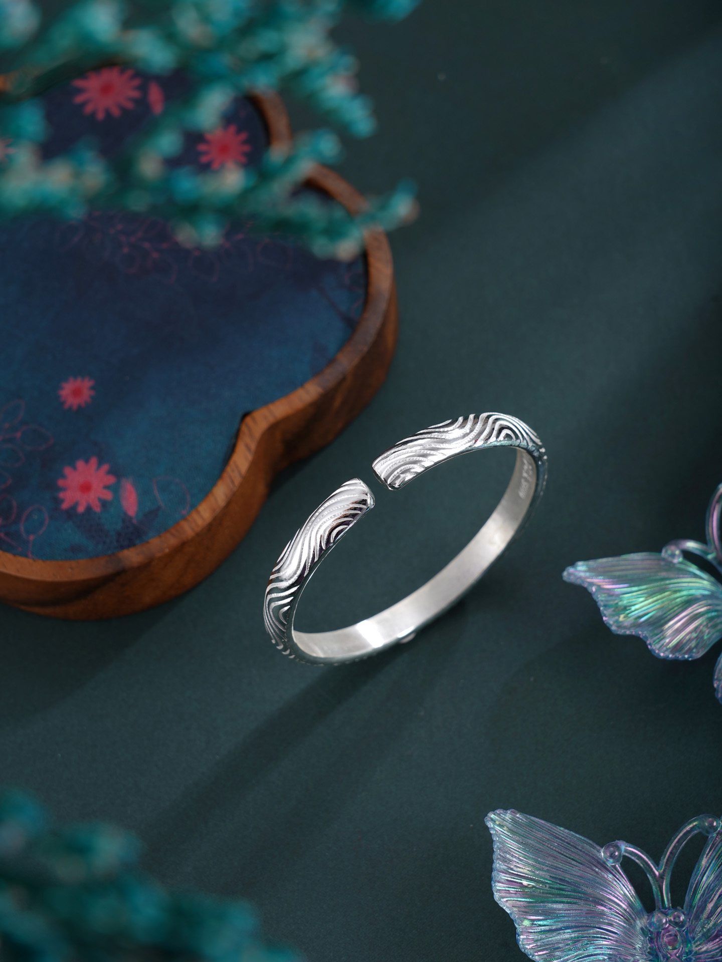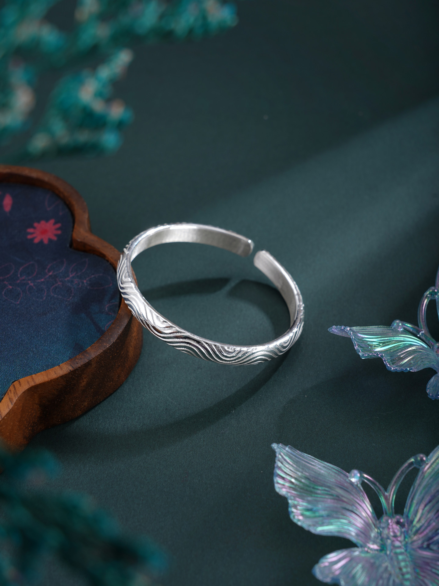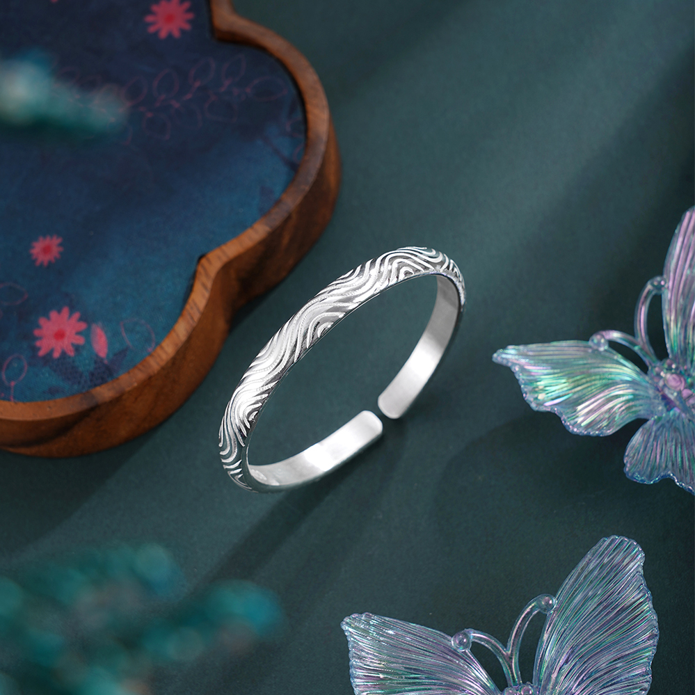 【寓意】:纯银手工手镯,镯身錾刻婉转波浪纹理,如梦似幻;通体泛着温润白光,佩戴其间,气质温婉雅致,自带柔光。