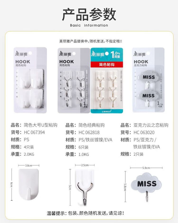 美丽雅创意粘钩 挂钩强力粘胶墙壁挂物无痕免打孔6只装/份