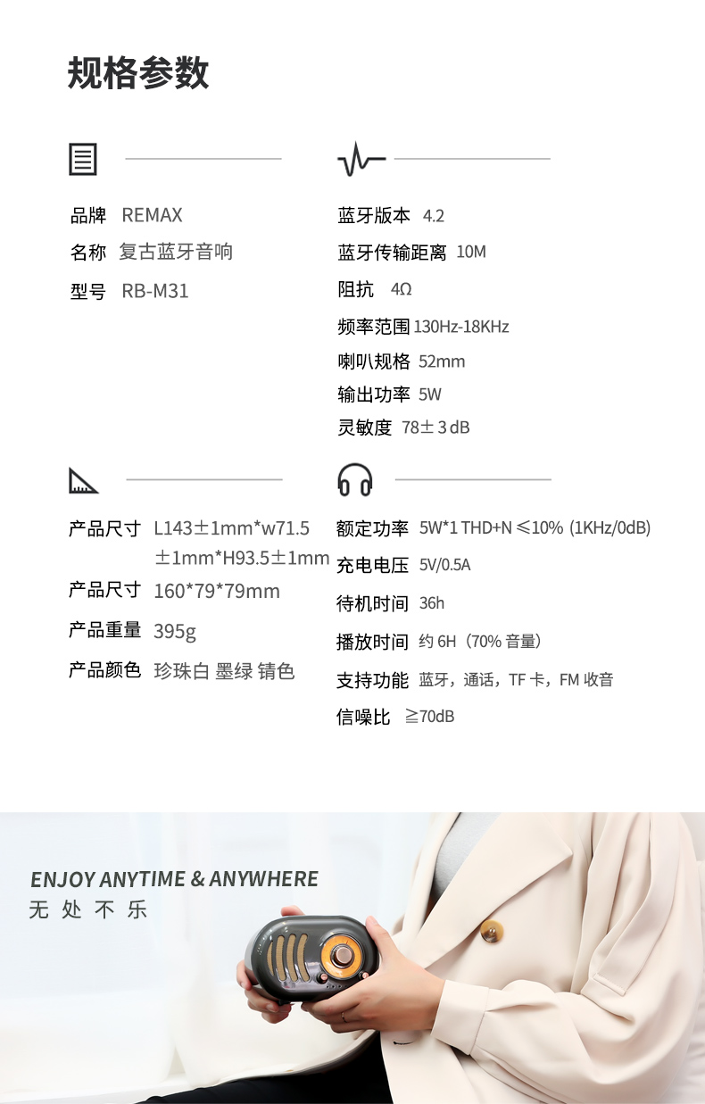REMAX睿量复古蓝牙音箱RB-M31(颜色随机)