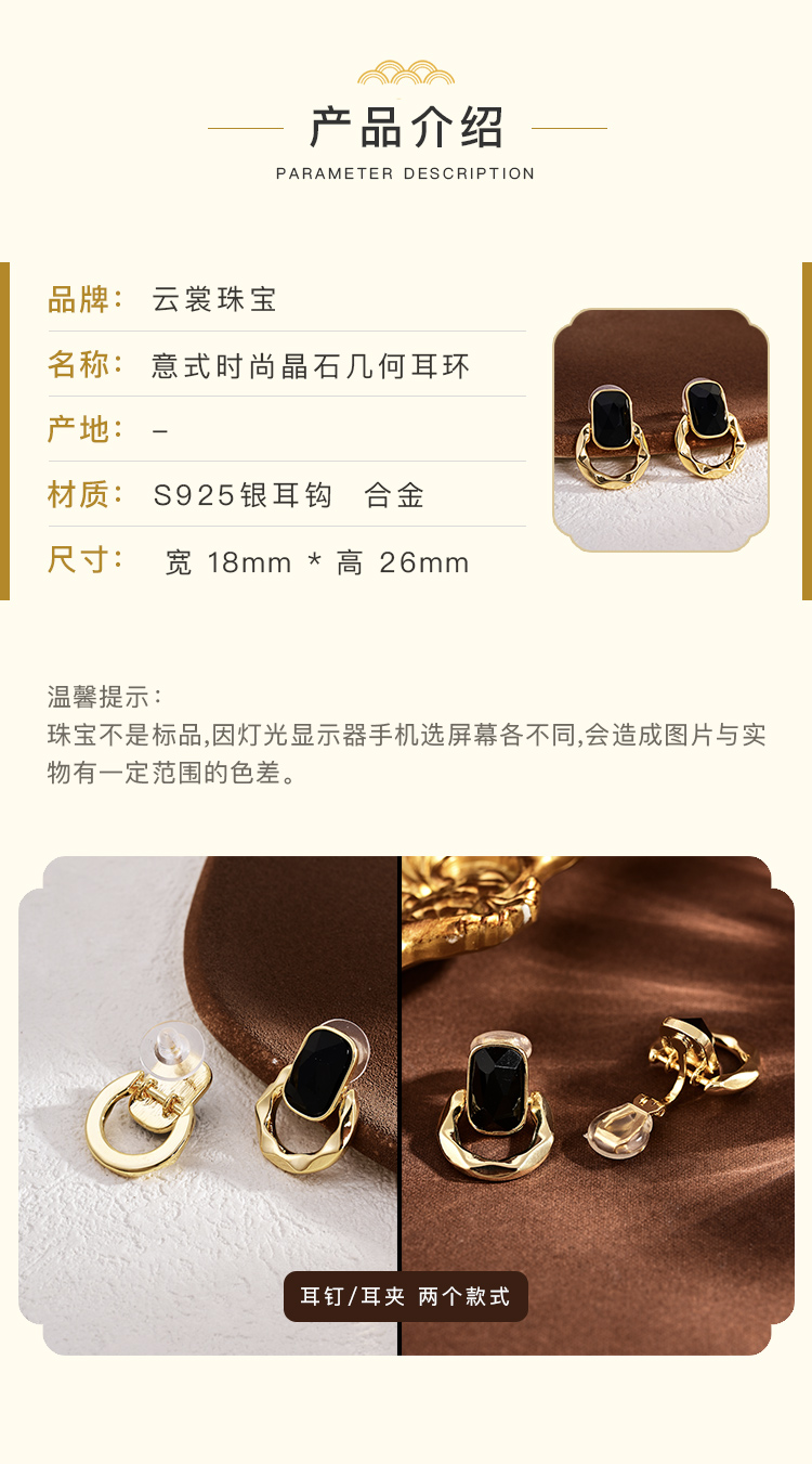 【云赏珠宝】耳夹/耳环意式时尚晶石几何图形耳环s925银针耳饰