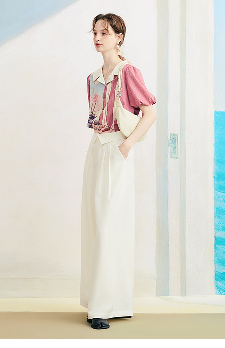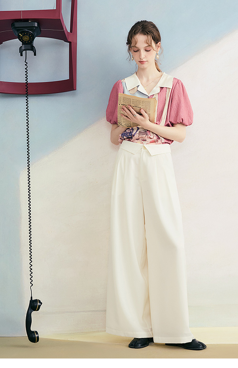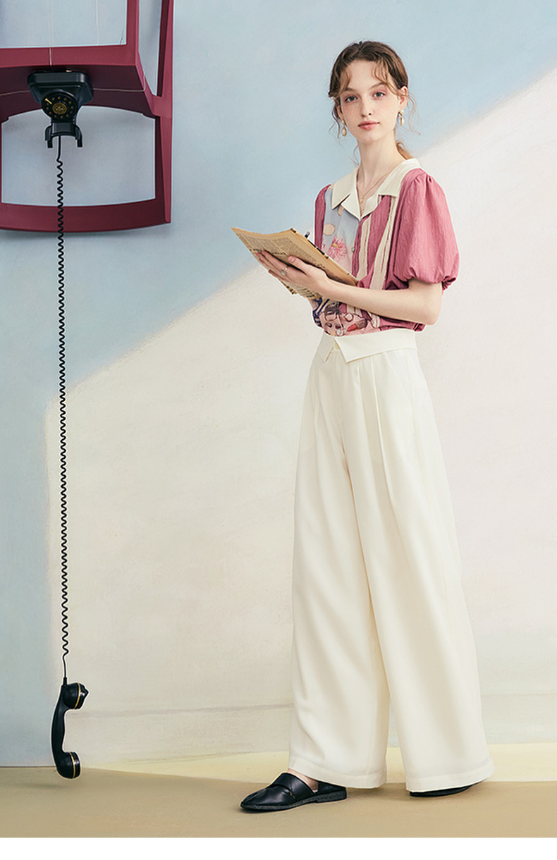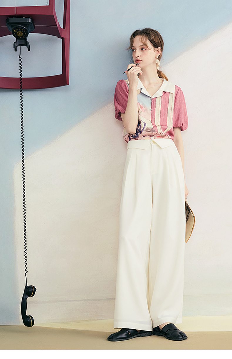 两三事 月糖溶吻 2025夏季新款折翻边米色高腰阔腿休闲裤女宽松