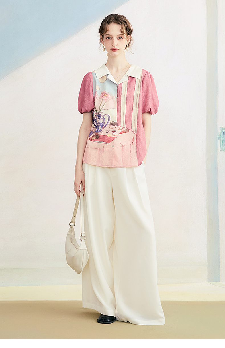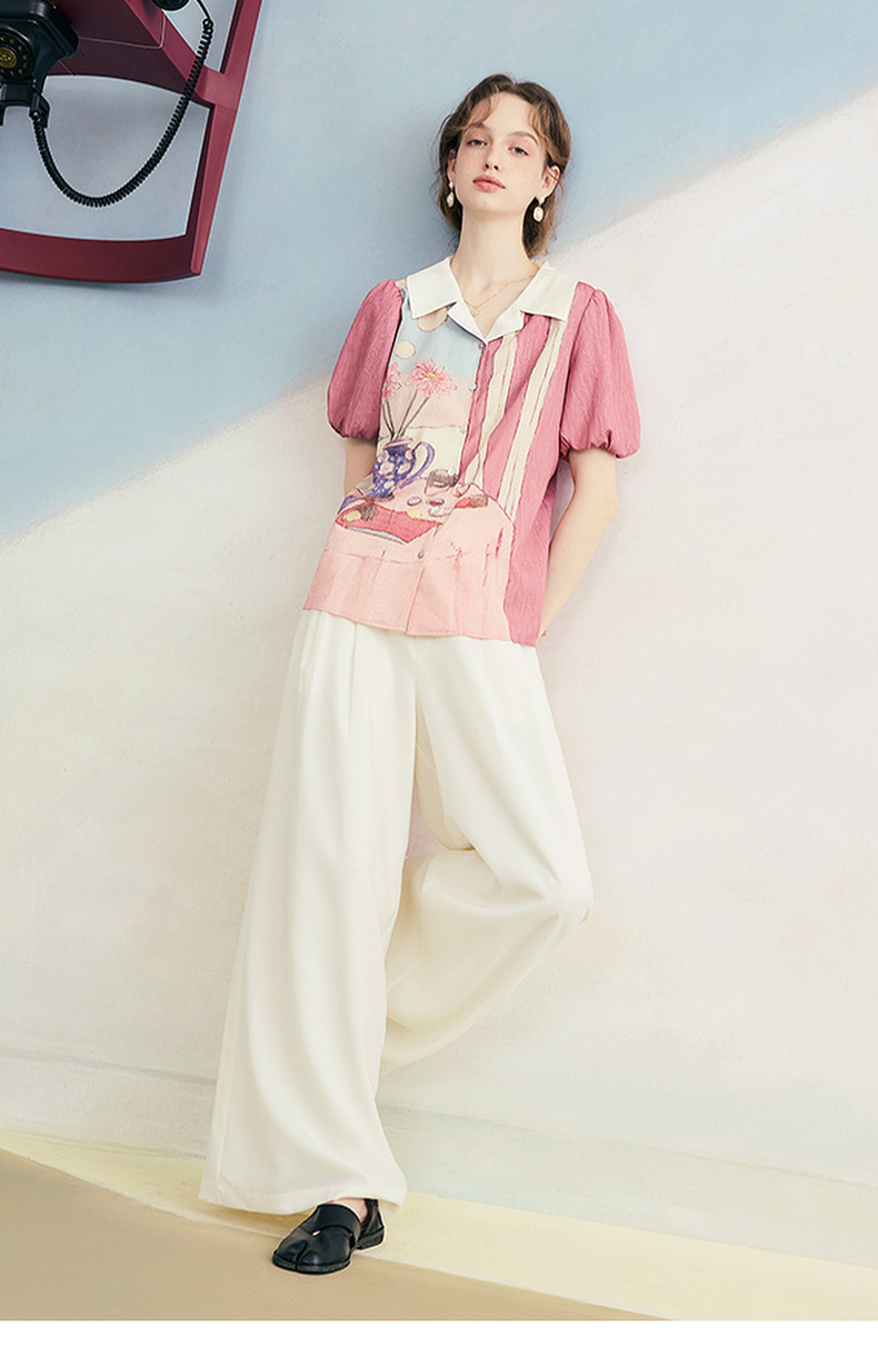 两三事 月缎流萤 2025夏季新款淑女风印花荷叶边刺绣翻领衬衫女