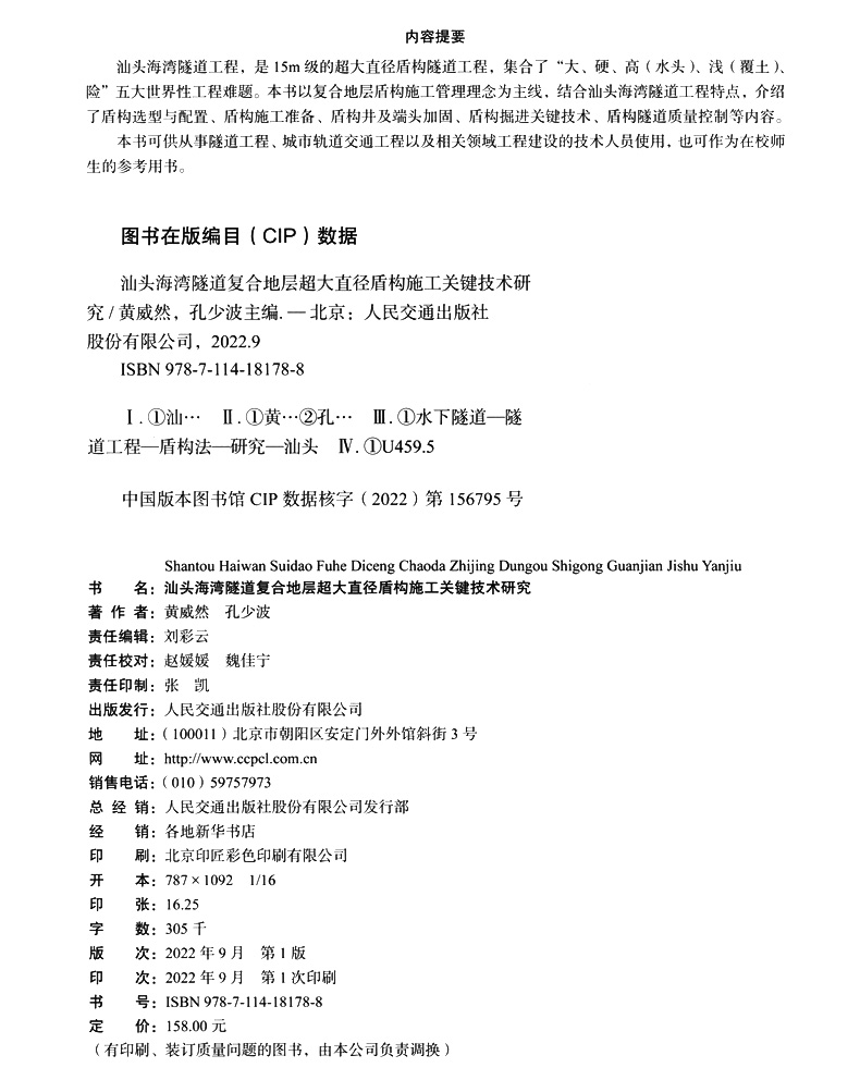 书名:汕头海湾隧道复合地层超大直径盾构施工关键技术研究