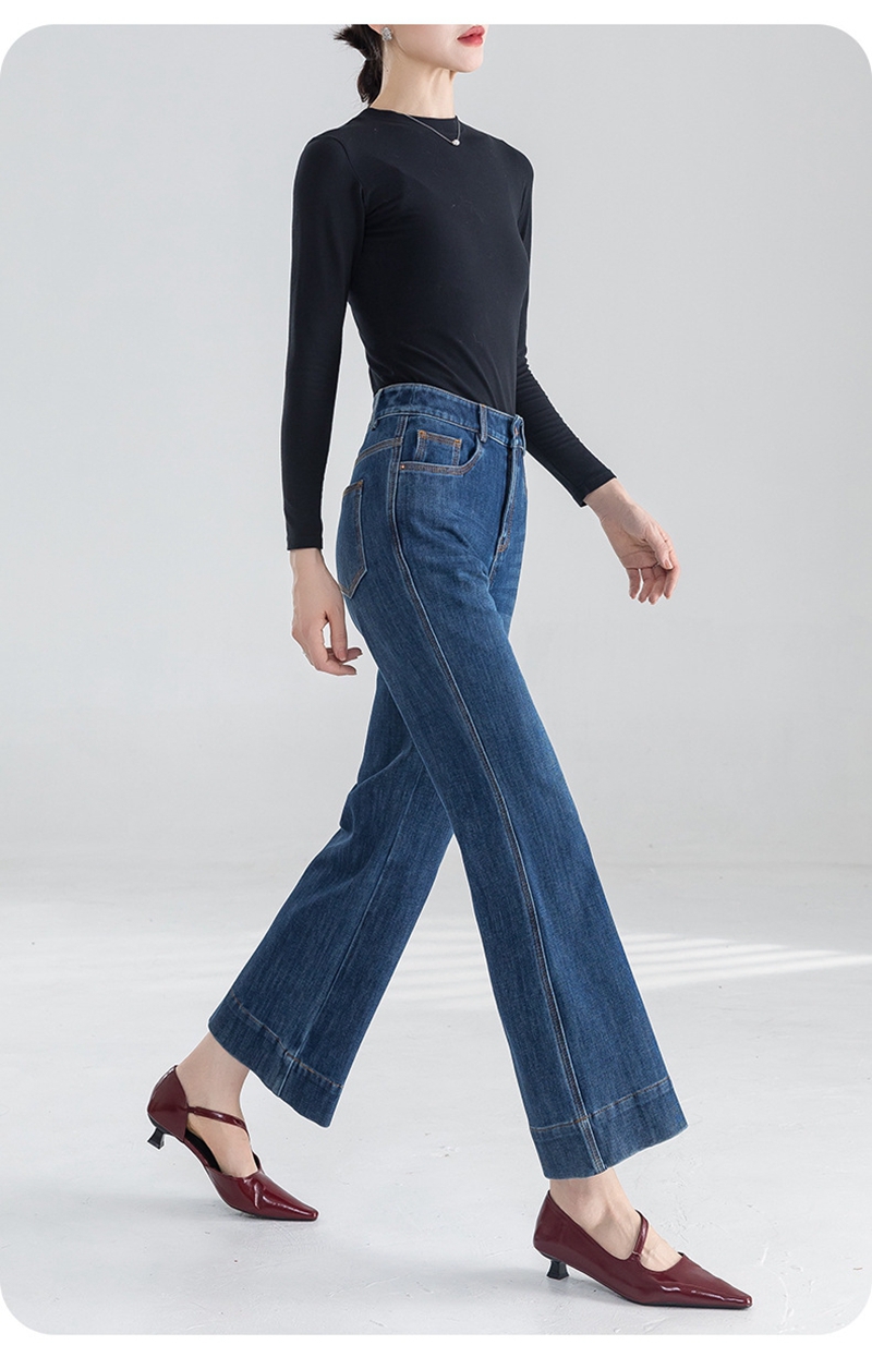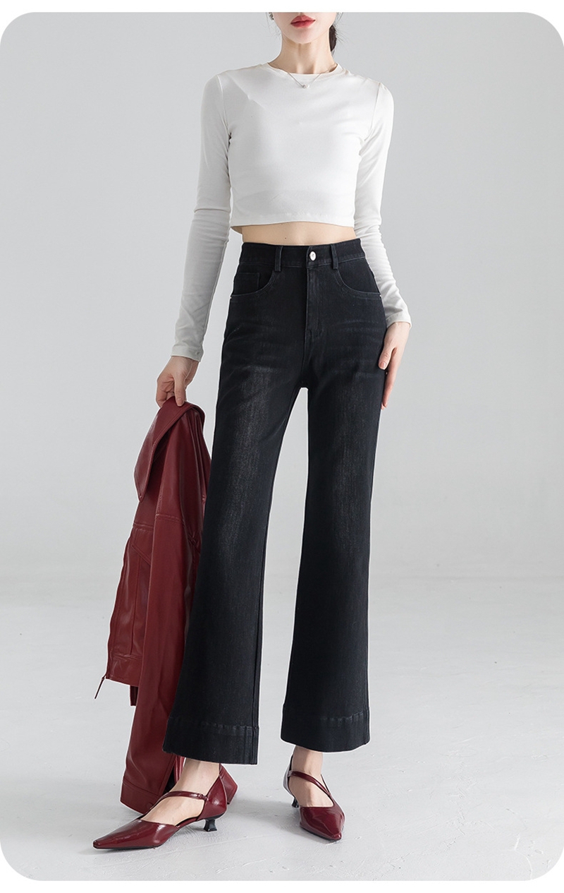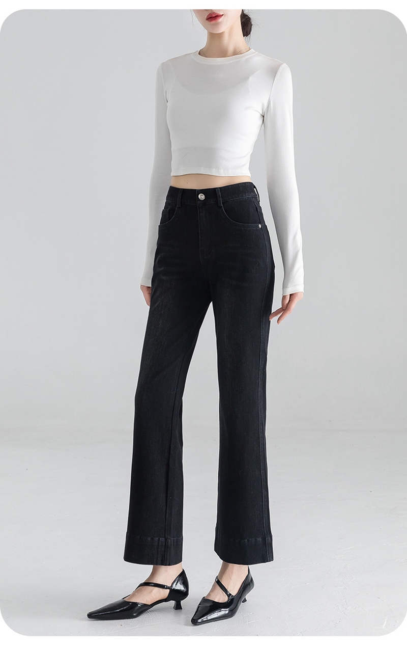 春夏时尚高腰拉链四面弹九分微喇牛仔裤