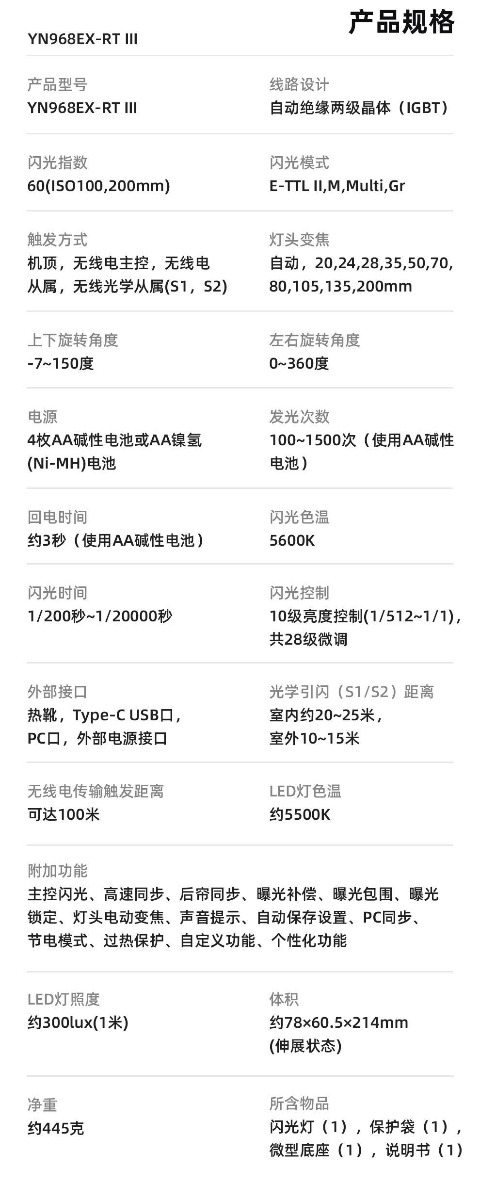 永诺 YN968EX-RT III 高速同步TTL闪光灯 支持RT无线电闪光系统