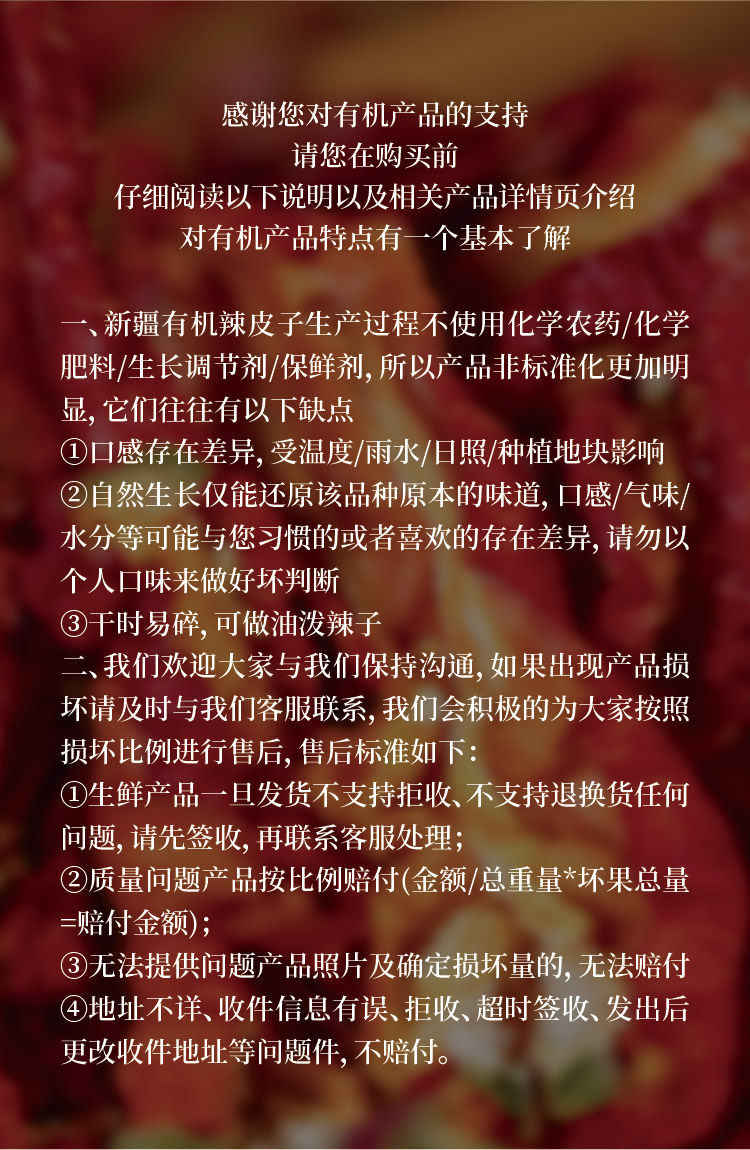【温馨提示】收到货后辣皮子有轻微破碎属于正常现象,介意者慎拍。请您收到货品后尽快开箱验货,如有破损请在24小时内反馈申请赔付,提交订单时请您仔细检查收件信息,因地址不清、电话错误导致的疑难件损失由买家自行承担