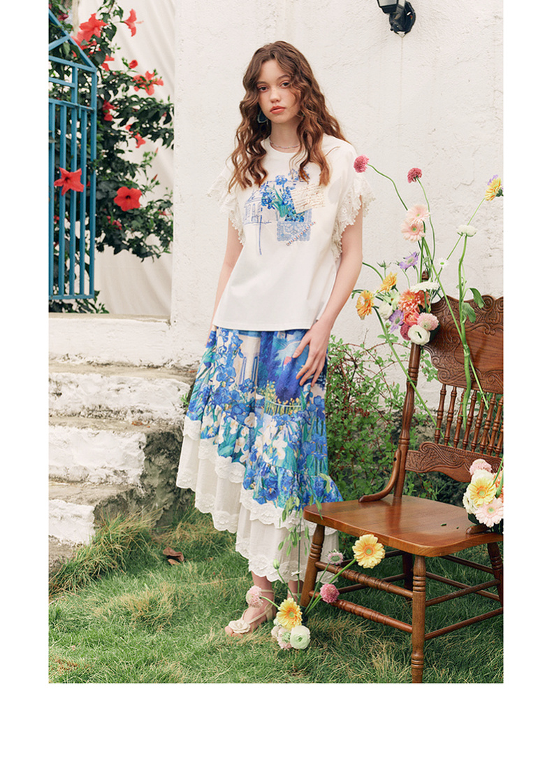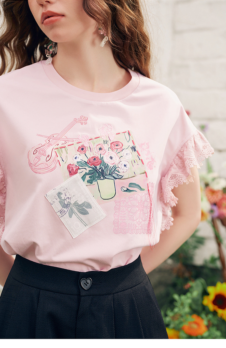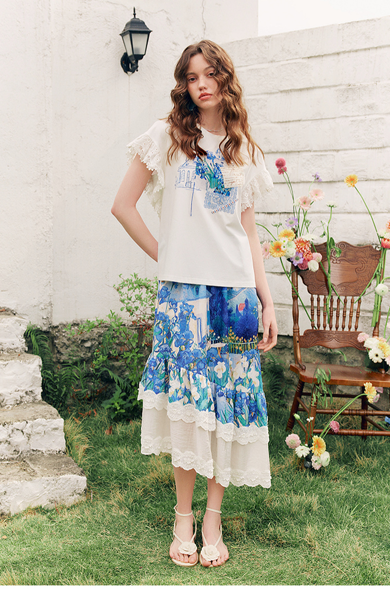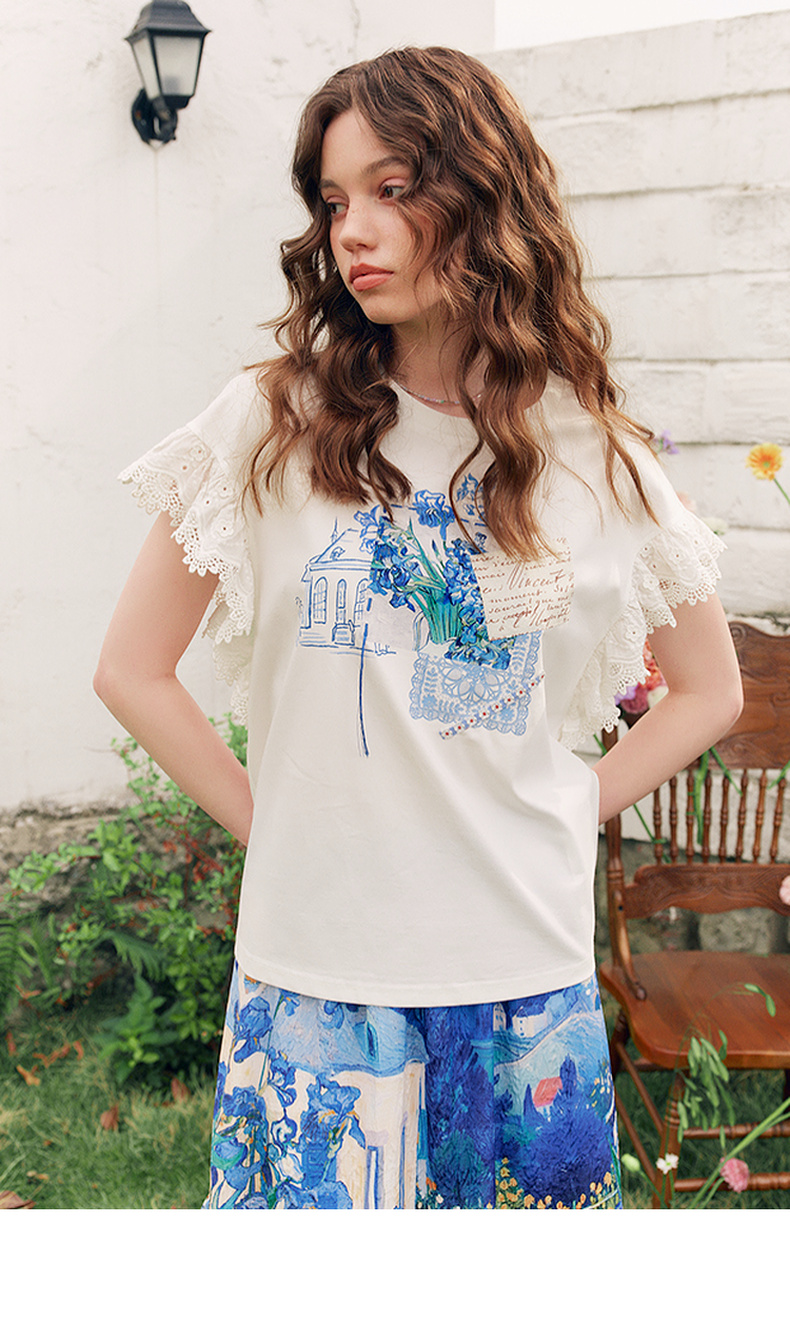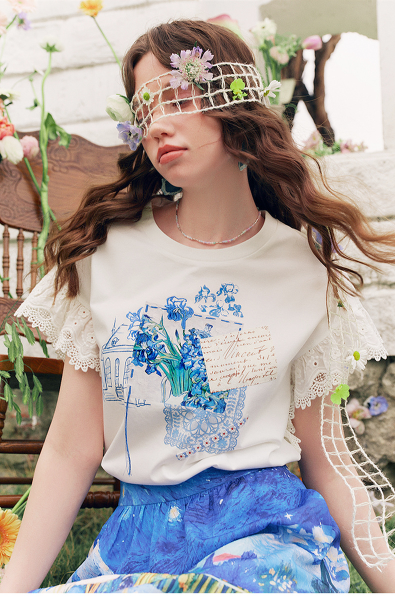 两三事梵高文艺南鸢絮语2025夏新款小清新印花蕾丝拼接短袖t恤女