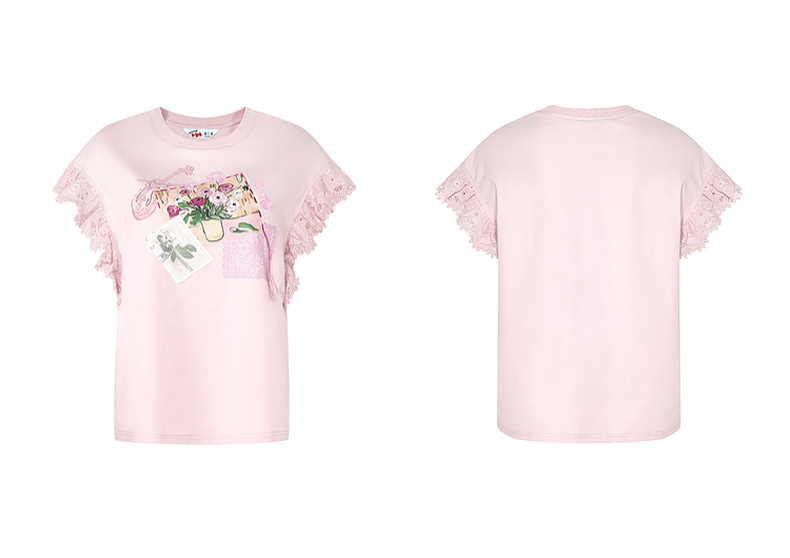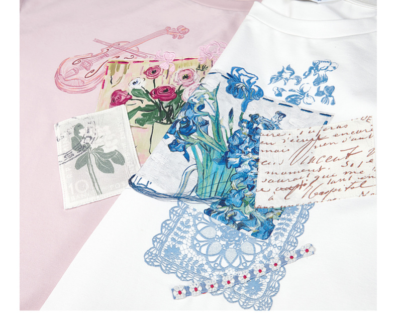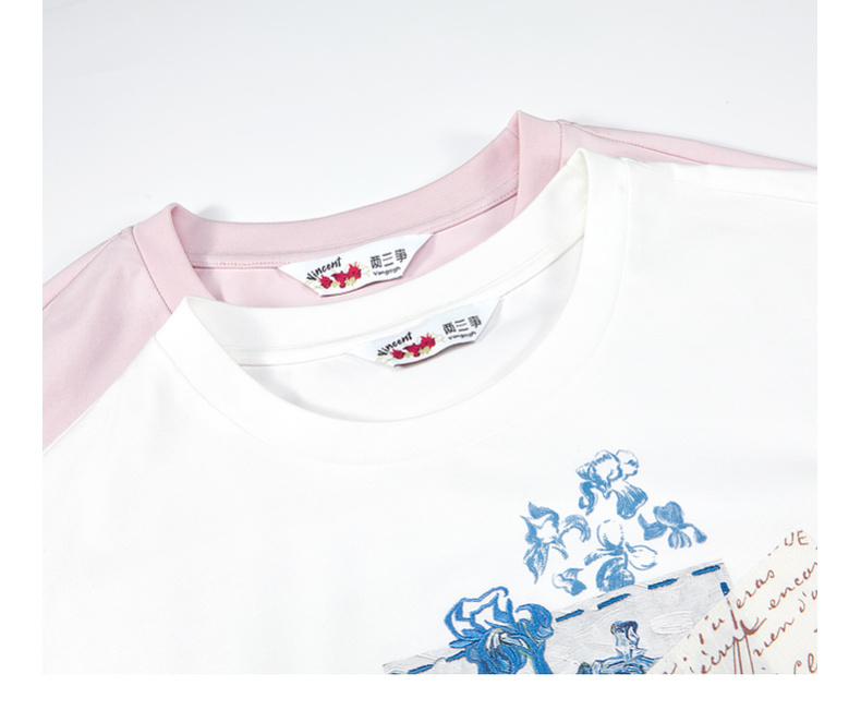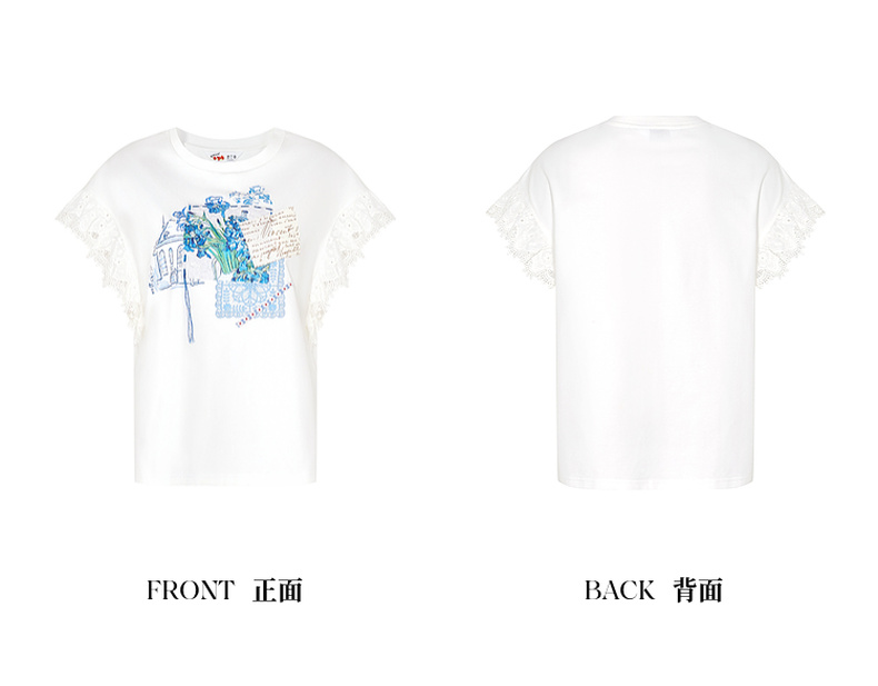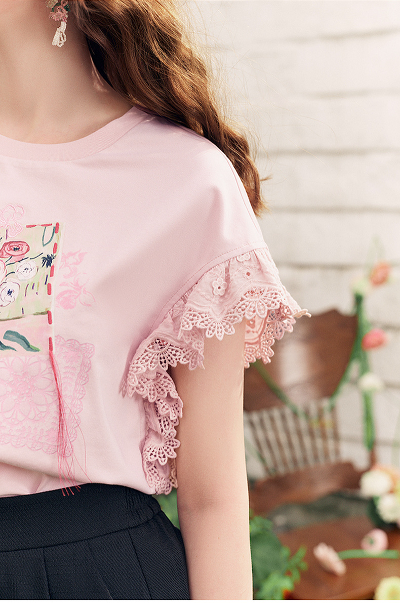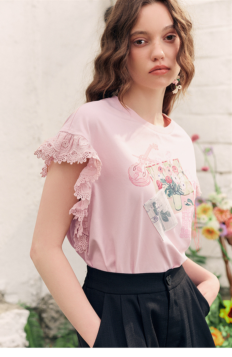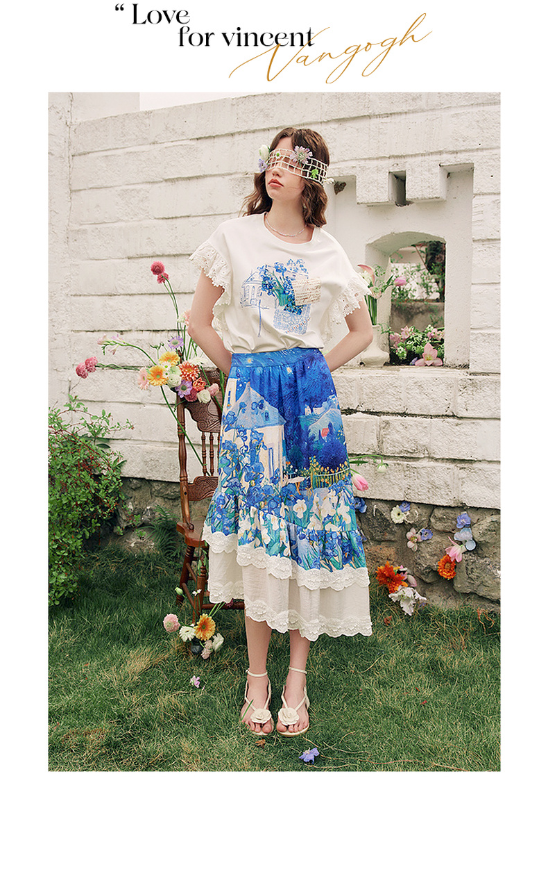 两三事梵高文艺南鸢絮语2025夏新款小清新印花蕾丝拼接短袖t恤女