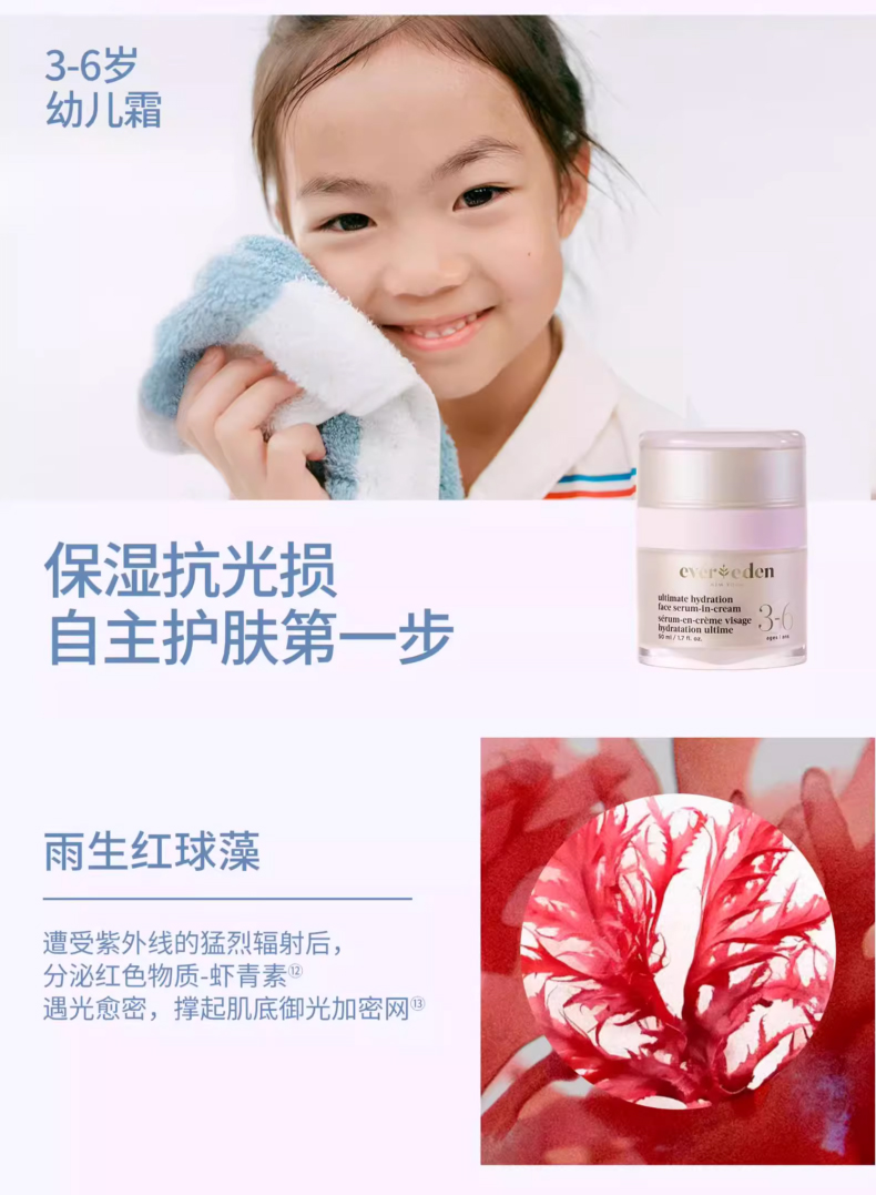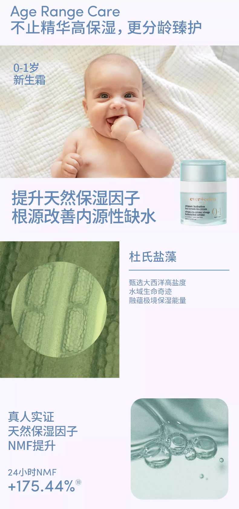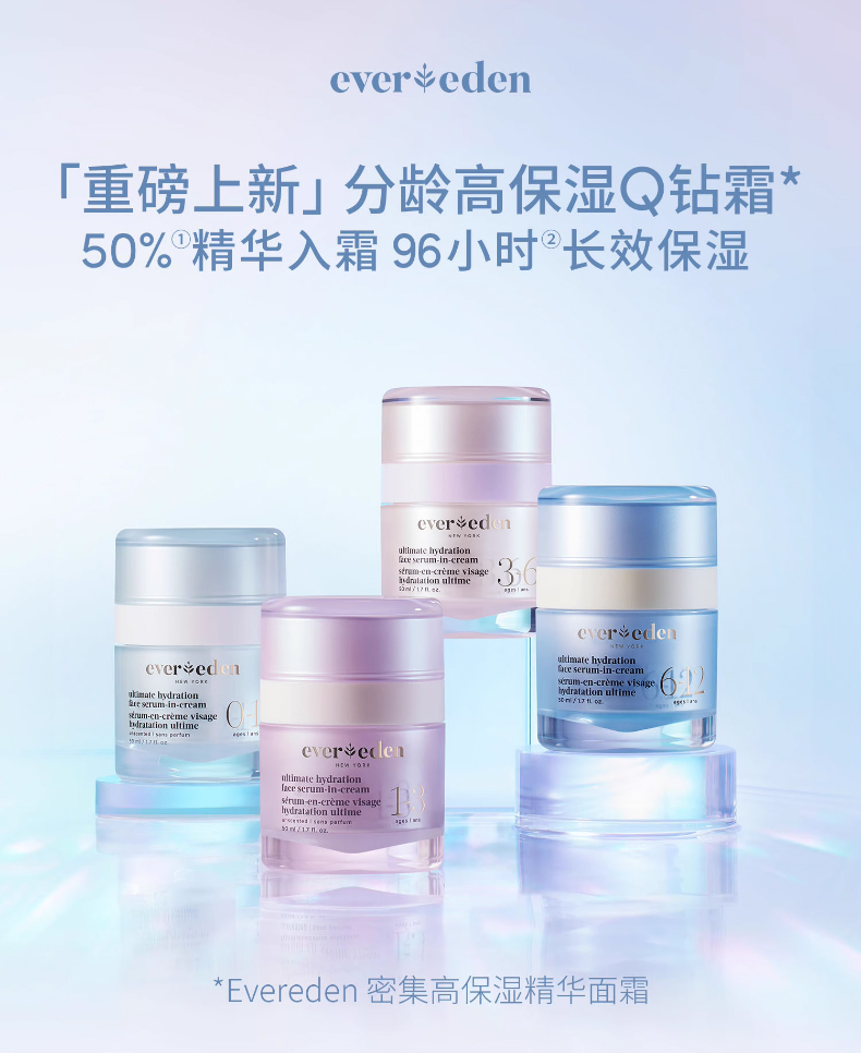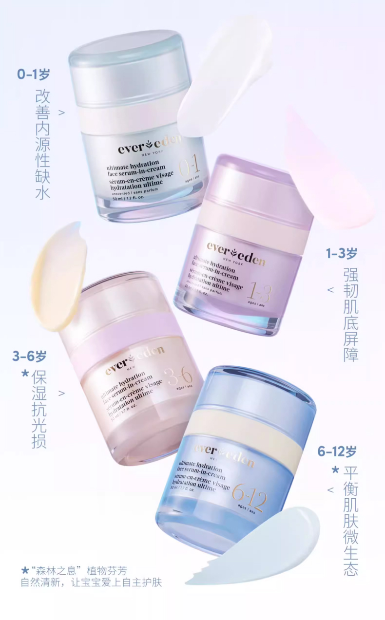 Evereden还采用了独家专研的 5-HydraDiamond Tech™ 保湿科技,它根据宝宝不同年龄段的皮肤需求,分别甄选了不同的极境彩钻藻成分,针对性地补充营养。