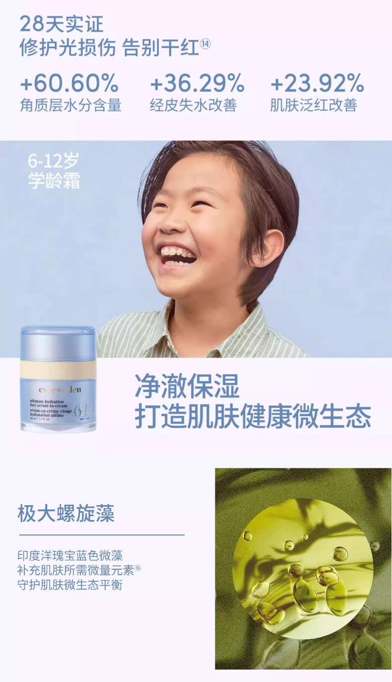 Evereden还是首个破译了肌肤保湿肌理的品牌,孩子沙漠肌、起皮、红肿问题经常反复发作,普通面霜只停留在表面,根本解决不了深层缺水的问题,这款面霜特别针对这些痛点,强效补水,渗透到皮肤深处,保湿效果肉眼可见。