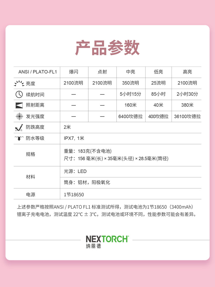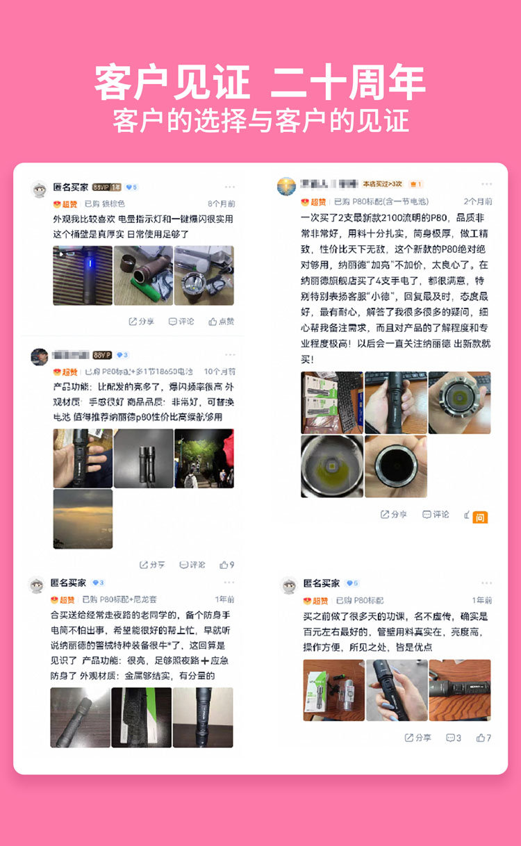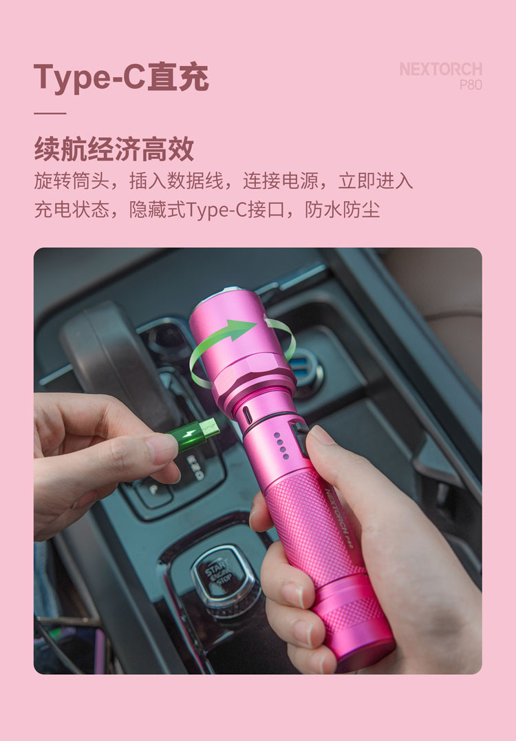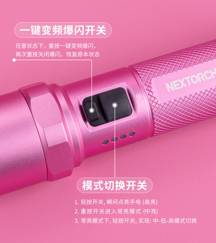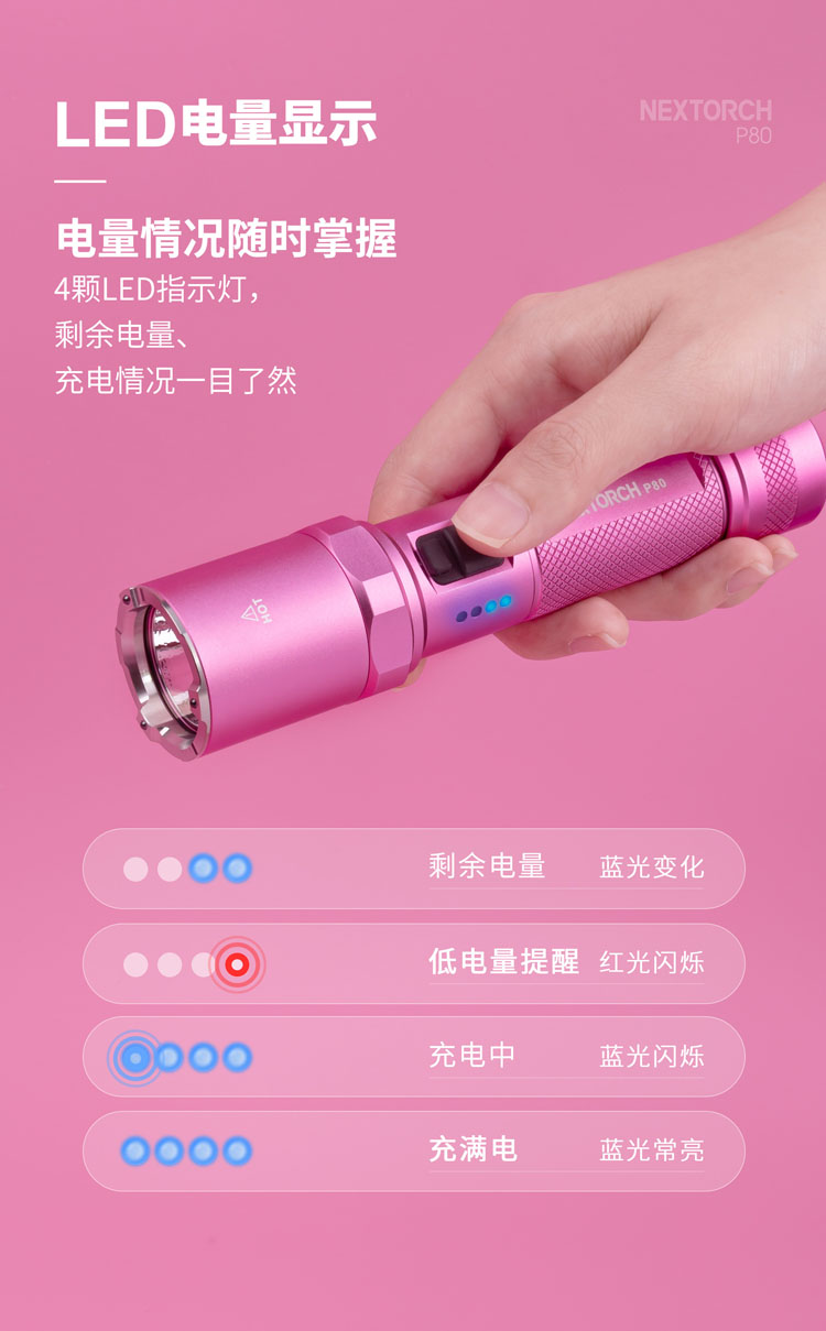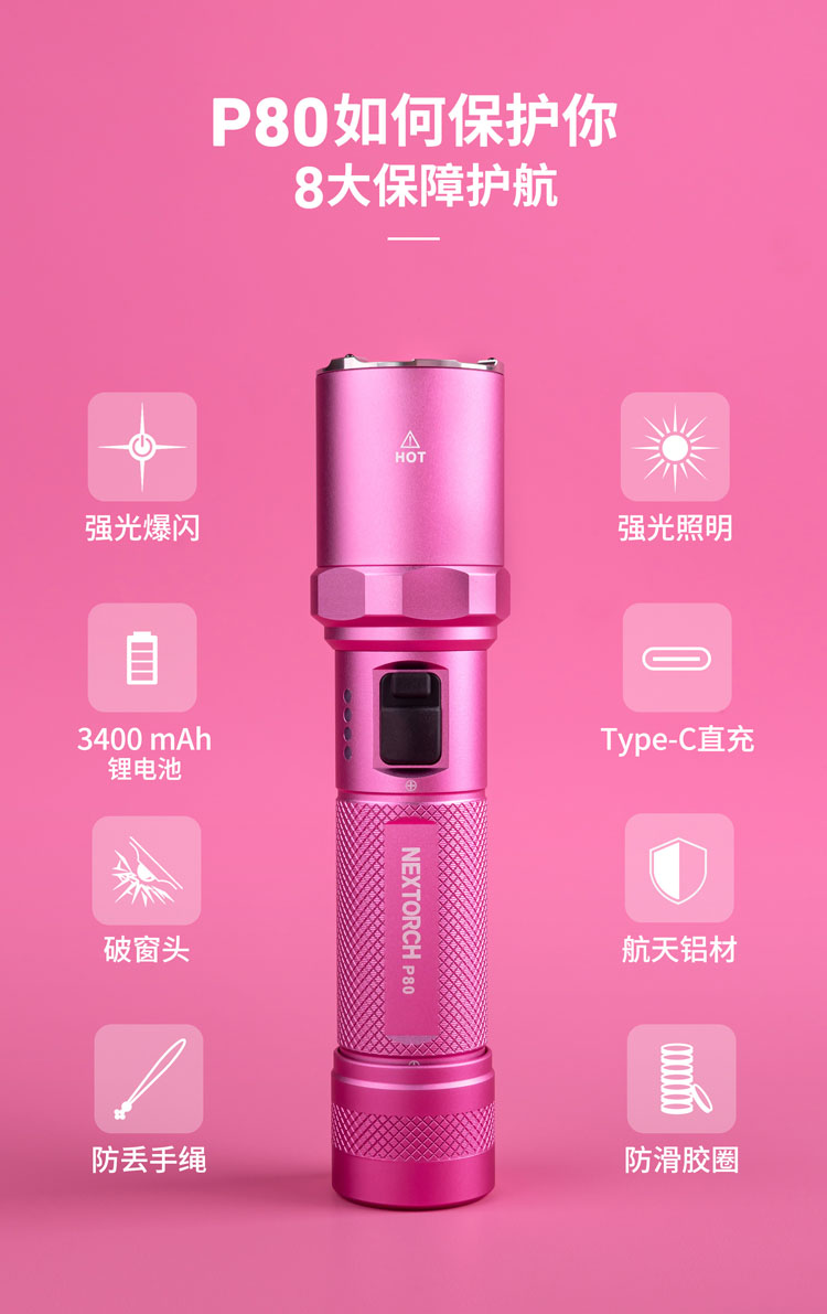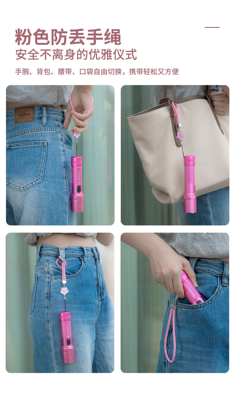 纳丽德【新品】P80粉色银色,防身强光手电2100流明,粉色P80赠粉色手绳,银色P80依然是黑色手绳