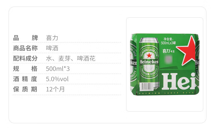喜力 啤酒 5度 500ml*3/提