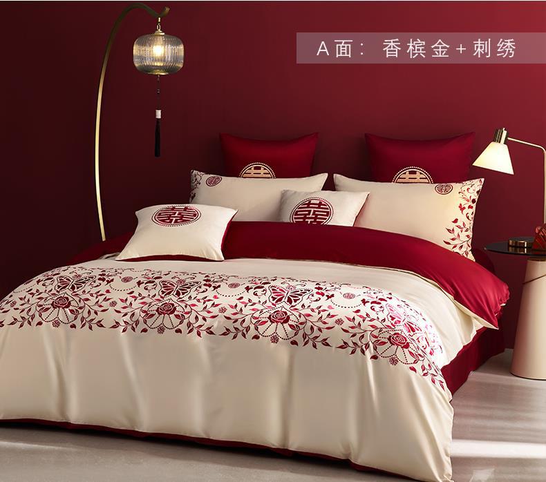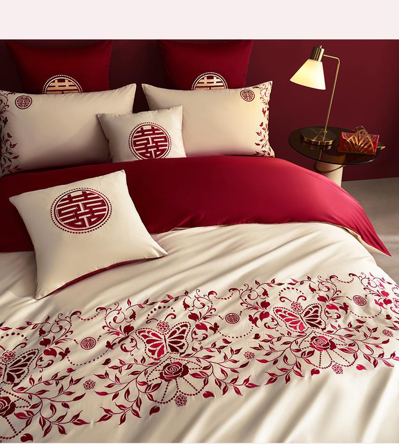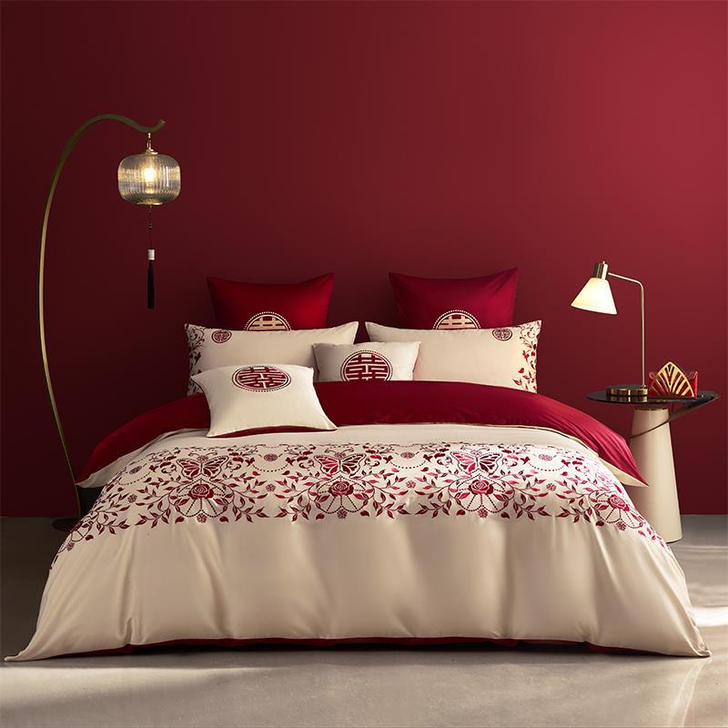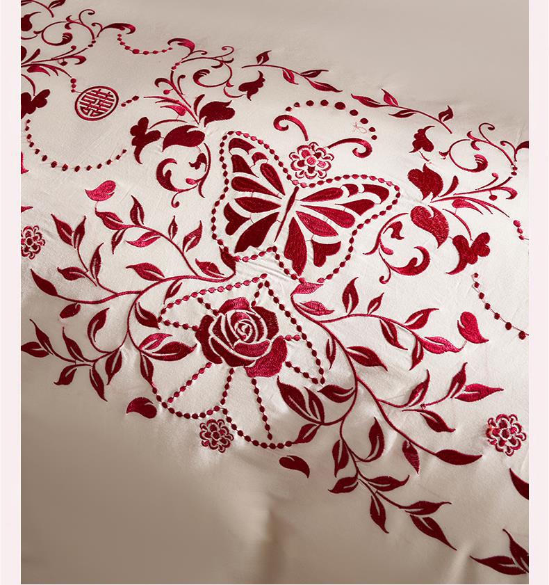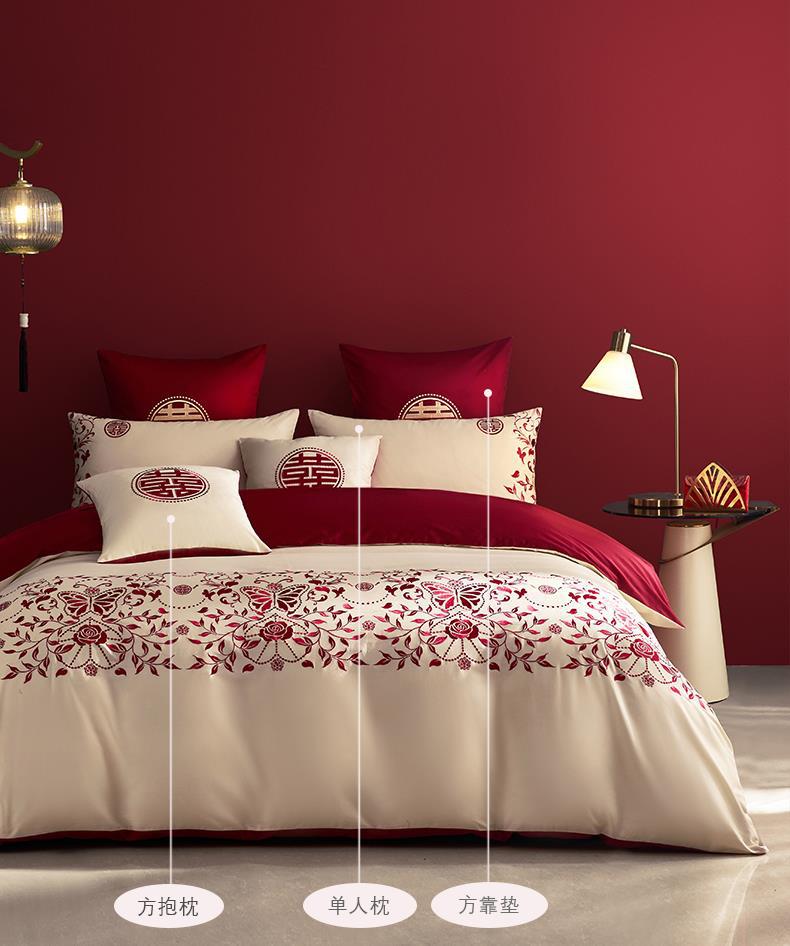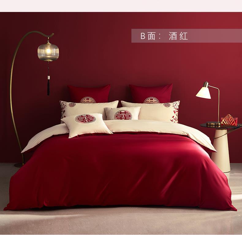 中式婚礼丨设计师力荐100s长绒棉刺绣工艺婚庆四件套酒红结婚 1.8米