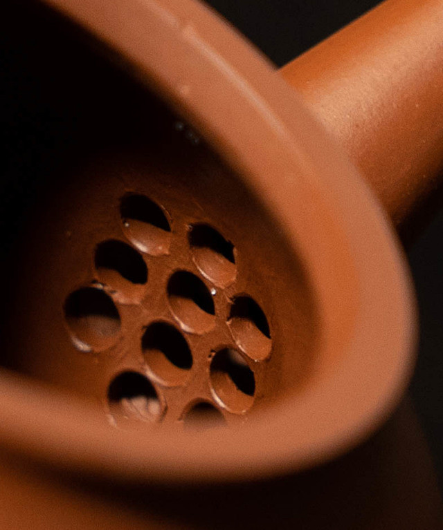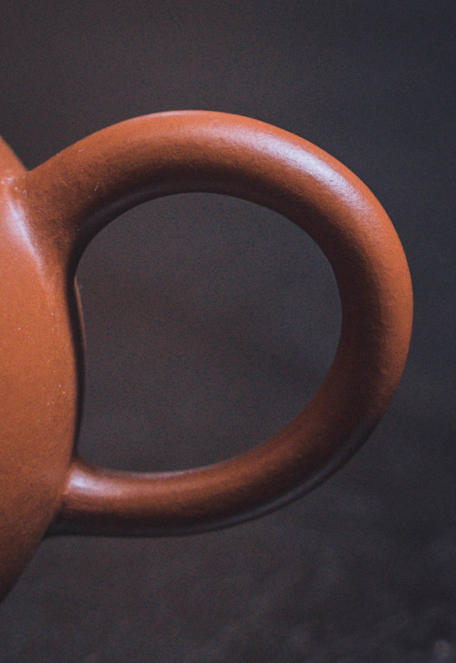 原矿朱泥是紫砂朱泥中的珍贵品种,因收缩比高和含浆量高的原因,高目数的矿土烧结之后会呈现皱纹,粗看壶的表面是平整的,但细看侧面却有许多微细紧密自然收缩的流淌纹理,这就是所谓的“无皱不朱”。