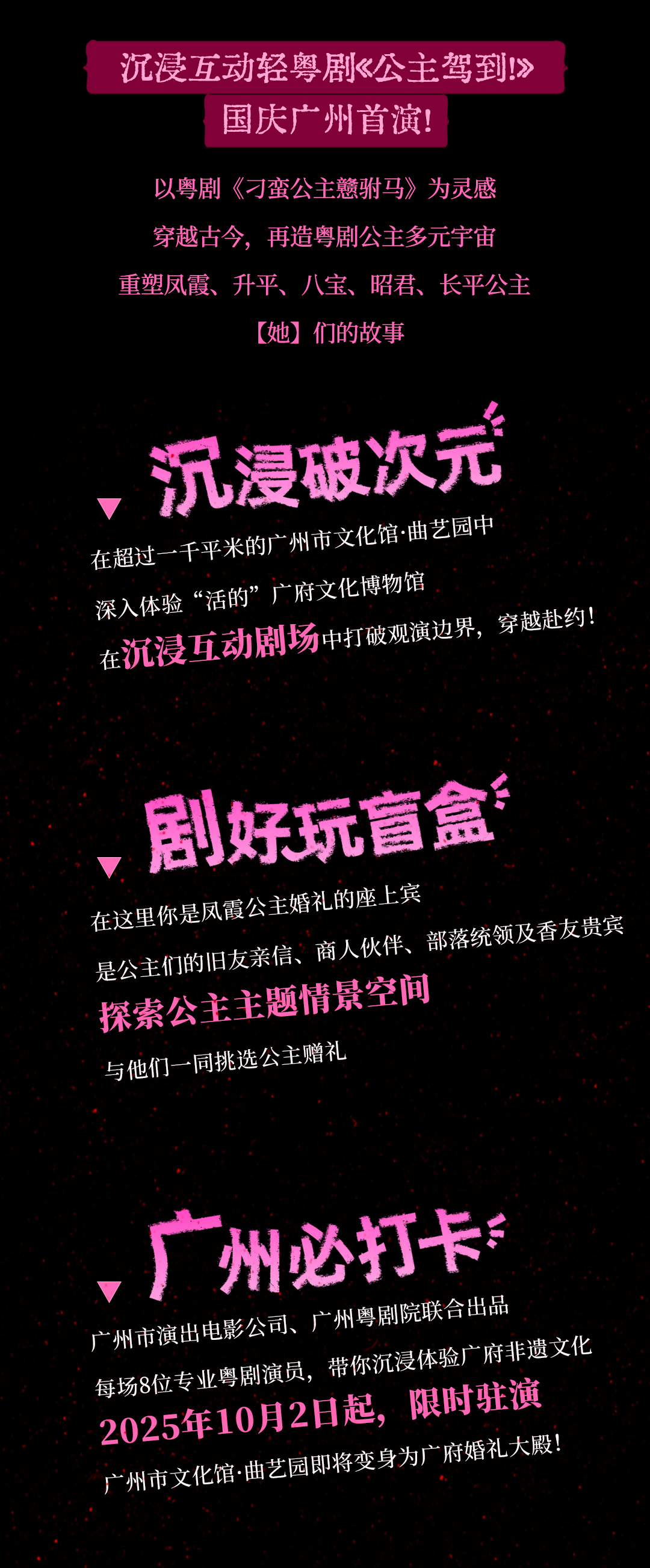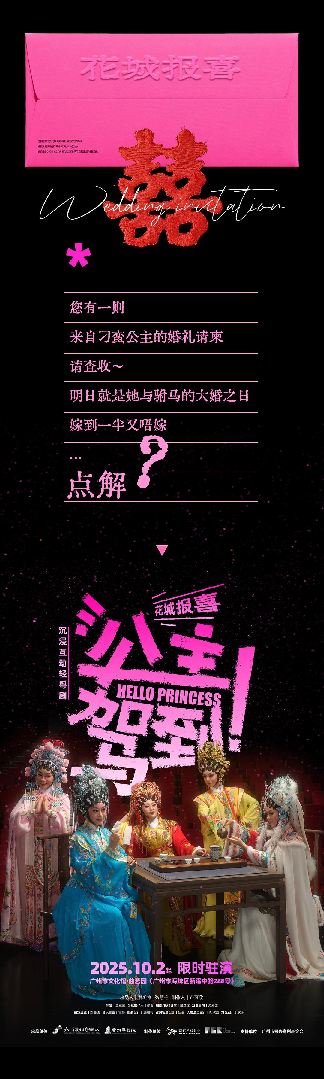 在超一千平方米的广州市文化馆曲艺园《公主驾到!》沉浸式剧场里,从建筑布景到道具细节,都渗透着广府婚嫁文化特色。观众不再是“旁观者”,而是“参与者”,在游园中赴约,在互动中推进剧情,彻底打破舞台边界。金枝席观众更可解锁“专属福利”,进一步探索五位公主的私密空间,挖掘隐藏剧情与独家互动,在“共赴婚宴为爱助攻”的戏剧体验中,感受广府文化的独特魅力。